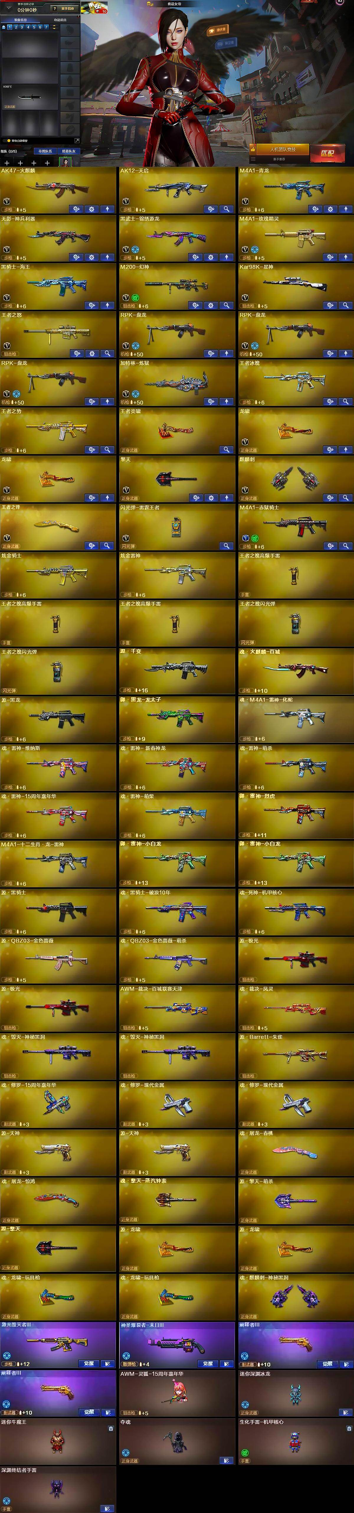 【英雄级武器】:AK47-火麒麟,AK12-天启,M4A1-青龙,无影-神兵利器,黑武士-锦绣游龙,M4A1-玫瑰精灵,黑骑士-海王,M200-幻神,Kar98K-星神,王者之怒-觉醒版,RPK-盘龙*3,加特林-炼狱,龙啸*2,擎天,麒麟刺,王者之锋-觉醒版,闪光弹-雷霆王者-觉醒版,M4A1-赤狱骑士
