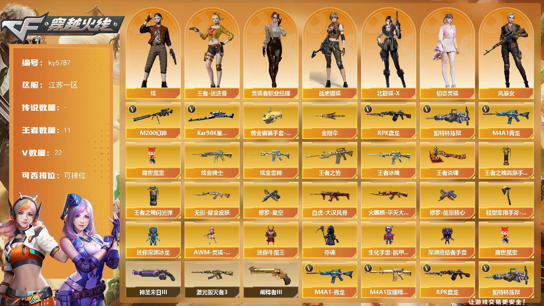 [16940370]江苏一区-25V-11王者武器数-2炫金武器数 【传说角色】:传说女帝 【热门武器】:M4A1-青龙,M200-幻神,Kar98K-星神,RPK-盘龙*3,加特林-炼狱,降世魔童,黄金猫猫手套-白鲨,金刚伞 【王者炫金武器】:王者冰魄,王者之势,王者炎啸,炫金骑士,炫金雷神,王者之魄高爆手雷*3,王者之魄闪光弹*2 【皮肤】:白虎-大汉风骨,火麒麟-平天大圣,无影耀金皮肤,修罗-能量核心,修罗-星空,轻型军用手斧-再燃火线 【角色】:炫,战地猎狐,王者-迷迭香,北极狐-X,初恋灵狐,风暴女,虎妞,嘉年华灵狐,灵狐者-黄金海岸,灵狐者-职业经理,萌儿,邱刚敖,斯沃特-X,游珑儿 【人偶武器】:AWM-灵狐-15周年嘉年华,迷你深渊冰龙,迷你牛魔王,夺魂,生化手雷-机甲核心,深渊终结者手雷,降世魔童 【挑战大师】:激光毁灭者III,神圣爆裂者-末日III,阐释者III*2 【英雄级武器】:AK47-火麒麟,AK12-天启,M4A1-青龙,无影-神兵利器,黑武士-锦绣游龙,M4A1-玫瑰精灵,黑骑士-海王,M200-幻神,Kar98K-星神,王者之怒-觉醒版,RPK-盘龙*3,加特林-炼狱,龙啸*2,擎天,麒麟刺,王者之锋-觉醒版,闪光弹-雷霆王者-觉醒版,M4A1-赤狱骑士 【道具】:BS战队炫彩背包,KZ战队炫彩背包,Q9战队炫彩背包,亚洲杯纪念炫彩背包,炫彩背包,老虎背包,背包-葫芦兄弟,女皇终结者-魔龙之吻,救世主-黑桃战神,黄金生化钩,绿色巨人,灵魂忍者,迷雾幽灵,夺命之镰,防化服*3,金色流光-枪王排位*2,星辰流光-枪王排位,枪王排位29赛季金色流光,炽雪表情,防弹头盔*5,防弹衣*4,C4工具钳*4,手雷包*5 【特殊枪械】:3盘龙,1炼狱