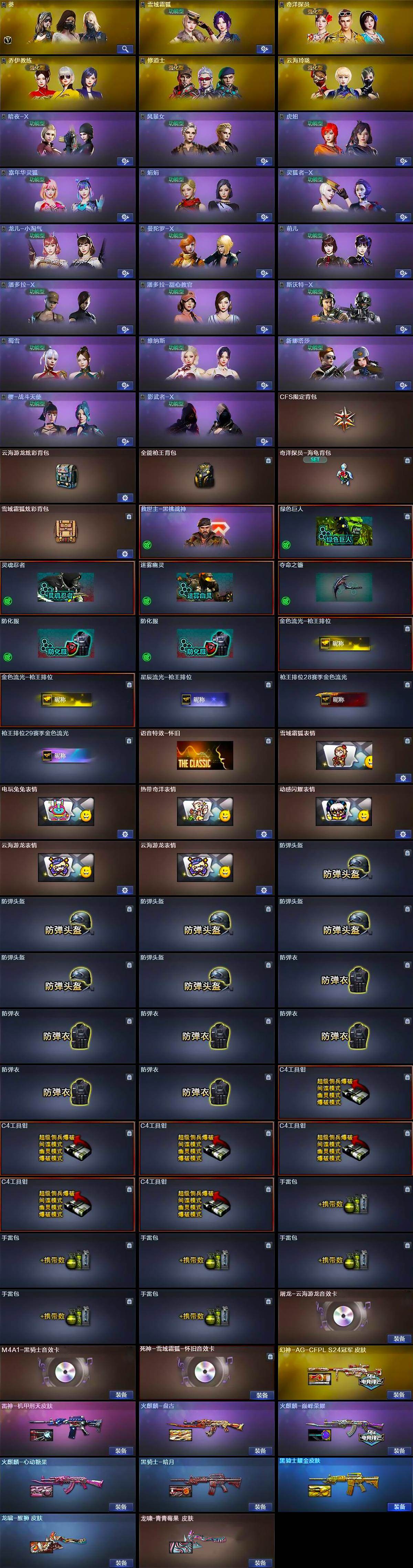 【道具】:CFS限定背包,云海游龙炫彩背包,全能枪王背包,奇洋探员-海龟背包,雪域霜狐炫彩背包,救世主-黑桃战神,绿色巨人,灵魂忍者,迷雾幽灵,夺命之镰,防化服*2,金色流光-枪王排位*2,星辰流光-枪王排位,枪王排位28赛季金色流光,枪王排位29赛季金色流光,语音特效-怀旧,雪域霜狐表情,电玩兔兔表情,热带奇洋表情,动感闪耀表情,云海游龙表情*2,防弹头盔*6,防弹衣*6,C4工具钳*6,手雷包*6
