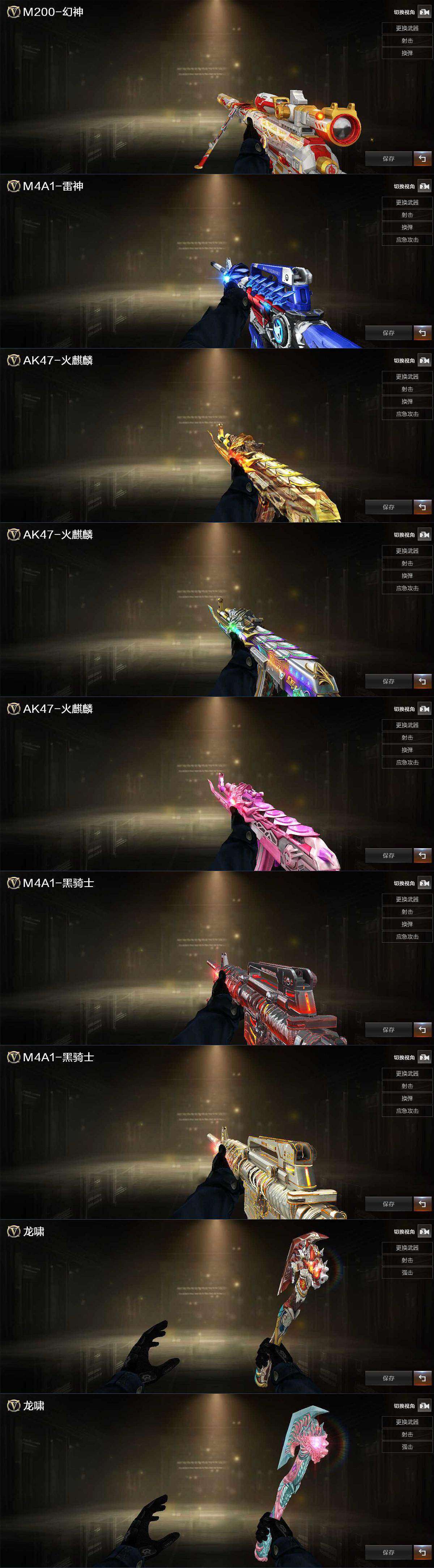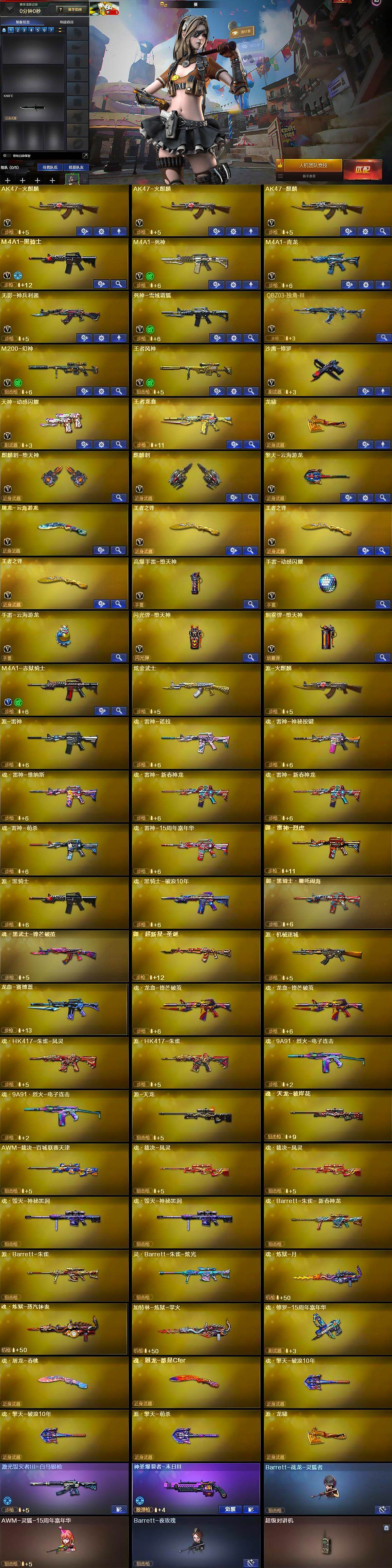【英雄级武器】:AK47-火麒麟*2,AK47-麒麟,M4A1-黑骑士,M4A1-死神,M4A1-青龙,无影-神兵利器,死神-雪域霜狐,QBZ03-独角-III,M200-幻神,王者风神-觉醒版,沙鹰-修罗,天神-动感闪耀,龙啸,麒麟刺-堕天神,麒麟刺,擎天-云海游龙,屠龙-云海游龙,王者之锋-觉醒版*3,高爆手雷-堕天神,手雷-动感闪耀,手雷-云海游龙,闪光弹-堕天神,烟雾弹-堕天神,M4A1-赤狱骑士