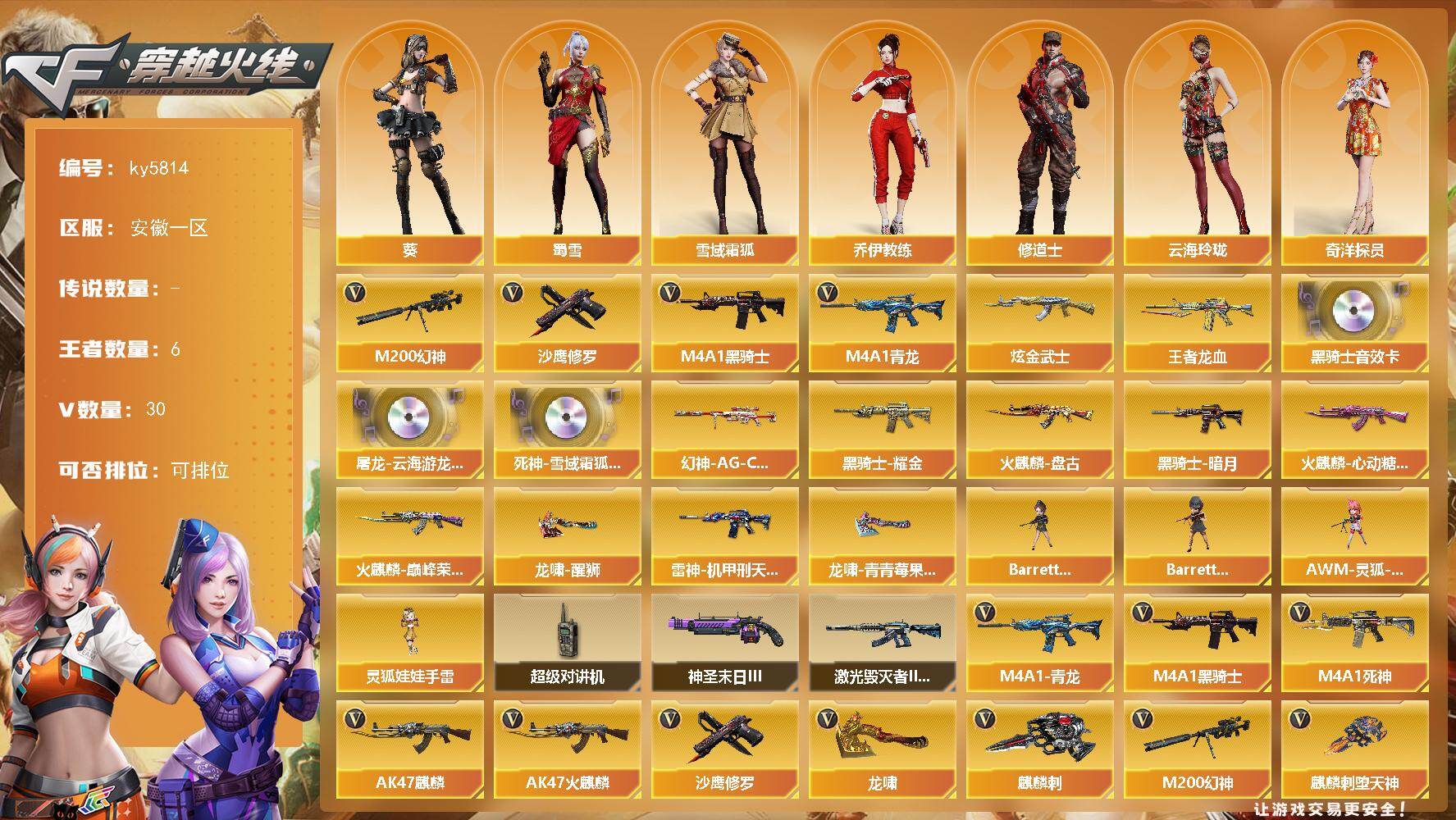 [16940482]安徽一区-36V-6王者武器数-1炫金武器数 【热门武器】:M4A1-青龙,M200-幻神,M4A1-黑骑士,沙鹰-修罗 【王者炫金武器】:王者龙血,炫金武士 【音效卡】:屠龙-云海游龙音效卡,M4A1-黑骑士音效卡,死神-雪域霜狐-怀旧音效卡 【皮肤】:幻神-AG-CFPL S24冠军 皮肤,雷神-机甲刑天皮肤,火麒麟-盘古,火麒麟-巅峰荣耀,火麒麟-心动糖果,黑骑士-暗月,黑骑士耀金皮肤,龙啸-醒狮 皮肤,龙啸-青青莓果 皮肤 【角色】:葵,雪域霜狐,奇洋探员,乔伊教练,修道士,云海玲珑,暗夜-X,风暴女,虎妞,嘉年华灵狐,娟娟,0号玩家,灵狐者-X,龙儿-小淘气,曼陀罗-X,萌儿,潘多拉-X,潘多拉-甜心教官,斯沃特-X,蜀雪,维纳斯,新娜塔莎,樱-战斗天使,影武者-X 【人偶武器】:Barrett-战龙-灵狐者,AWM-灵狐-15周年嘉年华,Barrett-夜玫瑰,灵狐娃娃手雷 【暴走生化】:超级对讲机 【挑战大师】:激光毁灭者III-白马银枪,神圣爆裂者-末日III 【英雄级武器】:AK47-火麒麟*2,AK47-麒麟,M4A1-黑骑士,M4A1-死神,M4A1-青龙,无影-神兵利器,死神-雪域霜狐,QBZ03-独角-III,M200-幻神,王者风神-觉醒版,沙鹰-修罗,天神-动感闪耀,龙啸,麒麟刺-堕天神,麒麟刺,擎天-云海游龙,屠龙-云海游龙,王者之锋-觉醒版*3,高爆手雷-堕天神,手雷-动感闪耀,手雷-云海游龙,闪光弹-堕天神,烟雾弹-堕天神,M4A1-赤狱骑士 【道具】:CFS限定背包,云海游龙炫彩背包,全能枪王背包,奇洋探员-海龟背包,雪域霜狐炫彩背包,救世主-黑桃战神,绿色巨人,灵魂忍者,迷雾幽灵,夺命之镰,防化服*2,金色流光-枪王排位*2,星辰流光-枪王排位,枪王排位28赛季金色流光,枪王排位29赛季金色流光,语音特效-怀旧,雪域霜狐表情,电玩兔兔表情,热带奇洋表情,动感闪耀表情,云海游龙表情*2,防弹头盔*6,防弹衣*6,C4工具钳*6,手雷包*6 【特殊枪械】:1黑骑士