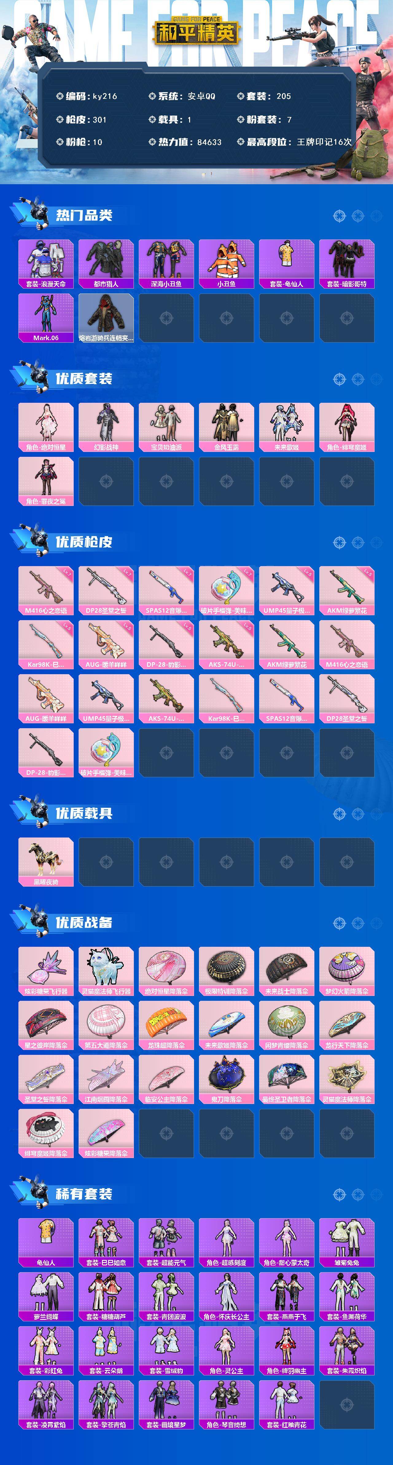[16940877]安卓 手Q-7粉装-10特效枪-1载具-2粉色飞行器-84633热力值-16王牌印记-205套装-301枪皮 【热门品类】:套装-浪漫天命,套装-都市猎人,套装-深海小丑鱼,套装-小丑鱼,套装-龟仙人,套装-暗影哥特,角色-Mark.06,熔岩游骑兵连帽夹克 【粉色套装】:角色-绝对恒星,粉装-幻影战神,粉装-宝贝奶油派,粉装-金风玉露,粉装-未来歌姬,角色-绯穹魔姬,角色-罪夜之冕 【粉色枪皮等级】:AKM-绿萝繁花(五级),M416-心之恋语(七级),AUG-暖羊咩咩(五级),UMP45-量子极限(五级),AKS-74U-森灵之息(五级),Kar98K-巳巳如意(五级),SPAS-12-音爆索尼克(七级),DP-28-圣堂之誓(七级),DP-28-豹影疾电(五级),破片手榴弹-美味星星糖(七级) 【粉色载具】:黑曜夜骑 【粉色枪皮】:AKM-绿萝繁花,M416-心之恋语,AUG-暖羊咩咩,UMP45-量子极限,AKS-74U-森灵之息,Kar98K-巳巳如意,SPAS-12-音爆索尼克,DP-28-圣堂之誓,DP-28-豹影疾电,破片手榴弹-美味星星糖 【粉色飞行器】:炫彩糖果飞行器,灵猫魔法师飞行器 【粉色降落伞】:绝对恒星降落伞,极限特训降落伞,未来战士降落伞,梦幻火箭降落伞,星之彼岸降落伞,第五大道降落伞,龙珠超降落伞,未来歌姬降落伞,闲梦青缨降落伞,龙行天下降落伞,圣堂之誓降落伞,江南烟雨降落伞,临安公主降落伞,鬼刀降落伞,最终圣卫者降落伞,灵猫魔法师降落伞,绯穹魔姬降落伞,炫彩糖果降落伞 【稀有套装】:套装-龟仙人,套装-巳巳如意,套装-超能元气,角色-超感刻度,角色-甜心蒙太奇,套装-雪国风尚,套装-炫彩糖果,套装-雏菊兔兔,套装-萝兰蝴蝶,套装-糖糖葫芦,套装-青团波波,角色-怀庆长公主,套装-燕燕于飞,套装-鱼渊荷华,套装-彩虹兔,套装-云朵鹅,套装-雪绒豹,角色-灵公主,角色-绛羽幽主,套装-朱霞炽焰,套装-凌霄紫焰,套装-擎苍青焰,套装-画境星梦,套装-琴音绮想,套装-红釉青花 【稀有枪皮】:AUG-冰晶雪宝,AKM-彩虹符号,AKM-影袭,AKM-星之彼岸,AKM-灼热熔岩,AKM-破晓战魂,AKM-萌趣颜团子,AKM-霓虹街区,AKM-龙的传人,AKM-灵猫魔法师,M16A4-凝视深渊,M16A4-幻世战舞者,M16A4-甜心亚梦,M1