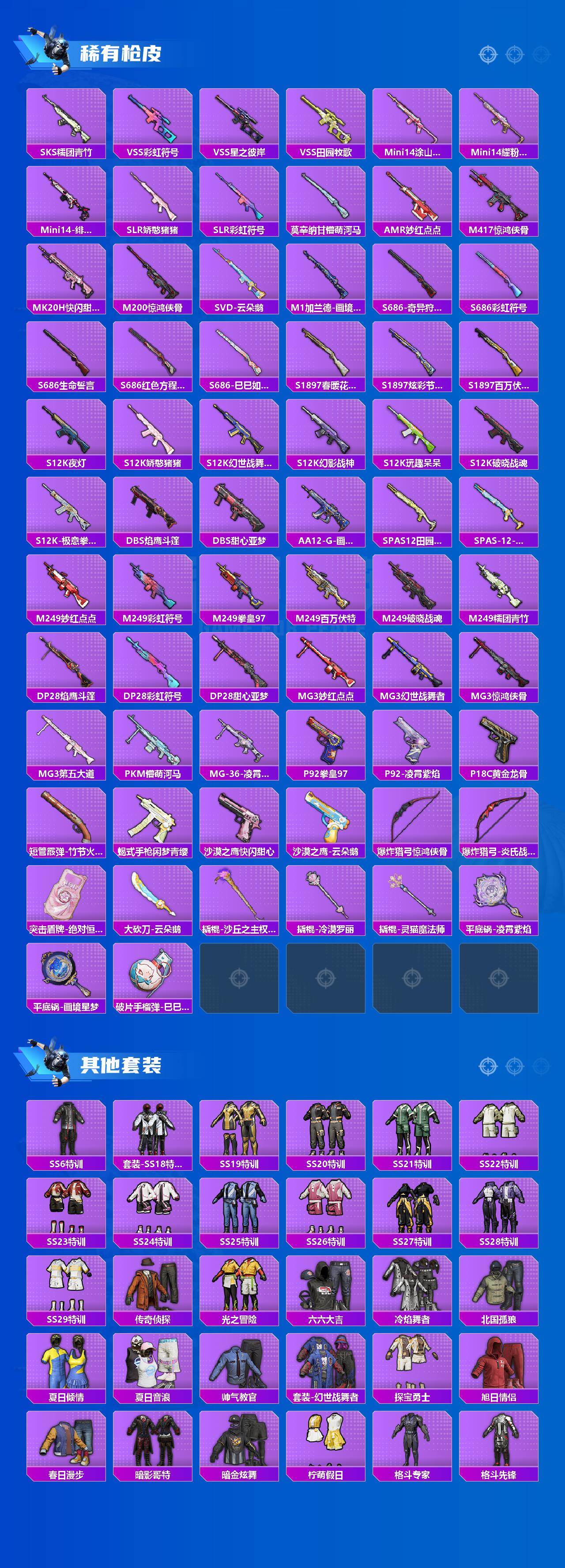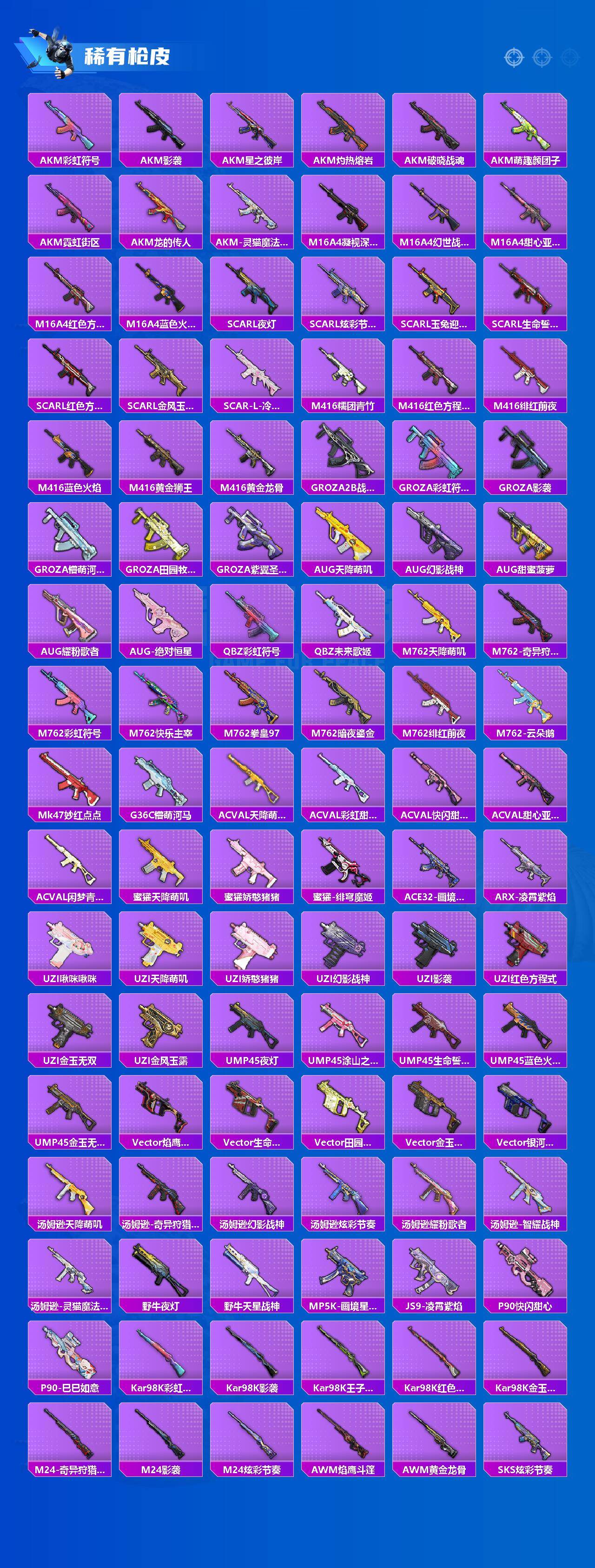 【稀有枪皮】:AUG-冰晶雪宝,AKM-彩虹符号,AKM-影袭,AKM-星之彼岸,AKM-灼热熔岩,AKM-破晓战魂,AKM-萌趣颜团子,AKM-霓虹街区,AKM-龙的传人,AKM-灵猫魔法师,M16A4-凝视深渊,M16A4-幻世战舞者,M16A4-甜心亚梦,M1