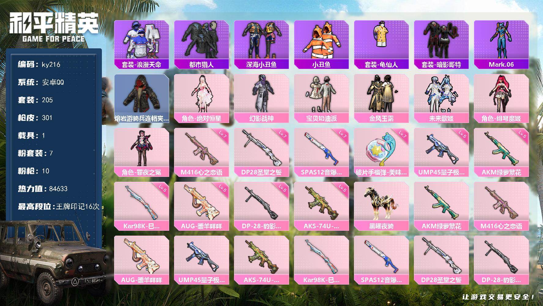 [16940877]安卓 手Q-7粉装-10特效枪-1载具-2粉色飞行器-84633热力值-16王牌印记-205套装-301枪皮