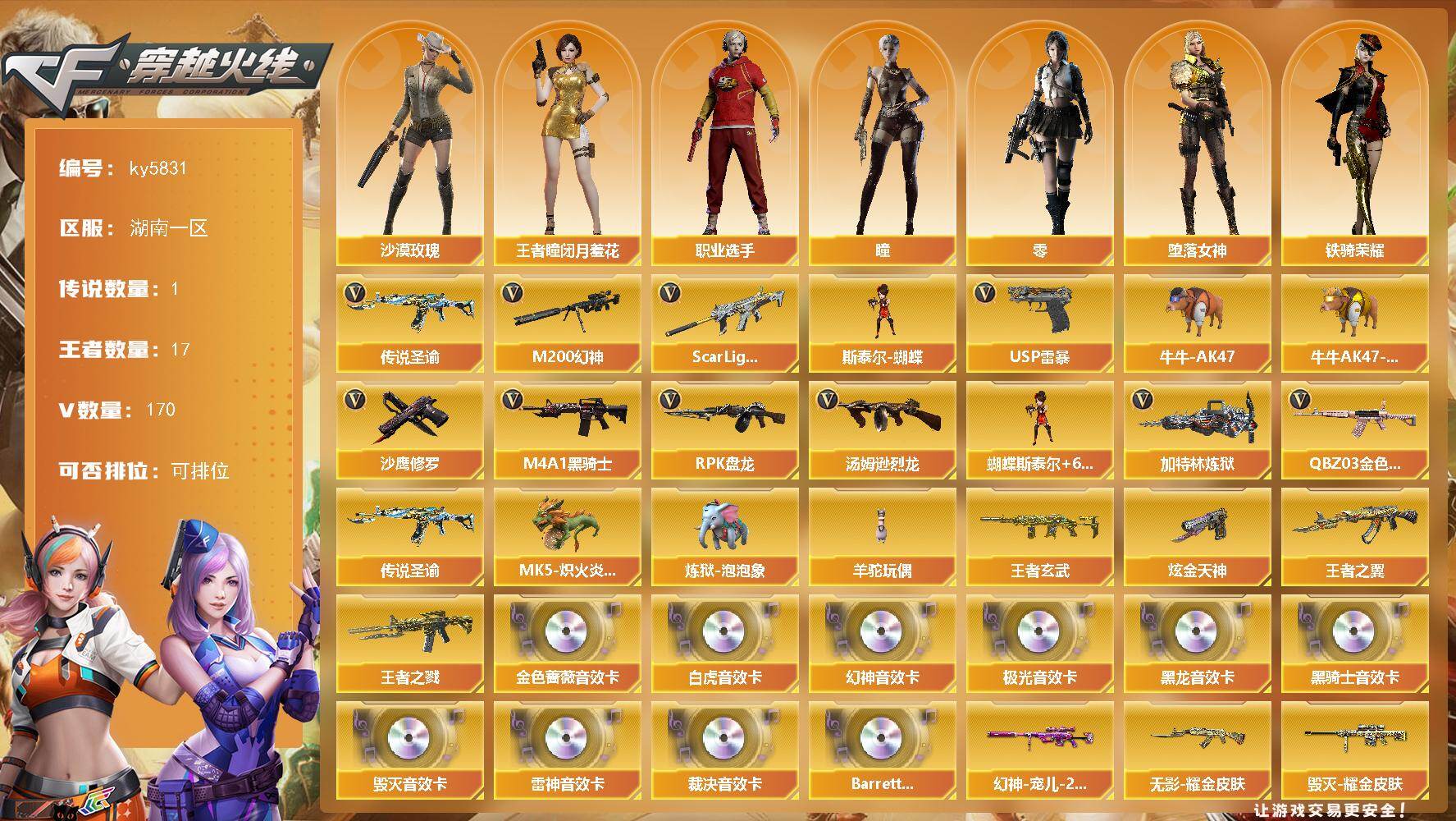 [16941026]湖南一区-184V-17王者武器数-1炫金武器数 【传说武器】:传说圣谕 【传说角色】:传说星骇 【热门武器】:传说圣谕,QBZ03-金色蔷薇,Scar Light-白虎,M200-幻神,牛牛-AK47,牛牛AK47-贵族金,M4A1-黑骑士*2,汤姆逊-烈龙*7,RPK-盘龙*6,加特林-炼狱*2,斯泰尔-蝴蝶,MK5-炽火炎龙,炼狱-泡泡象,羊驼玩偶*2,USP-雷暴,沙鹰-修罗*2 【王者炫金武器】:王者之戮,王者之翼,王者玄武,炫金天神 【音效卡】:M200-幻神音效卡,M4A1-雷神音效卡,M4A1-黑龙音效卡,M4A1-黑骑士音效卡,Barrett-毁灭音效卡,Barrett-极光音效卡,QBZ03-金色蔷薇音效卡,AWM-裁决音效卡,Scar Light-白虎音效卡,Barrett-碧霄极光音效卡 【皮肤】:幻神-宠儿-2021MVP,M200-幻神-荣耀世冠白鲨,白虎-霓虹机甲 皮肤,AWM-裁决-凤灵皮肤,雷神-暗月,雷神-虎将,雷神-传奇N9,火麒麟-战神关羽,火麒麟-心动糖果,牛牛AK47-贵族金,毁灭耀金皮肤,毁灭-虹光风暴 皮肤,黑骑士-战神马超,无影-能量核心,无影耀金皮肤,天龙-秘银,炼狱-泡泡象 【角色】:零,瞳,沙漠玫瑰,谜,玄豹,荆棘,战地猎狐,王者-瞳-闭月羞花,堕落女神,奇洋探员,乔伊教练,飞虎队-X,风暴女,娟娟,兰-空鹰,麻雀,曼陀罗-X,潘多拉-X,斯沃特-X,铁骑荣耀,兔囡囡,新娜塔莎,游珑儿,职业选手 【人偶武器】:MK5-炽火炎龙,异变清道夫-蛇影双骄,斯泰尔-蝴蝶,MAC-10-千针棘鲨,跳跳鲨,AWM-灵狐-15周年嘉年华,牛牛-AK47,迷你牛魔王,迷你牛牛,迷你生化手雷*3,生化手雷-机甲核心*4 【暴走生化】:超级对讲机 【挑战大师】:神圣爆裂者III*2,冰龙粉碎者-白马银枪,激光毁灭者III*4,KAC-圣炎切割者III,神圣爆裂者-末日III 【英雄级武器】:AK47-火麒麟*3,M4A1-黑龙,M4A1-雷神*3,M4A1-黑骑士*2,AK47-无影,M4A1-死神*5,AN94-超新星*2,M4A1-龙血,Scar Light-白虎,QBZ03-云龙,黑武士-锦绣游龙,超新星-热带奇洋,FAMAS G2-天戎,SCAR Light-玄豹,QBZ03-金色蔷薇,M4A1-猎神*2,烈火-动感闪耀