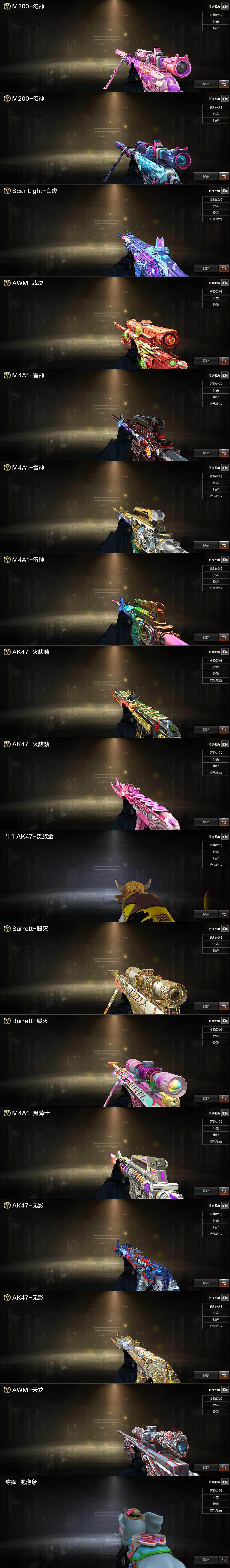【音效卡】:M200-幻神音效卡,M4A1-雷神音效卡,M4A1-黑龙音效卡,M4A1-黑骑士音效卡,Barrett-毁灭音效卡,Barrett-极光音效卡,QBZ03-金色蔷薇音效卡,AWM-裁决音效卡,Scar Light-白虎音效卡,Barrett-碧霄极光音效卡