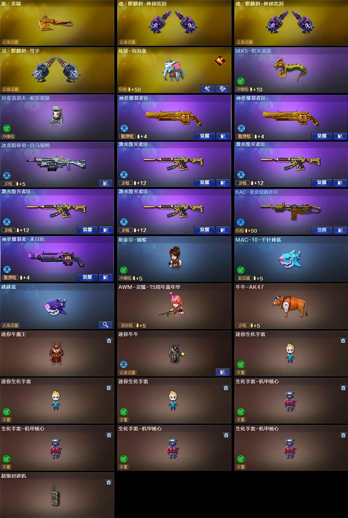 【人偶武器】:MK5-炽火炎龙,异变清道夫-蛇影双骄,斯泰尔-蝴蝶,MAC-10-千针棘鲨,跳跳鲨,AWM-灵狐-15周年嘉年华,牛牛-AK47,迷你牛魔王,迷你牛牛,迷你生化手雷*3,生化手雷-机甲核心*4