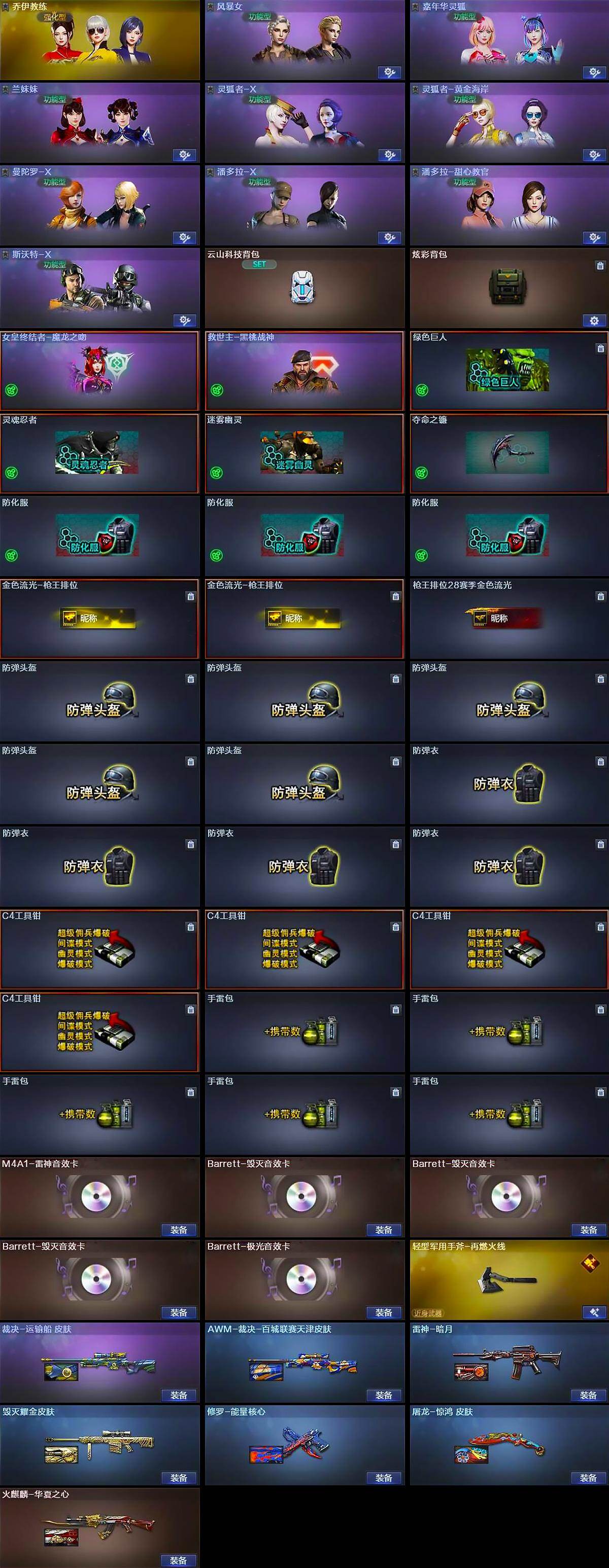 【道具】:云山科技背包,炫彩背包,女皇终结者-魔龙之吻,救世主-黑桃战神,绿色巨人,灵魂忍者,迷雾幽灵,夺命之镰,防化服*3,金色流光-枪王排位*2,枪王排位28赛季金色流光,防弹头盔*5,防弹衣*4,C4工具钳*4,手雷包*5