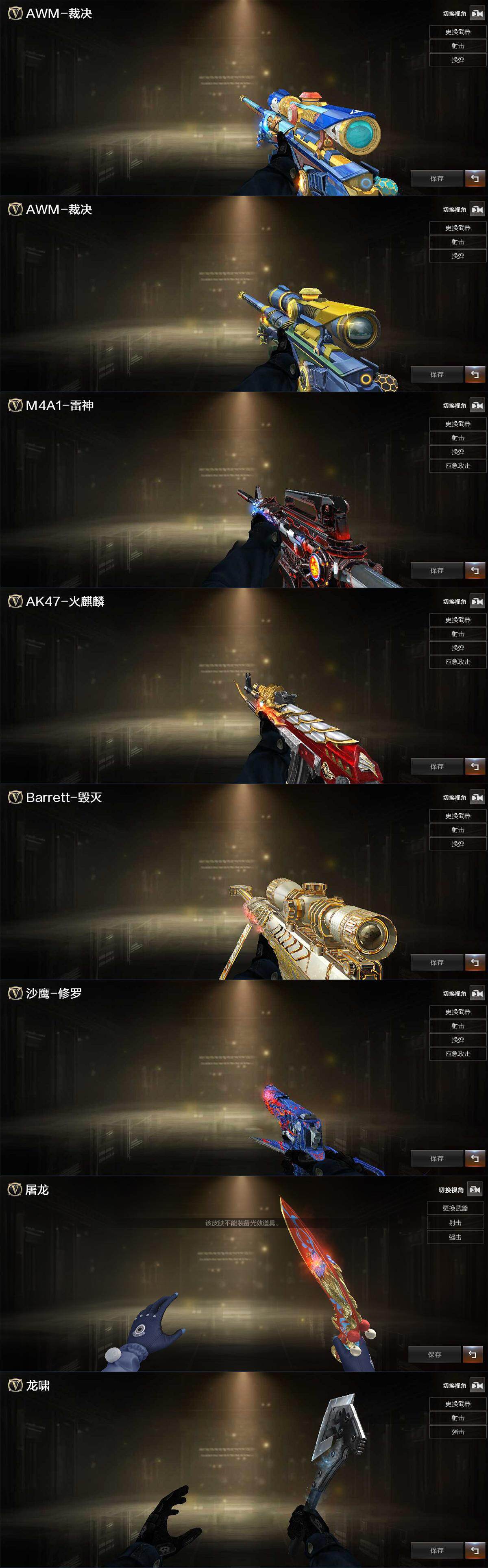 【英雄级武器】:AK47-火麒麟,M4A1-雷神,AK47-黑武士,AK12-天启*4,M4A1-武圣,HK417-朱雀,无影-神兵利器,黑武士-锦绣游龙,QBZ03-金色蔷薇,M4A1-猎神,AK-47-猩红传说,AK47-B-战神,AWM-天龙,Barrett-毁灭,AWM-裁决,Kar98K-星神,王者之怒-觉醒版,加特林-炼狱*2,汤姆逊-烈龙*3,AA-12-雷霆*3,沙鹰-修罗*2,屠龙*5,麒麟刺*2,麒麟刺-百战金芒,丛林匕首-玄豹,高爆手雷-玄豹*2,闪光弹-玄豹,烟雾弹-玄豹,M4A1-赤狱骑士