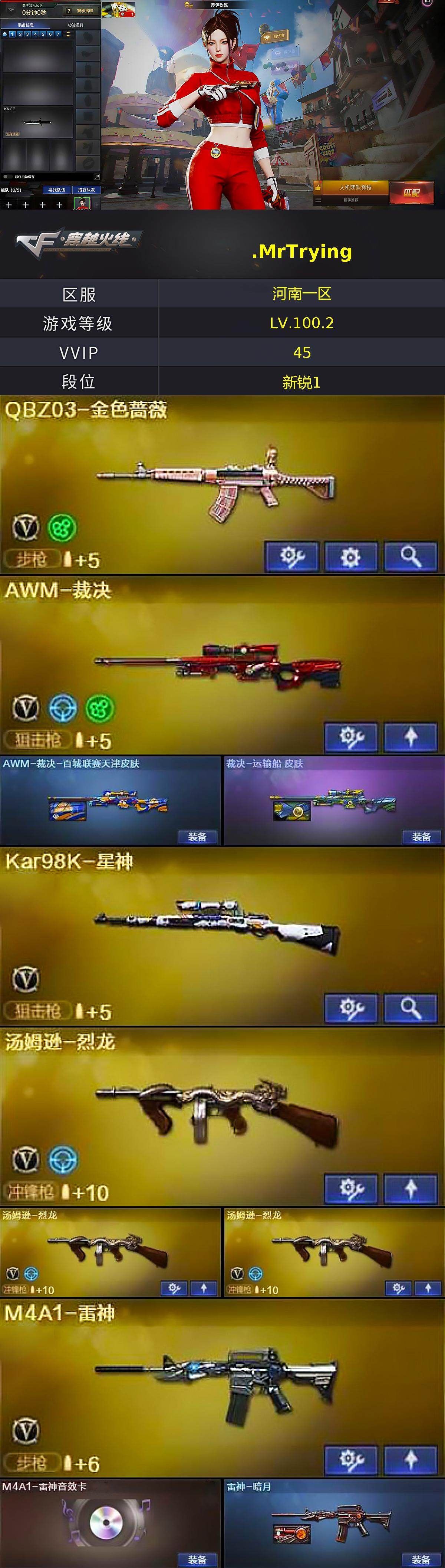 [16941310]河南一区-46V-5王者武器数-3炫金武器数 【热门武器】:QBZ03-金色蔷薇,HK417-朱雀,死亡之眼,Kar98K-星神,汤姆逊-烈龙*3,加特林-炼狱*2,沙鹰-修罗*2 【王者炫金武器】:王者之戮,王者之刺,王者之锋*2,炫金毁灭,炫金天龙*2 【音效卡】:M4A1-雷神音效卡,Barrett-毁灭音效卡*3,Barrett-极光音效卡 【皮肤】:AWM-裁决-百城联赛天津皮肤,裁决-运输船 皮肤,雷神-暗月,火麒麟-华夏之心,毁灭耀金皮肤,修罗-能量核心,屠龙-惊鸿 皮肤,轻型军用手斧-再燃火线 【角色】:乔伊教练,风暴女,嘉年华灵狐,兰妹妹,灵狐者-X,灵狐者-黄金海岸,曼陀罗-X,潘多拉-X,潘多拉-甜心教官,斯沃特-X 【人偶武器】:AWM-灵狐-15周年嘉年华,迷你牛牛,迷你生化手雷,生化手雷-机甲核心*2 【暴走生化】:死亡之眼 【挑战大师】:激光毁灭者III,神圣爆裂者-末日III 【英雄级武器】:AK47-火麒麟,M4A1-雷神,AK47-黑武士,AK12-天启*4,M4A1-武圣,HK417-朱雀,无影-神兵利器,黑武士-锦绣游龙,QBZ03-金色蔷薇,M4A1-猎神,AK-47-猩红传说,AK47-B-战神,AWM-天龙,Barrett-毁灭,AWM-裁决,Kar98K-星神,王者之怒-觉醒版,加特林-炼狱*2,汤姆逊-烈龙*3,AA-12-雷霆*3,沙鹰-修罗*2,屠龙*5,麒麟刺*2,麒麟刺-百战金芒,丛林匕首-玄豹,高爆手雷-玄豹*2,闪光弹-玄豹,烟雾弹-玄豹,M4A1-赤狱骑士 【道具】:云山科技背包,炫彩背包,女皇终结者-魔龙之吻,救世主-黑桃战神,绿色巨人,灵魂忍者,迷雾幽灵,夺命之镰,防化服*3,金色流光-枪王排位*2,枪王排位28赛季金色流光,防弹头盔*5,防弹衣*4,C4工具钳*4,手雷包*5 【特殊枪械】:3烈龙,2炼狱