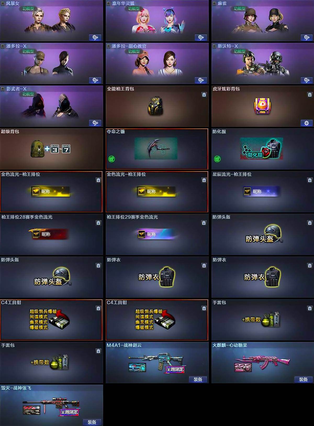 【道具】:全能枪王背包,虎牙炫彩背包,超级背包,夺命之镰,防化服,金色流光-枪王排位*2,星辰流光-枪王排位,枪王排位28赛季金色流光,枪王排位29赛季金色流光,防弹头盔*2,防弹衣*2,C4工具钳*2,手雷包*2