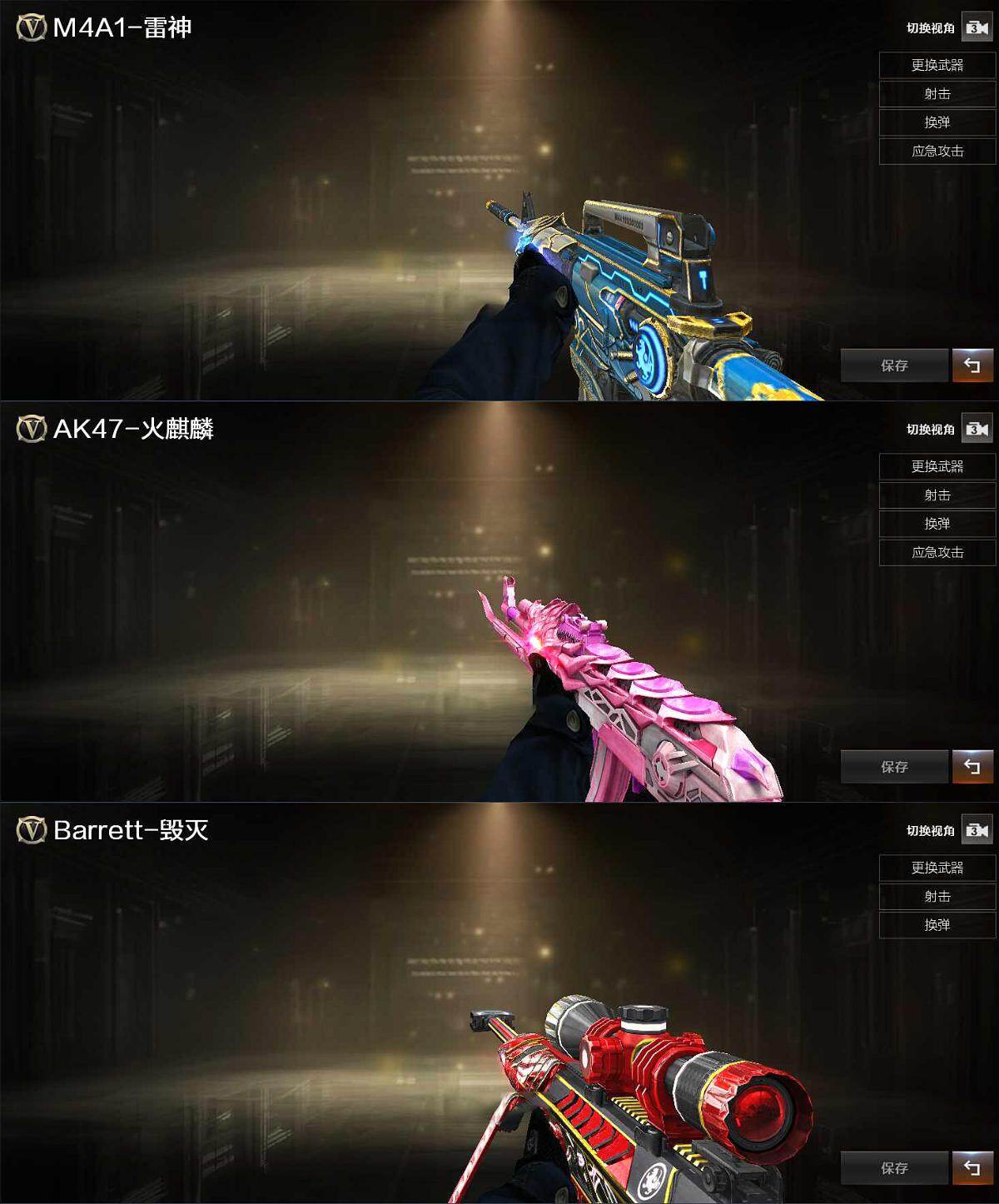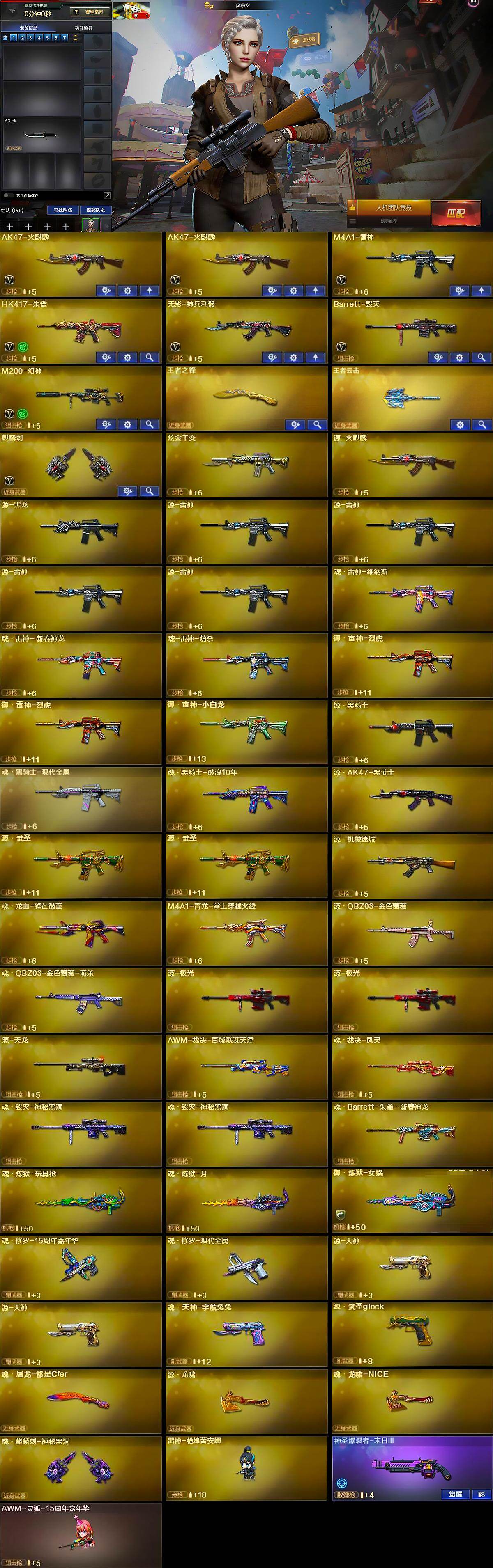 【英雄级武器】:AK47-火麒麟*2,M4A1-雷神,HK417-朱雀,无影-神兵利器,Barrett-毁灭,M200-幻神,麒麟刺