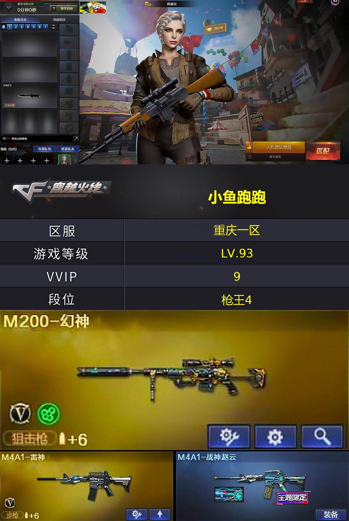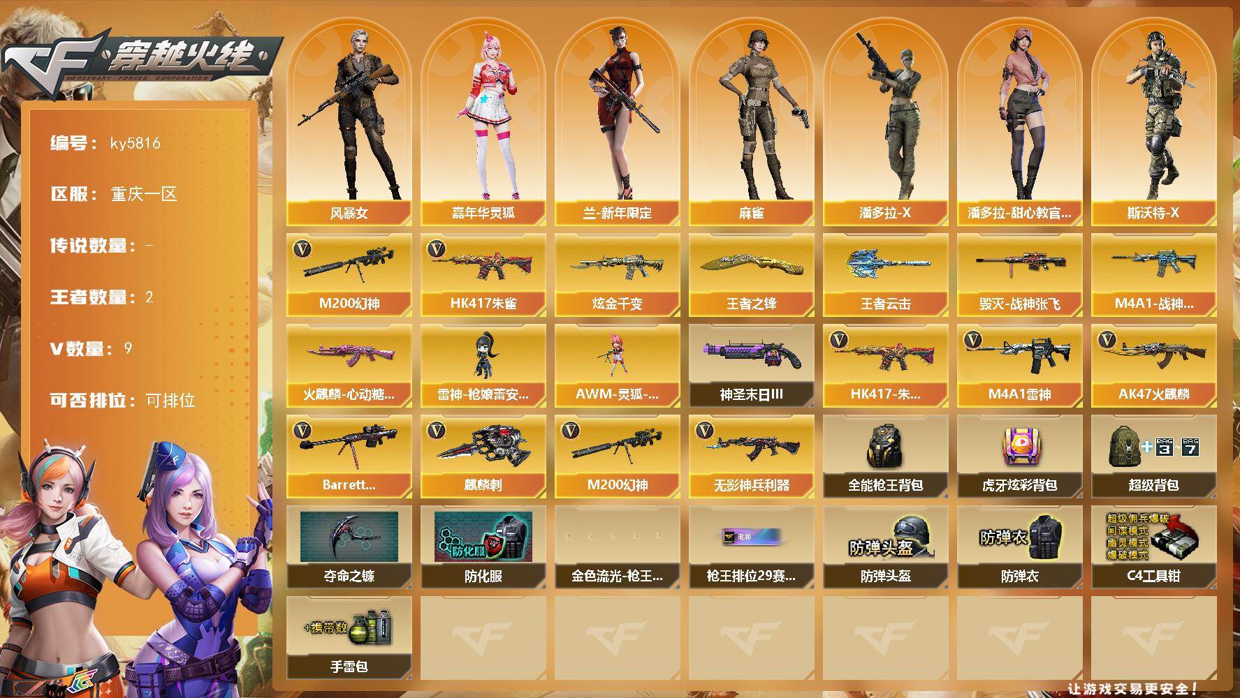 [16941431]重庆一区-9V-2王者武器数-1炫金武器数 【热门武器】:HK417-朱雀,M200-幻神 【王者炫金武器】:王者之锋,王者云击,炫金千变 【皮肤】:M4A1-战神赵云,火麒麟-心动糖果,毁灭-战神张飞 【角色】:风暴女,嘉年华灵狐,兰-新年限定,麻雀,潘多拉-X,潘多拉-甜心教官,斯沃特-X,影武者-X 【人偶武器】:雷神-枪娘蕾安娜,AWM-灵狐-15周年嘉年华 【挑战大师】:神圣爆裂者-末日III 【英雄级武器】:AK47-火麒麟*2,M4A1-雷神,HK417-朱雀,无影-神兵利器,Barrett-毁灭,M200-幻神,麒麟刺 【道具】:全能枪王背包,虎牙炫彩背包,超级背包,夺命之镰,防化服,金色流光-枪王排位*2,星辰流光-枪王排位,枪王排位28赛季金色流光,枪王排位29赛季金色流光,防弹头盔*2,防弹衣*2,C4工具钳*2,手雷包*2 【特殊枪械】: