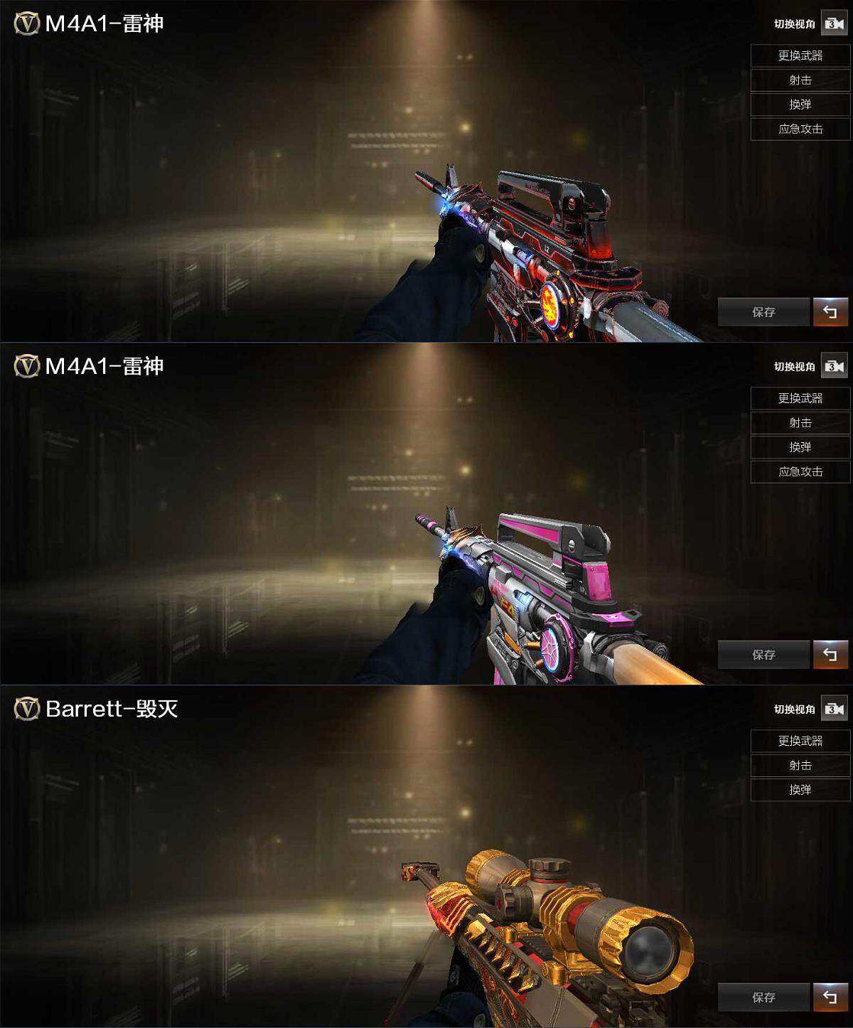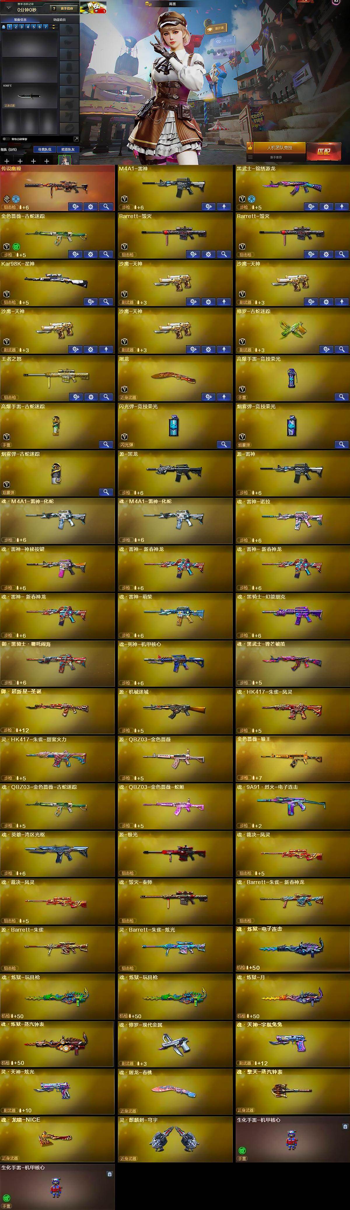 【英雄级武器】:M4A1-雷神,黑武士-锦绣游龙,金色蔷薇-古蛇迷踪,Barrett-毁灭*2,Kar98K-星神,沙鹰-天神*4,修罗-古蛇迷踪,屠龙,高爆手雷-竞技荣光,高爆手雷-古蛇迷踪,闪光弹-竞技荣光,烟雾弹-竞技荣光,烟雾弹-古蛇迷踪