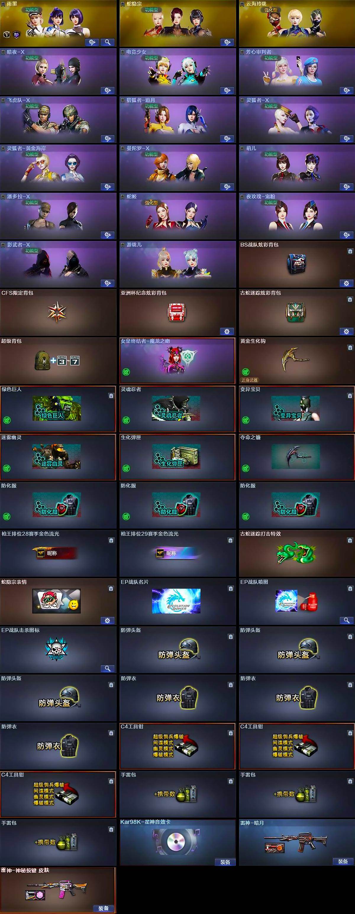 【道具】:BS战队炫彩背包,CFS限定背包,亚洲杯纪念炫彩背包,古蛇迷踪炫彩背包,超级背包,女皇终结者-魔龙之吻,黄金生化钩,绿色巨人,灵魂忍者,变异宝贝,迷雾幽灵,生化弹匣,夺命之镰,防化服*3,枪王排位28赛季金色流光,枪王排位29赛季金色流光,古蛇迷踪打击特效,蛇隐宗表情,EP战队名片,EP战队喷图,EP战队击杀图标,防弹头盔*3,防弹衣*3,C4工具钳*3,手雷包*3