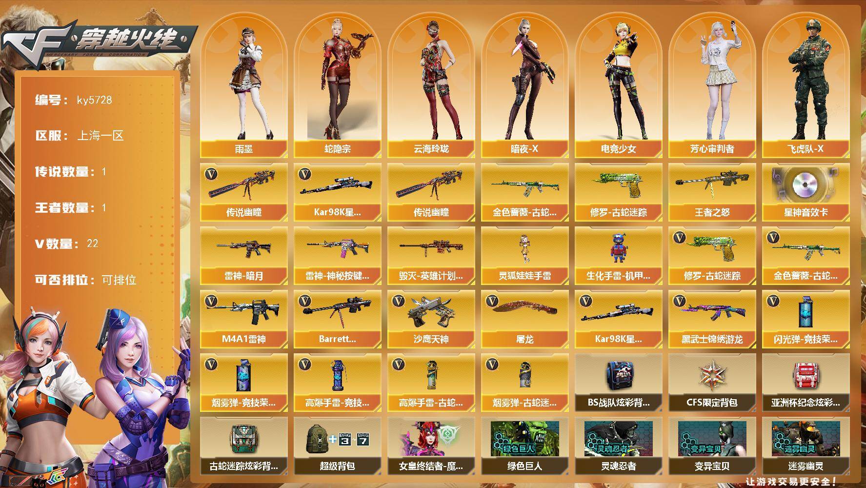 [16941574]上海一区-20V-1王者武器数-0炫金武器数 【传说武器】:传说幽瞳 【热门武器】:传说幽瞳,金色蔷薇-古蛇迷踪,修罗-古蛇迷踪,Kar98K-星神 【王者炫金武器】:王者之怒 【音效卡】:Kar98K-星神音效卡 【皮肤】:雷神-暗月,雷神-神秘按键 皮肤,毁灭-英雄计划 皮肤 【角色】:雨墨,蛇隐宗,云海玲珑,暗夜-X,电竞少女,芳心审判者,飞虎队-X,猎狐者-追月,0号玩家,灵狐者-X,灵狐者-黄金海岸,曼陀罗-X,萌儿,潘多拉-X,蛇姬,兔囡囡,夜玫瑰-宠粉,影武者-X,游珑儿 【人偶武器】:生化手雷-机甲核心*2,灵狐娃娃手雷 【英雄级武器】:M4A1-雷神,黑武士-锦绣游龙,金色蔷薇-古蛇迷踪,Barrett-毁灭*2,Kar98K-星神,沙鹰-天神*4,修罗-古蛇迷踪,屠龙,高爆手雷-竞技荣光,高爆手雷-古蛇迷踪,闪光弹-竞技荣光,烟雾弹-竞技荣光,烟雾弹-古蛇迷踪 【道具】:BS战队炫彩背包,CFS限定背包,亚洲杯纪念炫彩背包,古蛇迷踪炫彩背包,超级背包,女皇终结者-魔龙之吻,黄金生化钩,绿色巨人,灵魂忍者,变异宝贝,迷雾幽灵,生化弹匣,夺命之镰,防化服*3,枪王排位28赛季金色流光,枪王排位29赛季金色流光,古蛇迷踪打击特效,蛇隐宗表情,EP战队名片,EP战队喷图,EP战队击杀图标,防弹头盔*3,防弹衣*3,C4工具钳*3,手雷包*3 【特殊枪械】: