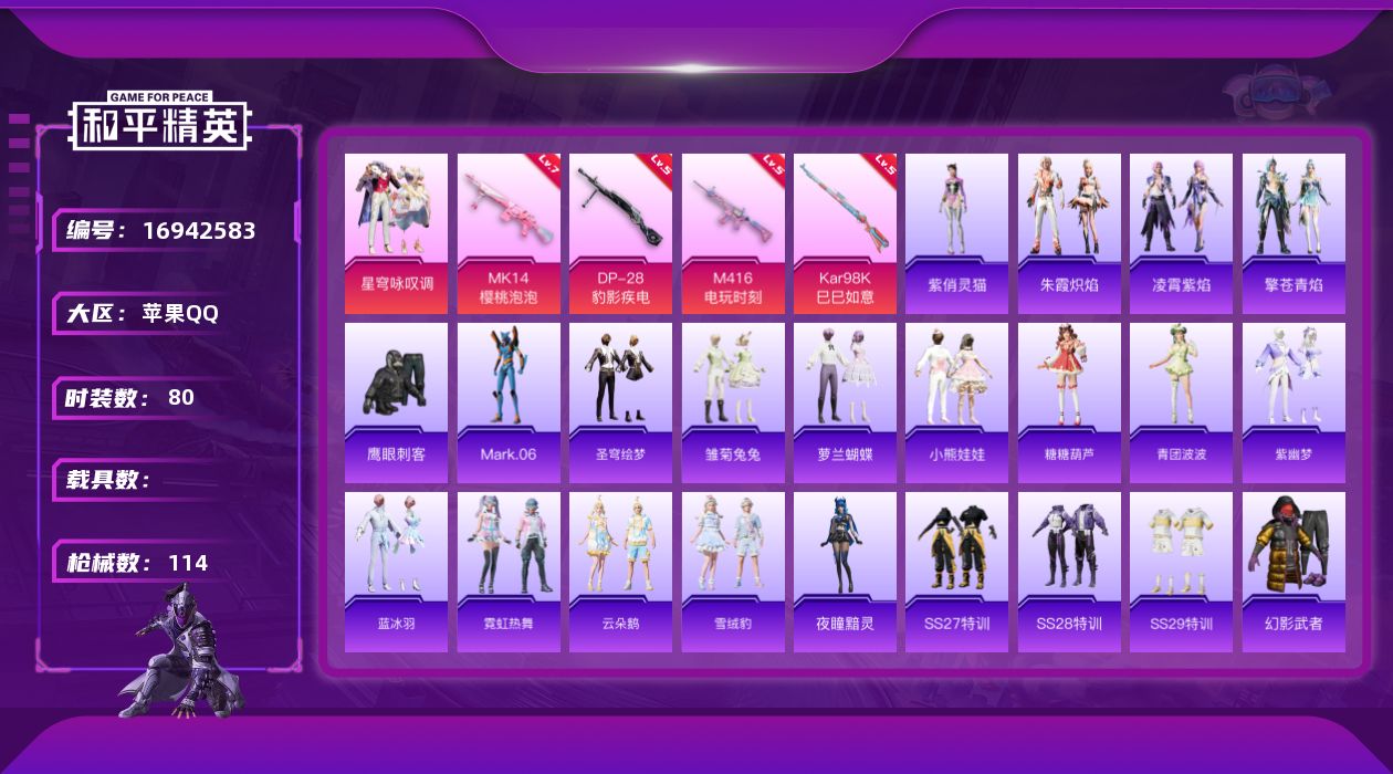 [16942583]苹果 手Q-2粉装-5特效枪-0载具-1粉色飞行器-34528热力值-8王牌印记-80套装-114枪皮