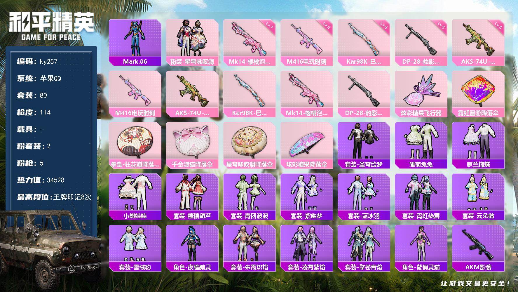 [16942583]苹果 手Q-2粉装-5特效枪-0载具-1粉色飞行器-34528热力值-8王牌印记-80套装-114枪皮 【热门品类】:角色-Mark.06 【粉色套装】:粉装-星穹咏叹调 【粉色枪皮等级】:M416-电玩时刻(五级),AKS-74U-森灵之息(五级),Kar98K-巳巳如意(五级),Mk14-樱桃泡泡(七级),DP-28-豹影疾电(五级) 【粉色枪皮】:M416-电玩时刻,AKS-74U-森灵之息,Kar98K-巳巳如意,Mk14-樱桃泡泡,DP-28-豹影疾电 【粉色飞行器】:炫彩糖果飞行器 【粉色降落伞】:霓虹漫游降落伞,拳皇·狂花道降落伞,千金淑猫降落伞,星穹咏叹调降落伞,炫彩糖果降落伞 【稀有套装】:套装-圣穹绘梦,套装-雪国风尚,套装-炫彩糖果,套装-雏菊兔兔,套装-萝兰蝴蝶,套装-小熊娃娃,套装-糖糖葫芦,套装-青团波波,套装-紫幽梦,套装-蓝冰羽,套装-霓虹热舞,套装-云朵鹅,套装-雪绒豹,角色-夜瞳黯灵,套装-朱霞炽焰,套装-凌霄紫焰,套装-擎苍青焰,角色-紫俏灵猫 【稀有枪皮】:AUG-冰晶雪宝,AKM-影袭,AKM-破晓战魂,GROZA-影袭,AUG-耀粉歌者,M762-天降萌叽,M762-云朵鹅,G36C-星穹咏叹调,蜜獾-天降萌叽,ARX-凌霄紫焰,UZI-天降萌叽,UZI-影袭,UMP45-圣穹绘梦,UMP45-极意拳锋,Vector-焰鹰斗篷,汤姆逊-炫彩节奏,JS9-凌霄紫焰,Kar98K-影袭,M24-影袭,AWM-焰鹰斗篷,SLR-圣穹绘梦,SVD-云朵鹅,S686-红色方程式,DBS-焰鹰斗篷,SPAS-12-云朵鹅,DP-28-焰鹰斗篷,MG3-幻世战舞者,MG3-第五大道,MG-36-凌霄紫焰,P92-凌霄紫焰,短管霰弹-星穹咏叹调,沙漠之鹰-云朵鹅,沙漠之鹰-圣穹绘梦,TMP-9-江南烟雨,大砍刀-云朵鹅,平底锅-凌霄紫焰 【其他套装】:套装-SS27特训,套装-SS28特训,套装-SS29特训,套装-幻影武者,套装-柠萌假日,套装-森林游猎者,套装-海岛探路者,套装-湖蓝色名流,套装-猎鹰,套装-猛禽,套装-王牌教练,套装-白色伏地魔,套装-破蛋小黄鸡,套装-竞技名士,套装-红色运动,套装-绯格组合,套装-缤纷果语,套装-耀粉歌者,套装-蓝色运动,套装-长空猛禽,套装-青涩时光,套装-魅力单车,套装-鹤鸣,套装-黄色伏地