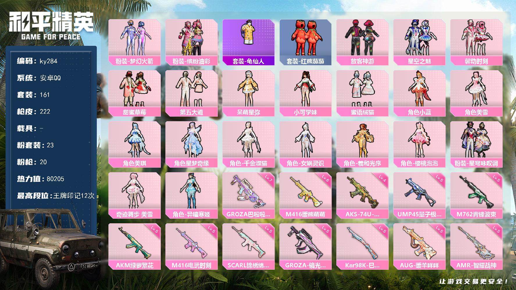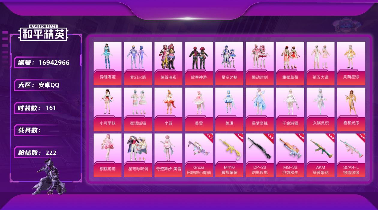 [16942966]安卓 手Q-23粉装-20特效枪-0载具-10粉色飞行器-80205热力值-12王牌印记-161套装-222枪皮