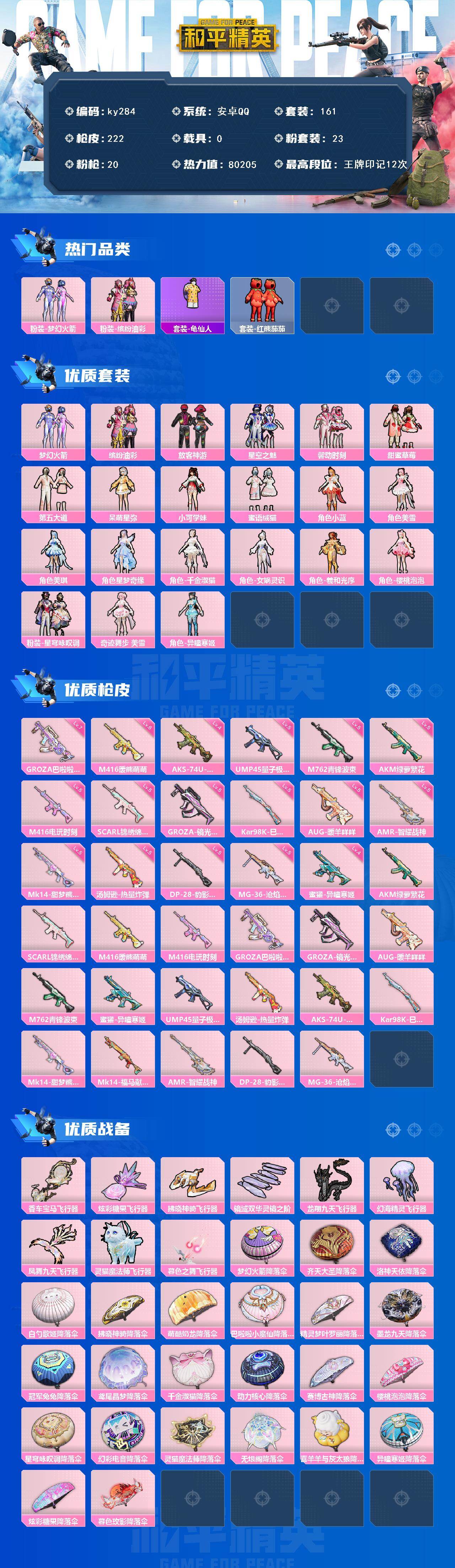 [16942966]安卓 手Q-23粉装-20特效枪-0载具-10粉色飞行器-80205热力值-12王牌印记-161套装-222枪皮 【热门品类】:粉装-梦幻火箭,粉装-缤纷油彩,套装-龟仙人,套装-红熊茄茄 【粉色套装】:粉装-梦幻火箭,粉装-缤纷油彩,粉装-放客神游,粉装-星空之魅,粉装-馨动时刻,粉装-甜蜜草莓,粉装-第五大道,角色-呆萌星弥,角色-小可学妹,粉装-蜜语绒猫,角色-小蓝,角色-美雪,角色-美琪,角色-星梦奇缘,角色-千金淑猫,角色-女娲灵识,角色-羲和光序,角色-樱桃泡泡,粉装-星穹咏叹调,角色-奇迹舞步 美雪,角色-异瞳寒姬 【粉色枪皮等级】:AKM-绿萝繁花(五级),SCAR-L-锦绣绵绵(五级),M416-暖熊萌萌(六级),M416-电玩时刻(五级),GROZA-巴啦啦小魔仙(七级),GROZA-镜光银凌(五级),AUG-暖羊咩咩(五级),M762-青锋波束(五级),蜜獾-异瞳寒姬(四级),UMP45-量子极限(五级),汤姆逊-热量炸弹(五级),AKS-74U-森灵之息(四级),Kar98K-巳巳如意(五级),Mk14-甜梦熊击(五级),AMR-智耀战神(五级),DP-28-豹影疾电(五级),MG-36-沧焰双生(五级) 【粉色枪皮】:AKM-绿萝繁花,SCAR-L-锦绣绵绵,M416-暖熊萌萌,M416-电玩时刻,GROZA-巴啦啦小魔仙,GROZA-镜光银凌,AUG-暖羊咩咩,M762-青锋波束,蜜獾-异瞳寒姬,UMP45-量子极限,汤姆逊-热量炸弹,AKS-74U-森灵之息,Kar98K-巳巳如意,Mk14-甜梦熊击,Mk14-福马献瑞,AMR-智耀战神,DP-28-豹影疾电,MG-36-沧焰双生 【粉色飞行器】:香车宝马飞行器,炫彩糖果飞行器,拂晓神骑飞行器,镜域双华-灵镜之阶,龙翔九天飞行器,幻海精灵飞行器,凤舞九天飞行器,灵猫魔法师飞行器,暮色之舞飞行器 【粉色降落伞】:梦幻火箭降落伞,齐天大圣降落伞,洛神天依降落伞,白勺歌姬降落伞,拂晓神骑降落伞,萌酷奶龙降落伞,巴啦啦小魔仙降落伞,精灵梦叶罗丽降落伞,墨龙九天降落伞,冠军兔兔降落伞,鸢尾晶梦降落伞,千金淑猫降落伞,动力核心降落伞,赛博古神降落伞,樱桃泡泡降落伞,星穹咏叹调降落伞,幻彩电音降落伞,灵猫魔法师降落伞,无垠阁降落伞,喜羊羊与灰太狼降落伞,异瞳寒姬降落伞,炫彩糖果降落伞,暮色玫影降落
