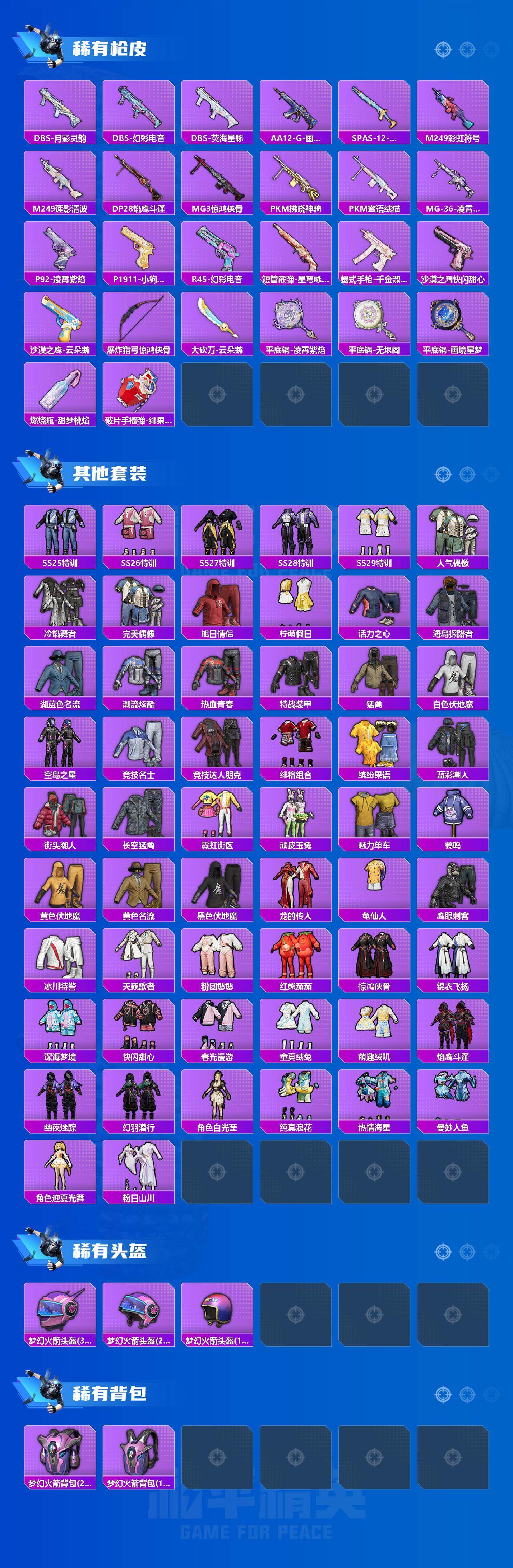 AKM-绿萝繁花,SCAR-L-锦绣绵绵,M416-暖熊萌萌,M416-电玩时刻,GROZA-巴啦啦小魔仙,GROZA-镜光银凌,AUG-暖羊咩咩,M762-青锋波束,UMP45-量子极限,Kar98K-巳巳如意