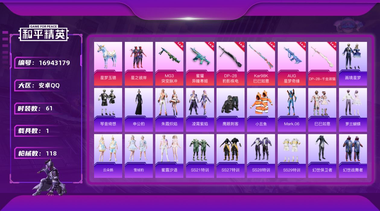 [16943179]安卓 手Q-1粉装-6特效枪-1载具-3粉色飞行器-31744热力值-3王牌印记-61套装-118枪皮 【热门品类】:套装-小丑鱼,角色-Mark.06 【粉色套装】:粉装-星之彼岸 【粉色枪皮等级】:AUG-星梦奇缘(三级),蜜獾-异瞳寒姬(五级),Kar98K-巳巳如意(四级),DP-28-千金淑猫(三级),DP-28-豹影疾电(五级),MG3-突变脉冲(六级) 【粉色载具】:星梦玉骢 【粉色枪皮】:AUG-星梦奇缘,蜜獾-异瞳寒姬,Kar98K-巳巳如意,DP-28-千金淑猫,DP-28-豹影疾电,MG3-突变脉冲 【粉色飞行器】:炫彩糖果飞行器,深渊漩涡飞行器 【粉色降落伞】:绝对恒星降落伞,洛神天依降落伞,创世·救赎降落伞,星梦奇缘降落伞,金丰海韵降落伞,宇宙意志降落伞,时光之吻降落伞,炫彩糖果降落伞 【稀有套装】:套装-巳巳如意,套装-雪国风尚,套装-炫彩糖果,套装-萝兰蝴蝶,套装-云朵鹅,套装-雪绒豹,套装-蜜露汐语,套装-朱霞炽焰,套装-凌霄紫焰,角色-申公豹,套装-画境星梦,套装-琴音绮想,套装-红釉青花 【稀有枪皮】:AUG-冰晶雪宝,AKM-星之彼岸,AKM-破晓战魂,SCAR-L-玉兔迎春,SCAR-L-冷漠罗丽,M416-蓝色火焰,GROZA-影袭,AUG-耀粉歌者,QBZ-魔药课室,M762-云朵鹅,M762-登顶巅峰,ACE32-画境星梦,ARX-凌霄紫焰,UZI-幻影战神,UZI-影袭,Vector-创世·救赎,野牛-最终圣卫者,MP5K-画境星梦,JS9-凌霄紫焰,M24-影袭,Mini14-金玉无双,SVD-云朵鹅,M1加兰德-画境星梦,S12K-夜灯,S12K-幻世战舞者,DBS-幻彩电音,DBS-创世·救赎,AA12-G-画境星梦,SPAS-12-云朵鹅,M249-彩虹符号,MG-36-凌霄紫焰,P92-凌霄紫焰,蝎式手枪-千金淑猫,沙漠之鹰-云朵鹅,爆炸猎弓-喜羊羊与灰太狼,大砍刀-云朵鹅,平底锅-凌霄紫焰,平底锅-画境星梦,破片手榴弹-巳巳如意 【其他套装】:套装-SS21特训,套装-SS27特训,套装-SS28特训,套装-SS29特训,套装-幻世保卫者,套装-幻世战舞者,套装-幻影武者,套装-湖蓝色名流,套装-特训学院,套装-竞技名士,套装-缤纷果语,套装-街头潮人,套装-长空猛禽,套装-青年教官,套装-青春校园,套装
