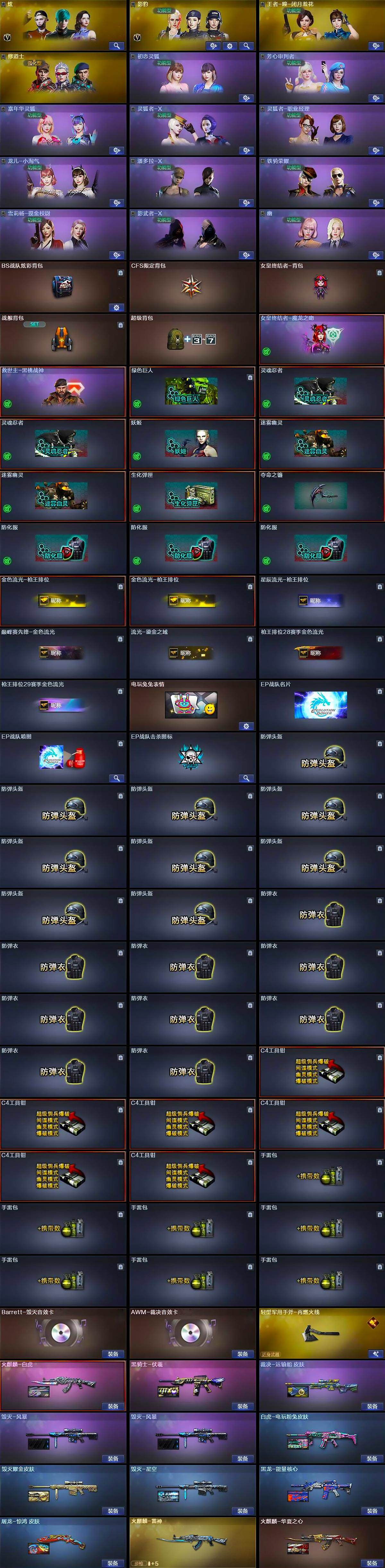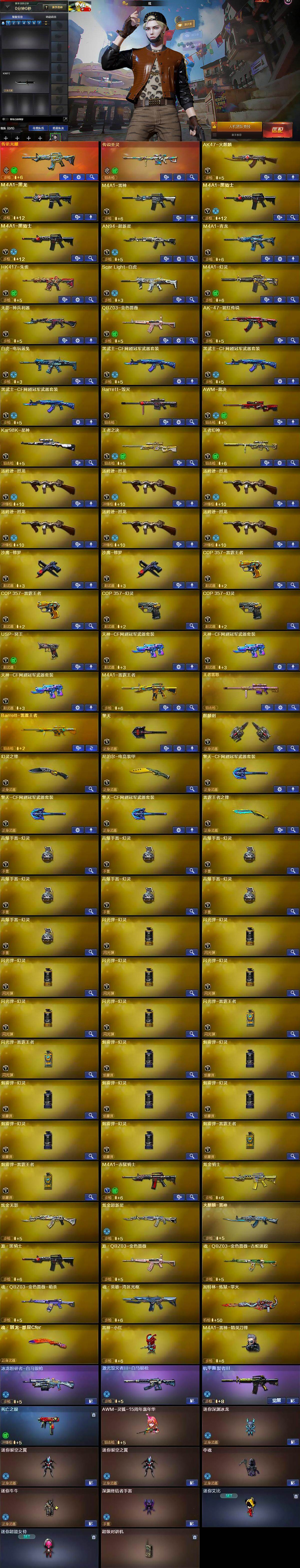 【英雄级武器】:AK47-火麒麟,M4A1-黑龙,M4A1-雷神,M4A1-黑骑士*2,AN94-超新星,M4A1-青龙,HK417-朱雀,Scar Light-白虎,M4A1-幻灵,无影-神兵利器,QBZ03-金色蔷薇,AK-47-猩红传说,白虎-电玩蓝兔,黑武士-CF网剧冠军*3,Barrett-毁灭,AWM-裁决,Kar98K-星神,王者之决-觉醒版,王者幻神-觉醒版,汤姆逊-烈龙*6,沙鹰-修罗*2,COP 357-雷霆王者-觉醒版*2,COP 357-幻灵*2,USP-冥王,天神-CF网剧冠军*3,擎天,麒麟刺,幻灵之锋,尼泊尔-电竞装甲,擎天-CF网剧冠军*3,雷霆王者之锋-觉醒版,高爆手雷-幻灵*7,闪光弹-幻灵*7,闪光弹-雷霆王者-觉醒版*2,烟雾弹-幻灵*7,烟雾弹-雷霆王者-觉醒版*2,M4A1-赤狱骑士