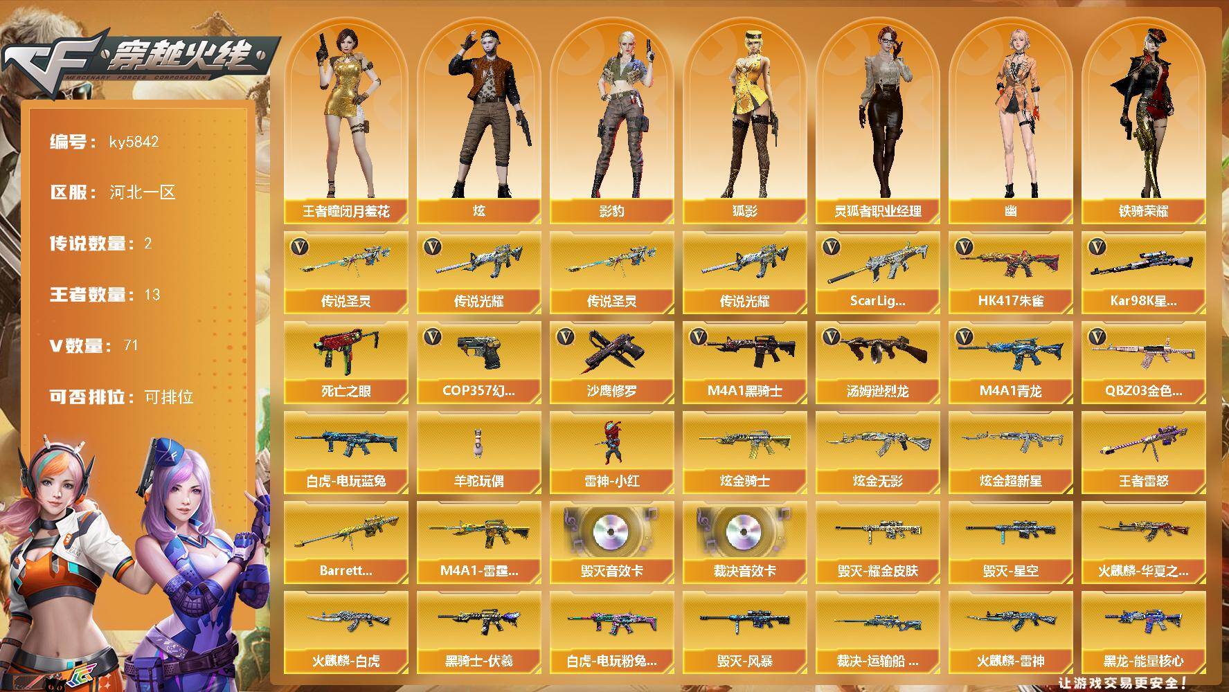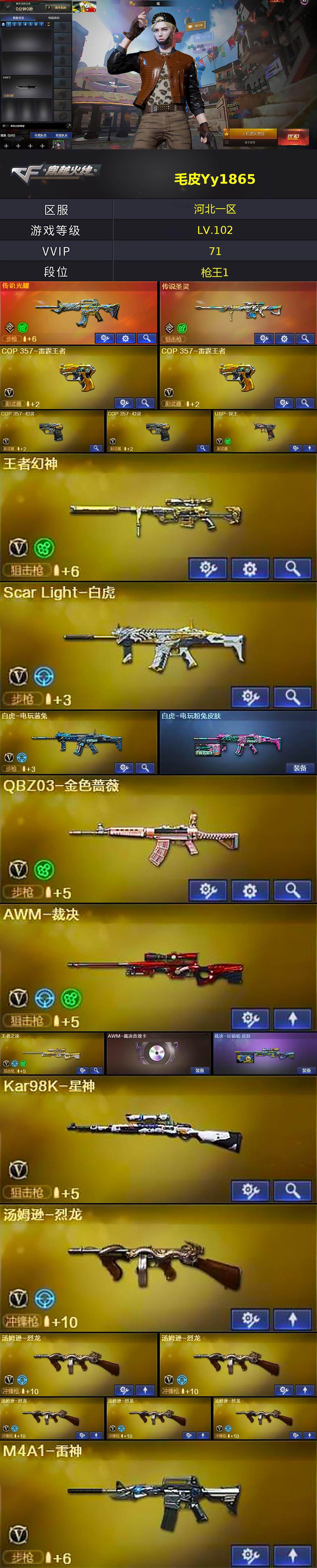 [16943391]河北一区-80V-13王者武器数-3炫金武器数 【传说武器】:传说光耀,传说圣灵 【热门武器】:传说光耀,传说圣灵,QBZ03-金色蔷薇,Scar Light-白虎,HK417-朱雀,M4A1-青龙,死亡之眼,白虎-电玩蓝兔,Kar98K-星神,M4A1-黑骑士*2,汤姆逊-烈龙*6,羊驼玩偶*4,雷神-小红,COP 357-幻灵*2,沙鹰-修罗*2 【王者炫金武器】:M4A1-雷霆王者,王者雷怒,Barrett-雷霆王者,炫金骑士,炫金无影,炫金超新星 【音效卡】:Barrett-毁灭音效卡,AWM-裁决音效卡 【皮肤】:白虎-电玩粉兔皮肤,裁决-运输船 皮肤,火麒麟-雷神,火麒麟-华夏之心,火麒麟-白虎,毁灭耀金皮肤,毁灭-星空,毁灭-风暴*2,黑龙-能量核心,黑骑士-伏羲,屠龙-惊鸿 皮肤,轻型军用手斧-再燃火线 【角色】:炫,影豹,王者-瞳-闭月羞花,狐影,修道士,初恋灵狐,芳心审判者,嘉年华灵狐,0号玩家,灵狐者-X,灵狐者-职业经理,龙儿-小淘气,潘多拉-X,铁骑荣耀,雪莉杨-摸金校尉,影武者-X,幽 【人偶武器】:雷神-小红,M4A1-雷神-精英刀锋,AWM-灵狐-15周年嘉年华,迷你深渊冰龙,迷你裂空之翼*2,夺魂,迷你牛牛,深渊终结者手雷,迷你艾比,迷你超能女侍 【暴走生化】:死亡之眼,超级对讲机 【挑战大师】:冰龙粉碎者-白马银枪,激光毁灭者III-白马银枪,机甲撕裂者III 【英雄级武器】:AK47-火麒麟,M4A1-黑龙,M4A1-雷神,M4A1-黑骑士*2,AN94-超新星,M4A1-青龙,HK417-朱雀,Scar Light-白虎,M4A1-幻灵,无影-神兵利器,QBZ03-金色蔷薇,AK-47-猩红传说,白虎-电玩蓝兔,黑武士-CF网剧冠军*3,Barrett-毁灭,AWM-裁决,Kar98K-星神,王者之决-觉醒版,王者幻神-觉醒版,汤姆逊-烈龙*6,沙鹰-修罗*2,COP 357-雷霆王者-觉醒版*2,COP 357-幻灵*2,USP-冥王,天神-CF网剧冠军*3,擎天,麒麟刺,幻灵之锋,尼泊尔-电竞装甲,擎天-CF网剧冠军*3,雷霆王者之锋-觉醒版,高爆手雷-幻灵*7,闪光弹-幻灵*7,闪光弹-雷霆王者-觉醒版*2,烟雾弹-幻灵*7,烟雾弹-雷霆王者-觉醒版*2,M4A1-赤狱骑士 【道具】:BS战队炫彩背包,CFS限定背包,