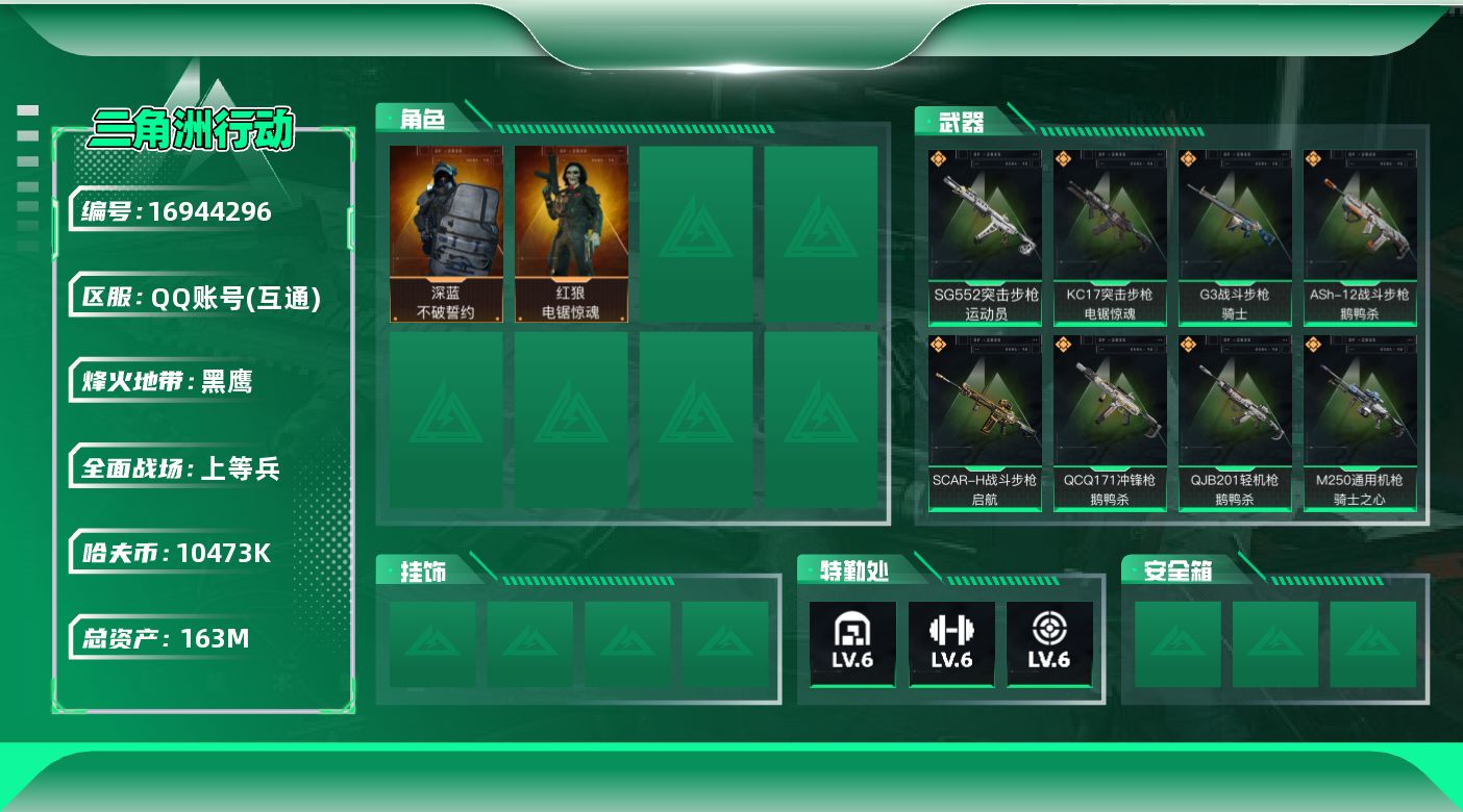 [16944296]【店主推荐捡漏号!可直接换绑】10473k哈伏币-149m流动资产-60烽火等级-黑鹰-42战场等级-上等兵 【干员外观】:深蓝-不破誓约,红狼-电锯惊魂 【近战皮肤】:近战-黑鹰 【传说外观】:M4A1突击步枪-阿米娅,ASh-12战斗步枪-鹅鸭杀,M16A4突击步枪-狩猎时刻,SG552突击步枪-运动员,AK-12突击步枪-特斯拉线圈,SCAR-H战斗步枪-启航,G3战斗步枪-狩猎时刻,G3战斗步枪-骑士,CAR-15突击步枪-阿米娅,KC17突击步枪-电锯惊魂,Vector冲锋枪-狩猎时刻,UZI冲锋枪-特斯拉线圈,SR-3M紧凑突击步枪-特斯拉线圈,勇士冲锋枪-能天使-午夜邮差,QCQ171冲锋枪-鹅鸭杀,M250通用机枪-骑士之心,QJB201轻机枪-鹅鸭杀,复合弓-黑·天际线 【史诗外观】:QBZ95-1突击步枪-曙光,ASh-12战斗步枪-无极限,M16A4突击步枪-竞赛选手,AUG突击步枪-蝮蛇,SCAR-H战斗步枪-囚徒,G3战斗步枪-流沙送葬,AS Val突击步枪-典狱官,AS Val突击步枪-百步穿杨,K437突击步枪-守护者,MP5冲锋枪-战术竞备,MP5冲锋枪-竞技风,P90冲锋枪-莫斯提马,Vector冲锋枪-猎鳄行动,Vector冲锋枪-异域战争,SR-3M紧凑突击步枪-战术竞备,勇士冲锋枪-工业狂潮,MP7冲锋枪-守护者,S12K霰弹枪-曙光,M250通用机枪-囚徒,Mini-14射手步枪-守护者,SVD狙击步枪-阿萨拉工艺,SV-98狙击步枪-林中猎手,SV-98狙击步枪-囚徒,M700狙击步枪-百步穿杨,AWM狙击步枪-无极限,复合弓-守护者 【稀有外观】:QBZ95-1突击步枪-花岗岩,K416突击步枪-星之彩,R93狙击步枪-地平线,SG552突击步枪-巨兽,M4A1突击步枪-繁盛,AKM突击步枪-战术演练,AKM突击步枪-肃杀,QBZ95-1突击步枪-公平竞技,ASh-12战斗步枪-繁盛,M16A4突击步枪-街头涂鸦,M7战斗步枪-捣蛋鬼,SCAR-H战斗步枪-荣耀列队,SCAR-H战斗步枪-黄昏,G3战斗步枪-战术演练,G3战斗步枪-主宰,PTR-32突击步枪-天网,腾龙突击步枪-冰天雪地,K437突击步枪-天狼星,MP5冲锋枪-弄臣,MP5冲锋枪-虎啸,MP5冲锋枪-哈夫克卫队,P90冲锋枪-黄昏,P90冲锋枪-捣蛋
