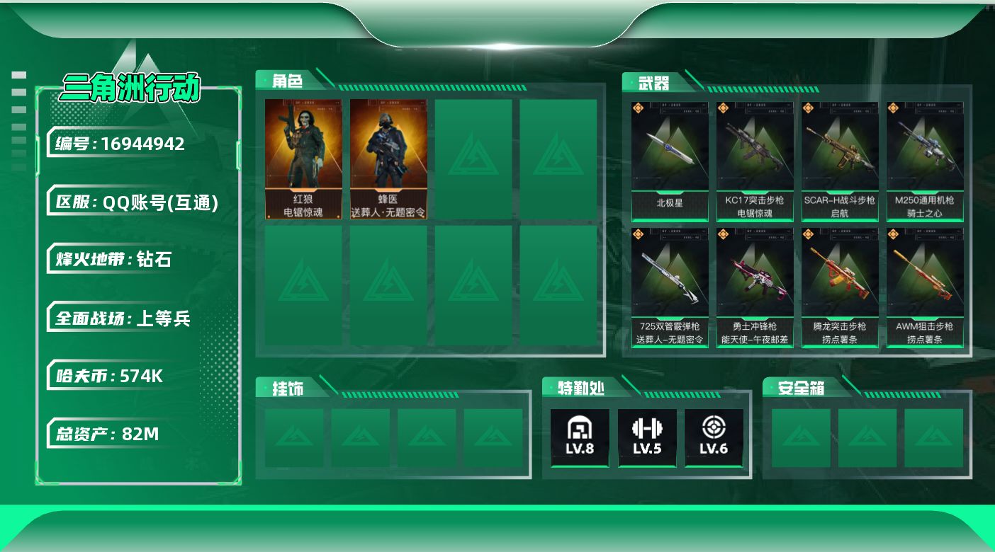 [16944942]【店主推荐捡漏号!可直接换绑】574k哈伏币-54m流动资产-60烽火等级-钻石-14战场等级-上等兵 【干员外观】:蜂医-送葬人·无题密令,红狼-电锯惊魂 【近战皮肤】:近战-北极星,近战-黑鹰 【传说外观】:M4A1突击步枪-阿米娅,AK-12突击步枪-特斯拉线圈,SCAR-H战斗步枪-启航,CAR-15突击步枪-阿米娅,腾龙突击步枪-捞点薯条,K437突击步枪-北极星,KC17突击步枪-电锯惊魂,UZI冲锋枪-特斯拉线圈,SR-3M紧凑突击步枪-特斯拉线圈,勇士冲锋枪-能天使-午夜邮差,QCQ171冲锋枪-北极星,725双管霰弹枪-送葬人-无题密令,M250通用机枪-骑士之心,AWM狙击步枪-捞点薯条,93R-捞点薯条,复合弓-黑·天际线 【史诗外观】:ASh-12战斗步枪-无极限,M16A4突击步枪-竞赛选手,SCAR-H战斗步枪-囚徒,AS Val突击步枪-典狱官,腾龙突击步枪-无垢,K437突击步枪-守护者,MP5冲锋枪-深海恐惧,MP5冲锋枪-战术竞备,MP5冲锋枪-竞技风,Vector冲锋枪-阿萨拉文明,SR-3M紧凑突击步枪-荒野求生,SR-3M紧凑突击步枪-战术竞备,勇士冲锋枪-工业狂潮,MP7冲锋枪-无垢,MP7冲锋枪-守护者,S12K霰弹枪-曙光,PKM通用机枪-荒野求生,M250通用机枪-囚徒,Mini-14射手步枪-守护者,SVD狙击步枪-阿萨拉工艺,SVD狙击步枪-荒野求生,PSG-1射手步枪-无垢,SV-98狙击步枪-林中猎手,SV-98狙击步枪-囚徒,SV-98狙击步枪-猎鳄行动,M700狙击步枪-竞技风,M700狙击步枪-蝮蛇,M700狙击步枪-哈夫克警备,AWM狙击步枪-无极限,复合弓-守护者 【稀有外观】:AKM突击步枪-战术演练,AKM突击步枪-肃杀,QBZ95-1突击步枪-公平竞技,K416突击步枪-虎啸,M7战斗步枪-前沿科技,M7战斗步枪-捣蛋鬼,SCAR-H战斗步枪-荣耀列队,SCAR-H战斗步枪-黄昏,G3战斗步枪-战术演练,G3战斗步枪-主宰,腾龙突击步枪-雪崩,腾龙突击步枪-前沿科技,腾龙突击步枪-冰天雪地,K437突击步枪-天狼星,MP5冲锋枪-弄臣,MP5冲锋枪-虎啸,MP5冲锋枪-哈夫克卫队,P90冲锋枪-黄昏,Vector冲锋枪-先锋,UZI冲锋枪-亚特兰蒂斯,SMG-45-行动开启,SMG-45冲