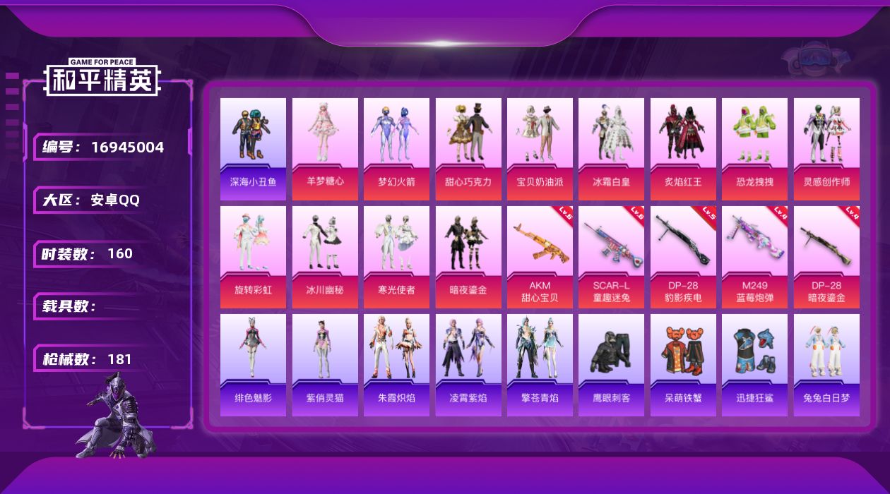 [16945004]安卓 手Q-12粉装-5特效枪-0载具-6粉色飞行器-64005热力值-10王牌印记-160套装-181枪皮 【热门品类】:粉装-梦幻火箭,套装-深海小丑鱼,套装-小丑鱼,角色-军刀雅典娜,套装-粉红小猪 【粉色套装】:粉装-甜心巧克力,粉装-宝贝奶油派,粉装-梦幻火箭,粉装-冰霜白皇,粉装-炙焰红王,粉装-恐龙拽拽,粉装-灵感创作师,粉装-旋转彩虹,粉装-冰川幽秘,粉装-寒光使者,粉装-暗夜鎏金,角色-羊梦糖心 【粉色枪皮等级】:AKM-甜心宝贝(六级),SCAR-L-童趣迷兔(六级),M249-蓝莓炮弹(四级),DP-28-暗夜鎏金(四级),DP-28-豹影疾电(五级) 【粉色枪皮】:AKM-甜心宝贝,SCAR-L-童趣迷兔,M249-蓝莓炮弹,DP-28-暗夜鎏金,DP-28-豹影疾电 【粉色飞行器】:炫彩糖果飞行器,童趣迷兔飞行器,暖熊萌萌飞行器,灵感创作师飞行器,冰川粉黛飞行器,圣域金龙飞行器 【粉色降落伞】:甜心宝贝降落伞,神秘黑猫降落伞,夏日绵绵冰降落伞,童趣迷兔降落伞,星之彼岸降落伞,暗夜玫瑰降落伞,蓝莓炮弹降落伞,橘柚倾心降落伞,圣光天使降落伞,环太平洋降落伞,灵感创作师降落伞,暗夜鎏金降落伞,圣域龙灵降落伞,智耀战神降落伞,无垠阁降落伞,异瞳寒姬降落伞,炫彩糖果降落伞 【稀有套装】:套装-炫彩糖果,角色-瑰梦爱神,套装-彩虹兔,套装-云朵鹅,套装-雪绒豹,角色-灵公主,角色-绛羽幽主,套装-朱霞炽焰,套装-凌霄紫焰,套装-擎苍青焰,角色-绯色魅影,角色-紫俏灵猫 【稀有枪皮】:AKM-彩虹符号,AKM-王牌投手,AKM-缤纷海域,AKM-虎虎生威,AKM-龙的传人,M16A4-幻世战舞者,M16A4-甜心亚梦,SCAR-L-炫彩节奏,SCAR-L-玉兔迎春,SCAR-L-红色方程式,SCAR-L-龙宫之主,M416-红色方程式,M416-蓝色火焰,GROZA-异彩先驱,GROZA-彩虹符号,GROZA-影袭,GROZA-梨园星光,GROZA-田园牧歌,GROZA-蓝莓炮弹,AUG-耀粉歌者,AUG-青春冒险家,QBZ-彩虹符号,QBZ-洛神天依,QBZ-相思残雪,QBZ-飞驰魅影,M762-天降萌叽,M762-彩虹甜喵,M762-暖熊萌萌,M762-暗夜鎏金,M762-瑞龙福将,M762-云朵鹅,Mk47-青春冒险家,G36C-暗夜玫瑰,AC-