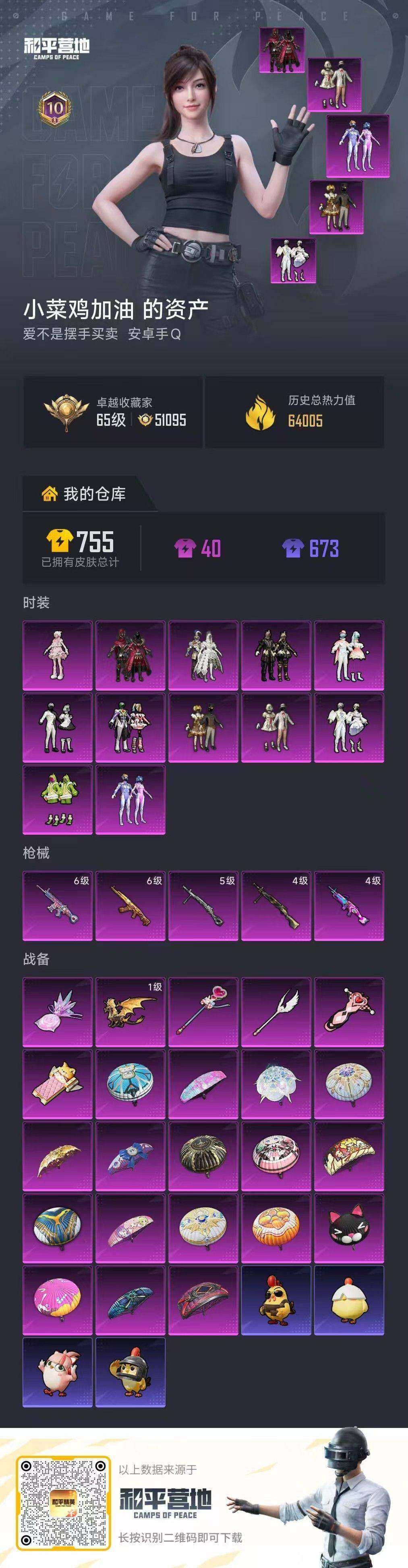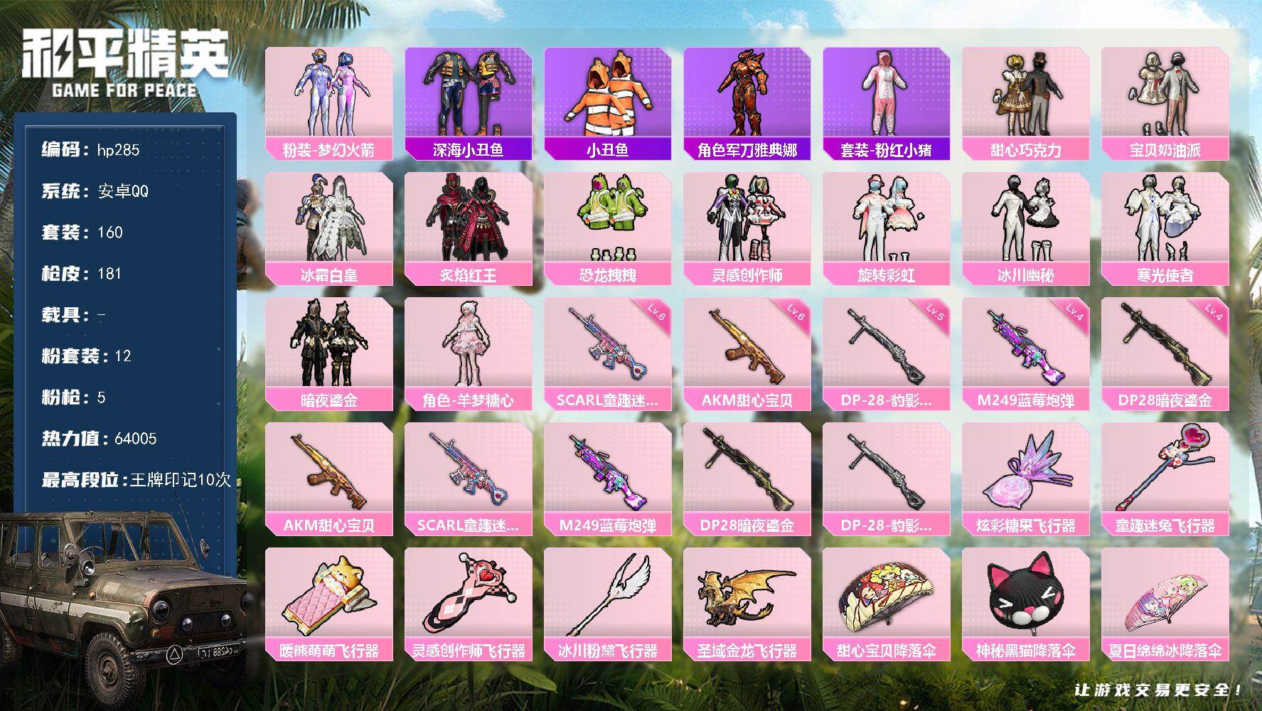 [16945004]安卓 手Q-12粉装-5特效枪-0载具-6粉色飞行器-64005热力值-10王牌印记-160套装-181枪皮