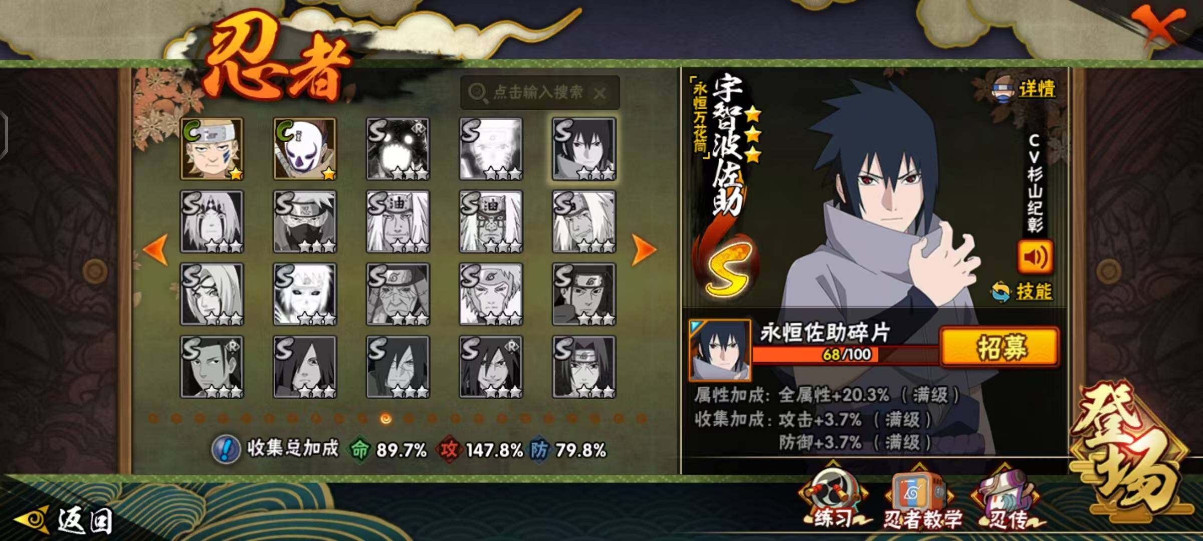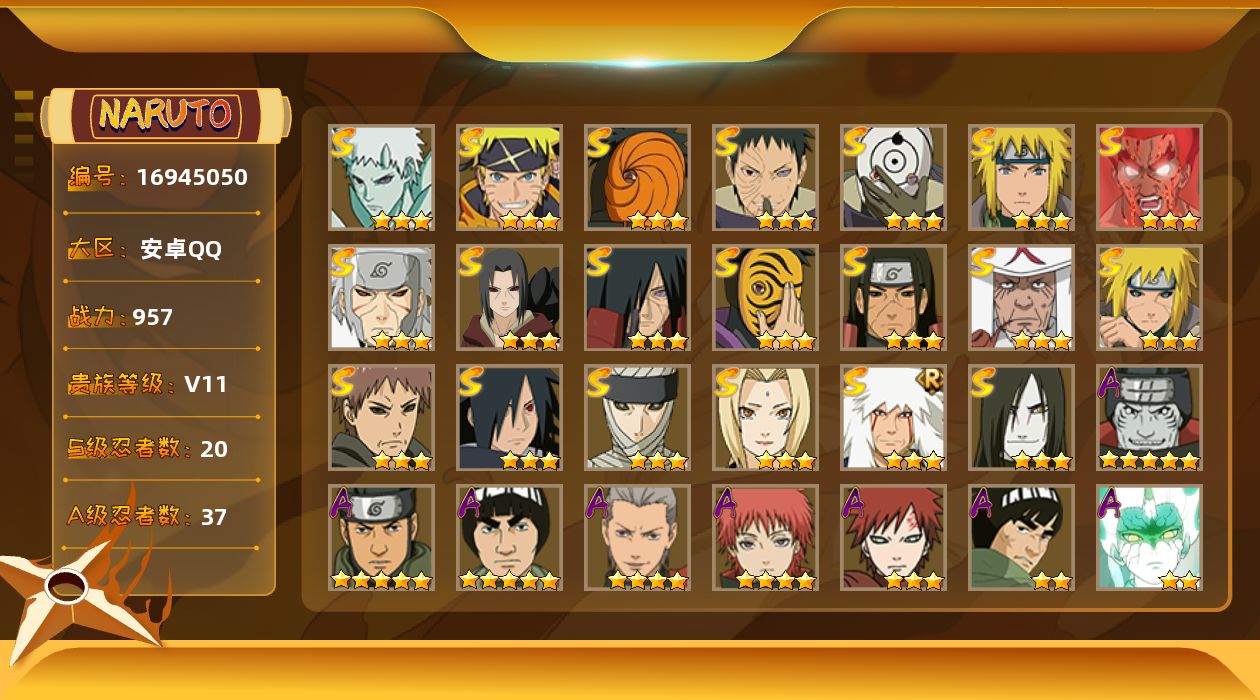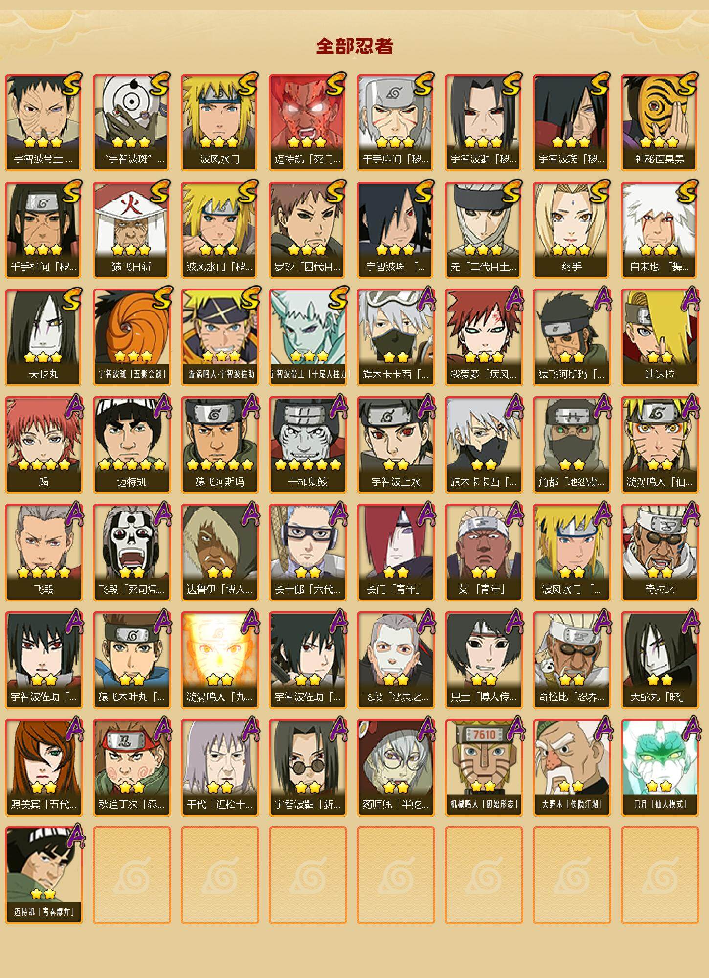【S级忍者】:波风水门「秽土转生」(3星),千手扉间「秽土转生」(3星),千手柱间「秽土转生」(3星),宇智波鼬「秽土转生」(3星),宇智波斑「秽土转生」(3星),宇智波带土「忍界大战」(3星),宇智波斑「木叶创立」(3星),无「二代目土影」(3星),罗砂「四代目风影」(3星),自来也「舞之豪杰」(3星),大蛇丸(3星),纲手(3星),猿飞日斩(3星),波风水门(3星),神秘面具男(3星),迈特凯「死门」(3星),宇智波斑 「白面具」(3星宇智波斑「白面具」),宇智波斑「五影会谈」(3星),漩涡鸣人·宇智波佐助(3星),宇智波带土「十尾人柱力」(3星)