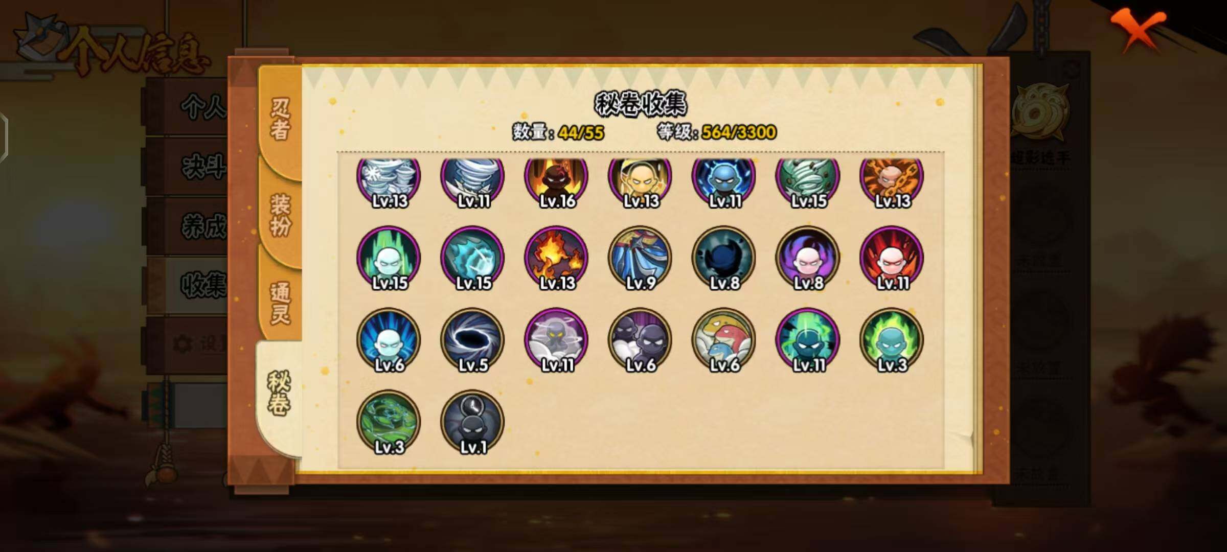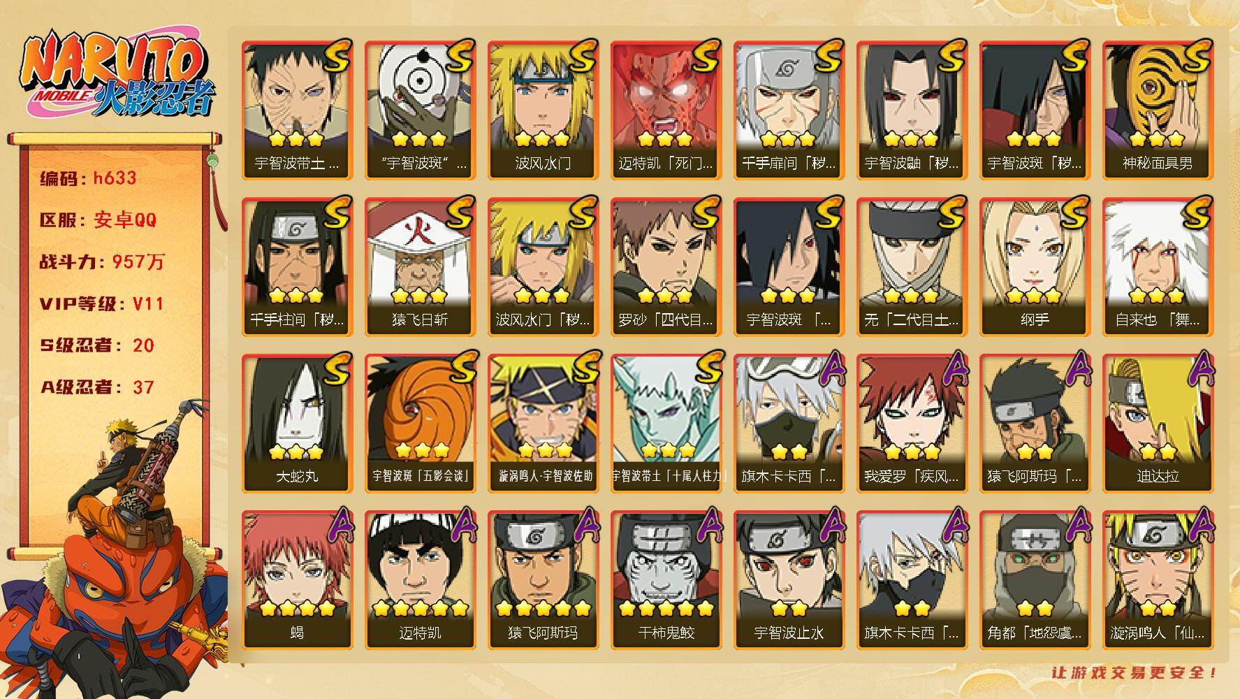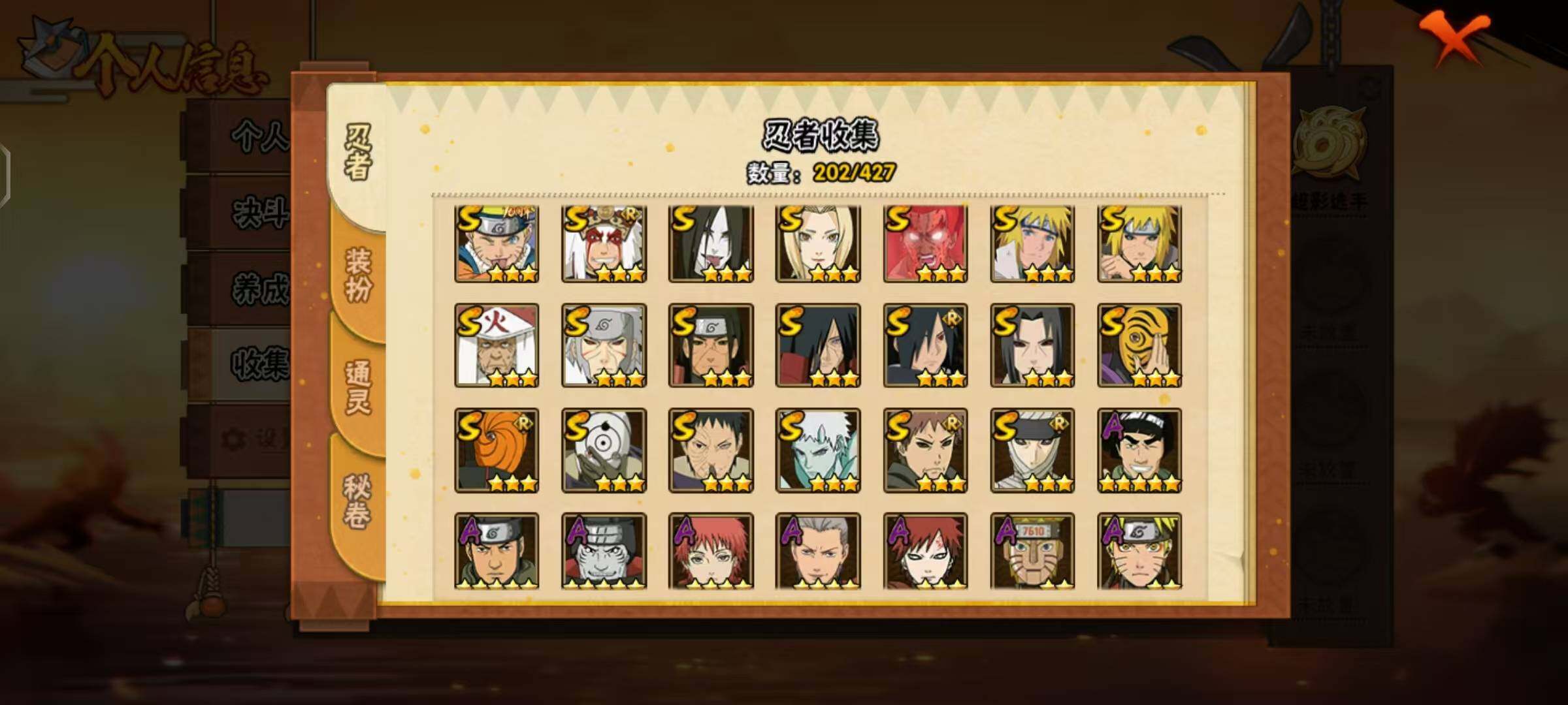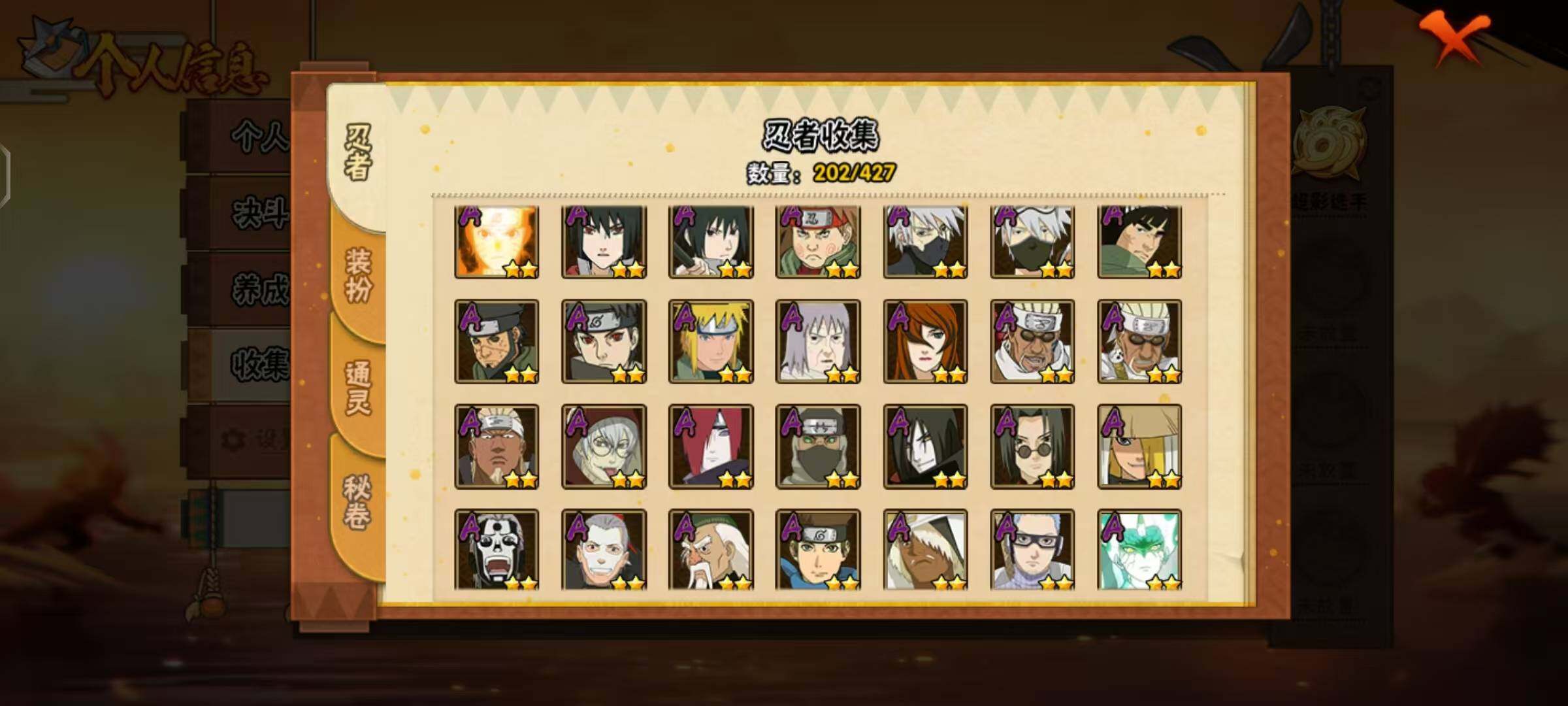 【A级忍者】:艾「青年」(2星),长门「青年」(2星),波风水门「青年」(2星),达鲁伊「博人传」(2星),迪达拉(2星),大蛇丸「晓」(2星),奇拉比(2星),奇拉比「忍界大战」(2星),飞段(4星),飞段「死司凭血」(2星),飞段「恶灵之影」(2星),干柿鬼鲛(5星),漩涡鸣人「仙人模式」(2星),漩涡鸣人「九尾查克拉」(2星),机械鸣人「初始形态」(2星),迈特凯(5星),旗木卡卡西「元气夏日」(2星),旗木卡卡西「万花筒写轮眼」(2星),我爱罗「疾风传」(3星),蝎(4星),角都「地怨虞」(2星),猿飞阿斯玛(5星),猿飞阿斯玛「秽土转生」(2星),宇智波止水(2星),宇智波鼬「新春限定」(2星),宇智波佐助「须佐能乎」(2星),宇智波佐助「万花筒写轮眼」(2星),药师兜「半蛇斗篷」(2星),照美冥「五代目水影」(2星),长十郎「六代目水影」(2星),猿飞木叶丸「博人传」(2星),黑土「博人传」(2星),秋道丁次「忍界大战」(2星),千代「近松十人卫」(2星),大野木「侠隐江湖」(2星),巳月「仙人模式」(2星),迈特凯「青春爆炸」(2星)