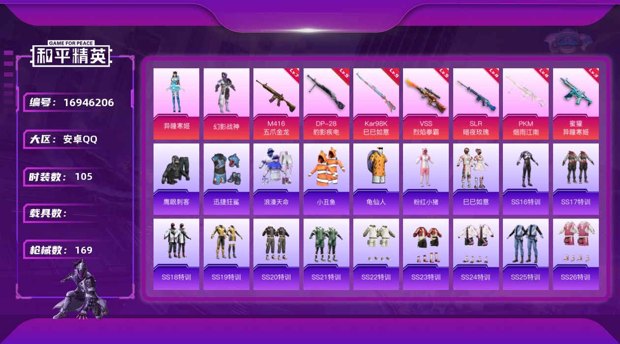 [16946206]安卓 手Q-2粉装-7特效枪-0载具-0粉色飞行器-50083热力值-12王牌印记-105套装-169枪皮