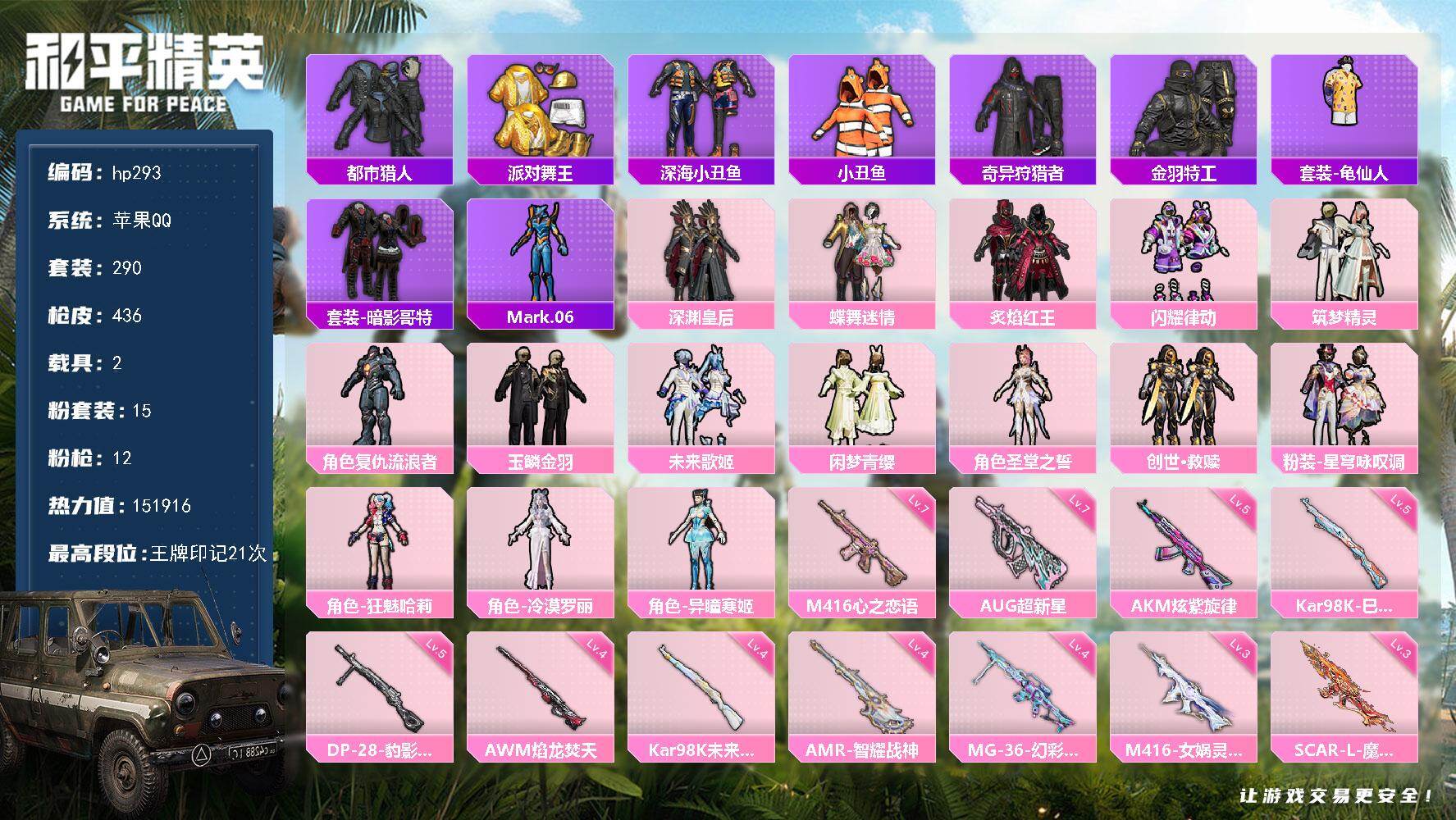- [15775772]苹果 手Q-无敌战神框-7粉装-7特效枪-3载具-1粉色飞行器-65785热力值-15王牌印记-160套装-198枪皮 【热门品类】:粉装-缤纷油彩,绝对防御上衣,套装-浪漫天命,套装-深海小丑鱼,套装-小丑鱼,套装-奇异狩猎者,角色-军刀雅典娜,套装-天网终结者,套装-金羽特工,旭日初心兜帽大衣,套装-粉红小猪 【粉色载具】:保时捷918 Spyder(液态银),鬼马风驰,冰绡玉鳞 【粉色套装】:粉装-缤纷油彩,粉装-苍蓝魅影,角色-零号机款机体服,粉装-星穹咏叹调,角色-狂魅哈莉,角色-绯穹魔姬,角色-冰魄 【粉色枪皮等级】:AKM-梦之光华(四级),M416-心之恋语(六级),AUG-圣斗士星矢(七级),Mk14-甜梦熊击(五级),AMR-智耀战神(五级),DP-28-豹影疾电(五级),MG-36-幻彩电音(五级) 【粉色枪皮】:AKM-梦之光华,M416-心之恋语,AUG-圣斗士星矢,Mk14-甜梦熊击,AMR-智耀战神,DP-28-豹影疾电,MG-36-幻彩电音 【粉色飞行器】:灵珠游龙飞行器 【粉色降落伞】:繁花小夜曲降落伞,环太平洋降落伞,未来歌姬降落伞,智耀战神降落伞,幻彩电音降落伞,双重狂想降落伞,绯穹魔姬降落伞,无垠阁降落伞,魔童闹海 敖丙降落伞 【稀有套装】:套装-粉恋花,套装-紫幽梦,套装-蓝冰羽,套装-霓虹热舞,套装-极速光影,套装-彩虹兔,套装-云朵鹅,套装-雪绒豹,套装-诡诞巡游,角色-绛羽幽主,套装-朱霞炽焰,套装-凌霄紫焰,套装-擎苍青焰,角色-申公豹 【稀有枪皮】:AKM-PEL轰鸣竞梦者,AKM-夜灯,AKM-灼热熔岩,AKM-玉龙,AKM-萌趣颜团子,AKM-霓虹街区,AKM-龙的传人,M16A4-机械英豪,M16A4-莲影清波,SCAR-L-炫彩节奏,SCAR-L-王牌四分卫,SCAR-L-红色方程式,SCAR-L-黄金龙骨,M416-夜灯,M416-神秘黑猫,M416-红色方程式,GROZA-彩虹符号,GROZA-懵萌河马,GROZA-治愈之星,GROZA-黑色刀锋,AUG-炫光贝贝,AUG-终结者,AUG-青春冒险家,QBZ-原初圣火,QBZ-彩虹符号,QBZ-未来歌姬,M762-奇异狩猎者,M762-牛气冲天,M762-绯红前夜,M762-镭射皇者,M762-云朵鹅,Mk47-百万伏特,Mk47-青春冒险家,G36C