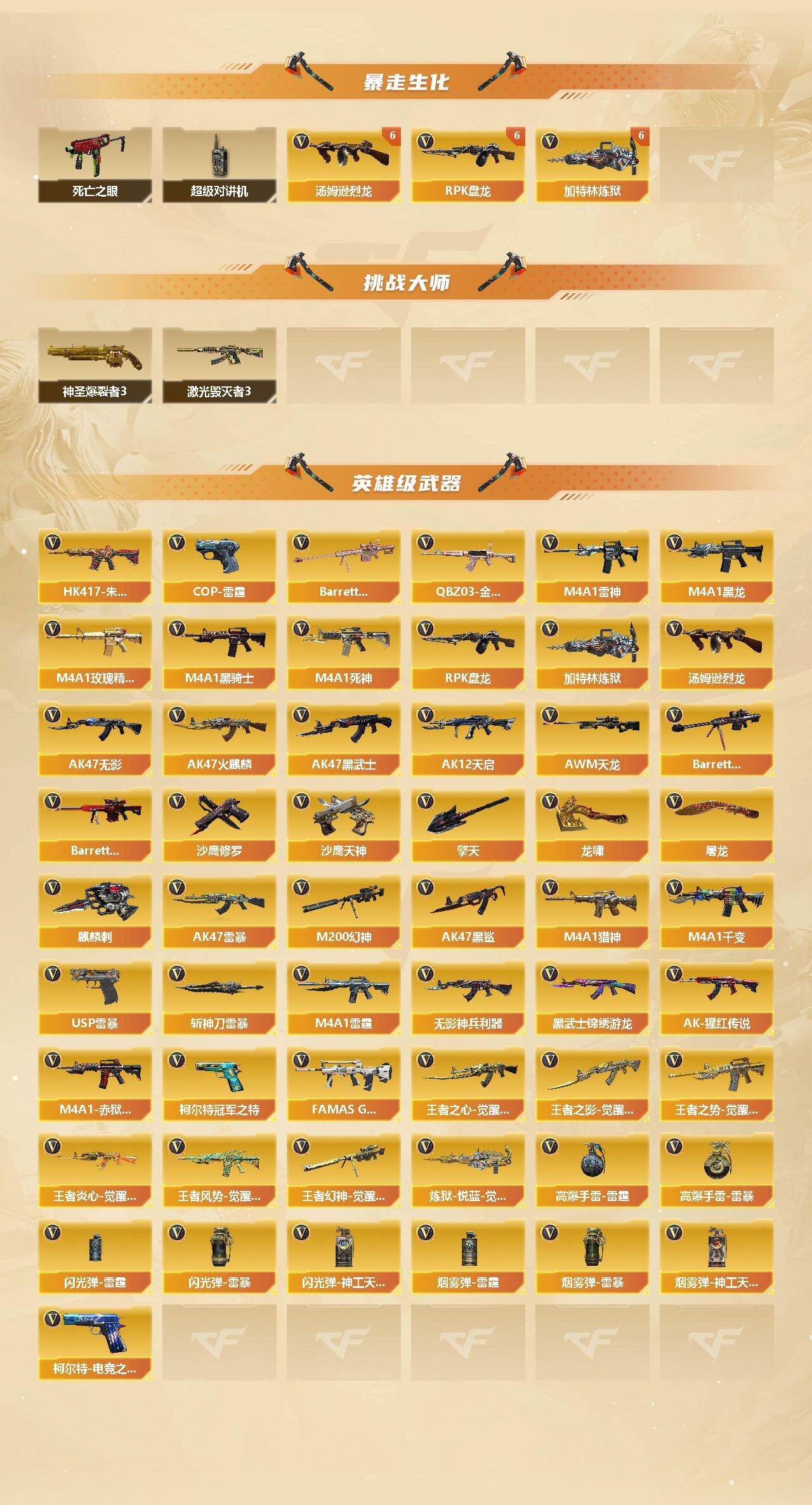 【英雄级武器】:M4A1-千变,AK47-火麒麟*3,M4A1-黑龙*4,M4A1-雷神*6,M4A1-黑骑士*4,AK47-无影,M4A1-死神*2,AK47-黑武士*2,AK12-天启*3,AK47-黑鲨,M4A1-雷霆,AK47-雷暴,HK417-朱雀,无影-神兵利器,黑武士-锦绣游龙,FAMAS G2-天戎,M4A1-玫瑰精灵,QBZ03-金色蔷薇,M4A1-猎神,王者之心-觉醒版,王者之影-觉醒版,王者之势-觉醒版,AK-47-猩红传说,王者炎心-觉醒版,王者风势-觉醒版,AWM-天龙*2,Barrett-毁灭*5,Ba