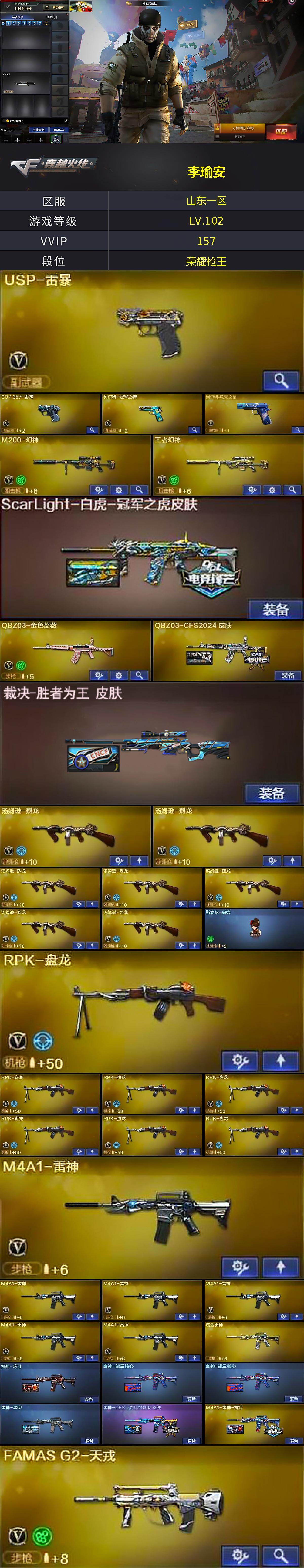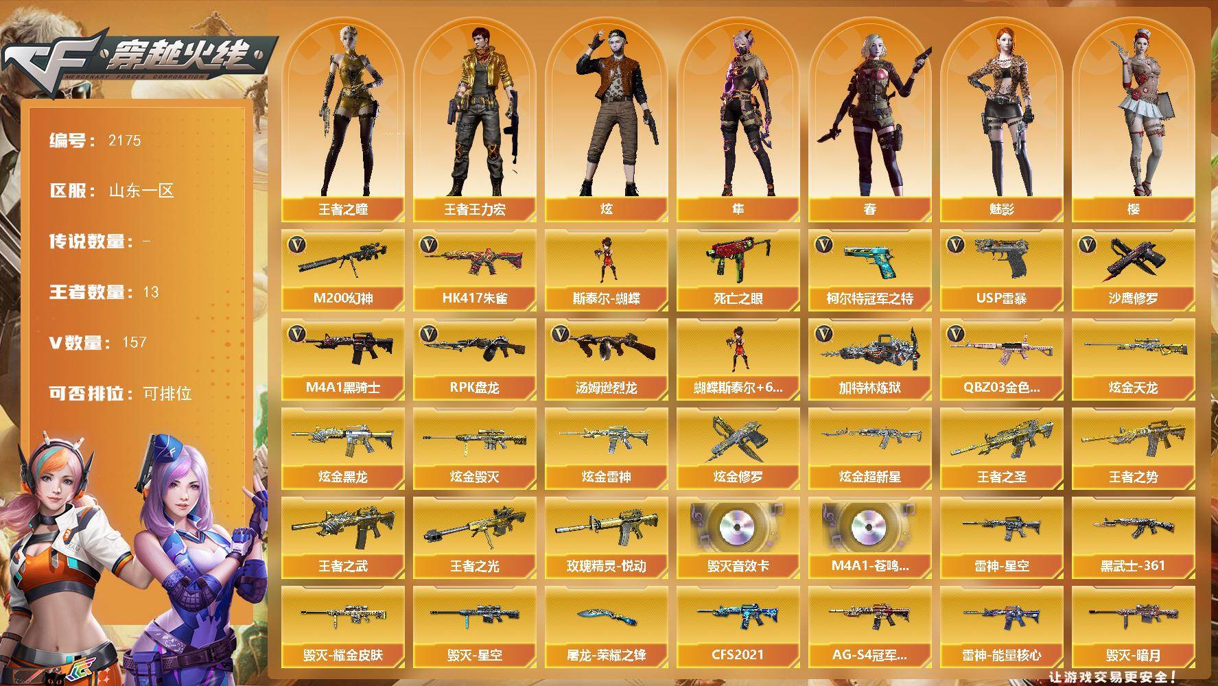 [16946898]山东一区-170V-13王者武器数-7炫金武器数 【热门武器】:QBZ03-金色蔷薇,HK417-朱雀,M200-幻神,死亡之眼*6,柯尔特-冠军之特,M4A1-黑骑士*4,汤姆逊-烈龙*7,RPK-盘龙*7,加特林-炼狱*6,斯泰尔-蝴蝶,USP-雷暴,沙鹰-修罗*6 【王者炫金武器】:王者之圣,王者之势,王者之武,玫瑰精灵-悦动*2,王者之光,炫金黑龙,炫金雷神,炫金超新星*2,炫金毁灭,炫金天龙,炫金修罗 【音效卡】:Barrett-毁灭音效卡,M4A1-苍鸣雷神音效卡 【皮肤】:ScarLight-白虎-冠军之虎皮肤,QBZ03-CFS2024 皮肤,裁决-胜者为王 皮肤,雷神-暗月,雷神-能量核心*2,雷神-星空,雷神-CFS十周年纪念版 皮肤,M4A1-雷神-拼搏,火麒麟-傲竹金蛇 皮肤,毁灭-暗月,毁灭耀金皮肤,毁灭-星空,毁灭-英雄计划 皮肤,黑骑士-CFS2021,黑骑士-AG-S4冠军典藏,无影-暗月,无影-能量核心,AK47-黑武士-361,天启-暗月*2,天龙-秘银*2,天龙-能量核心,AWM-天龙-传奇白鲨,极光-能量核心,极光-掌火灵耀 皮肤,修罗-能量核心,屠龙-荣耀之锋,擎天-秘银 【角色】:零,葵,樱,魅影,炫,春,隼,王者之瞳,王者王力宏,空,兰-海滩派对,兰-新年限定,零-水下丽影,灵狐者-黄金海岸,潘多拉-甜心教官,蛇姬,铁骑荣耀,兔囡囡,影武者-X,海豹突击队 【人偶武器】:火麒麟-灵狐,异变清道夫-蛇影双骄,斯泰尔-蝴蝶,Scar Light-马枪,COP-旗袍,迷你牛牛,迷你生化手雷*2,深渊终结者手雷 【暴走生化】:死亡之眼*6,超级对讲机 【挑战大师】:神圣爆裂者III,激光毁灭者III 【英雄级武器】:M4A1-千变,AK47-火麒麟*3,M4A1-黑龙*4,M4A1-雷神*6,M4A1-黑骑士*4,AK47-无影,M4A1-死神*2,AK47-黑武士*2,AK12-天启*3,AK47-黑鲨,M4A1-雷霆,AK47-雷暴,HK417-朱雀,无影-神兵利器,黑武士-锦绣游龙,FAMAS G2-天戎,M4A1-玫瑰精灵,QBZ03-金色蔷薇,M4A1-猎神,王者之心-觉醒版,王者之影-觉醒版,王者之势-觉醒版,AK-47-猩红传说,王者炎心-觉醒版,王者风势-觉醒版,AWM-天龙*2,Barrett-毁灭*5,Ba