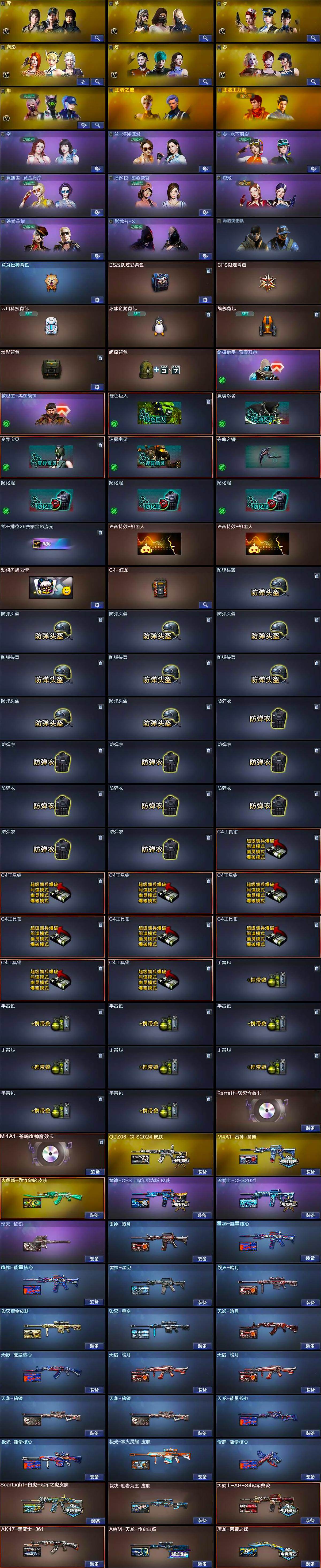 【皮肤】:ScarLight-白虎-冠军之虎皮肤,QBZ03-CFS2024 皮肤,裁决-胜者为王 皮肤,雷神-暗月,雷神-能量核心*2,雷神-星空,雷神-CFS十周年纪念版 皮肤,M4A1-雷神-拼搏,火麒麟-傲竹金蛇 皮肤,毁灭-暗月,毁灭耀金皮肤,毁灭-星空,毁灭-英雄计划 皮肤,黑骑士-CFS2021,黑骑士-AG-S4冠军典藏,无影-暗月,无影-能量核心,AK47-黑武士-361,天启-暗月*2,天龙-秘银*2,天龙-能量核心,AWM-天龙-传奇白鲨,极光-能量核心,极光-掌火灵耀 皮肤,修罗-能量核心,屠龙-荣耀之锋,擎天-秘银