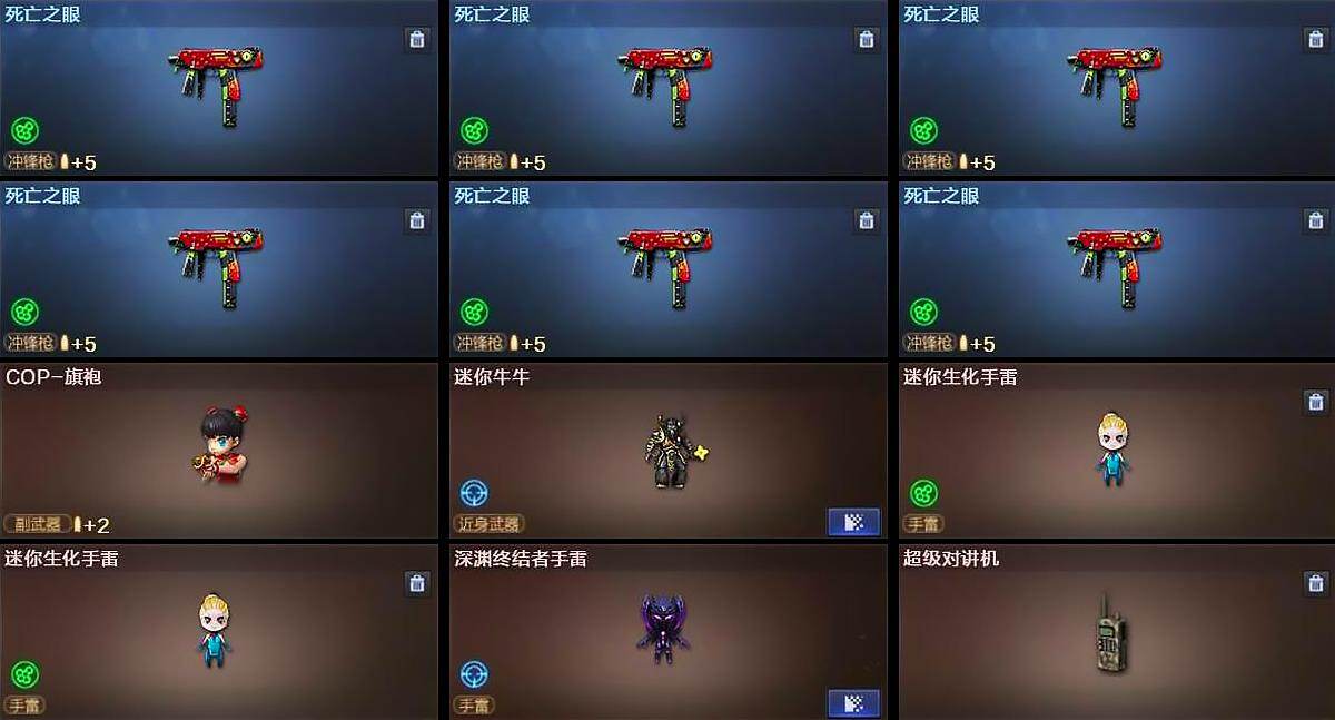 【人偶武器】:火麒麟-灵狐,异变清道夫-蛇影双骄,斯泰尔-蝴蝶,Scar Light-马枪,COP-旗袍,迷你牛牛,迷你生化手雷*2,深渊终结者手雷