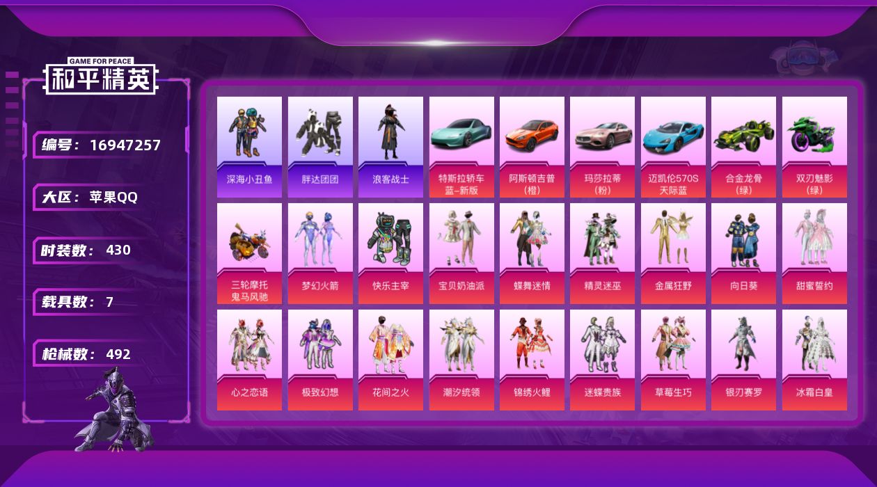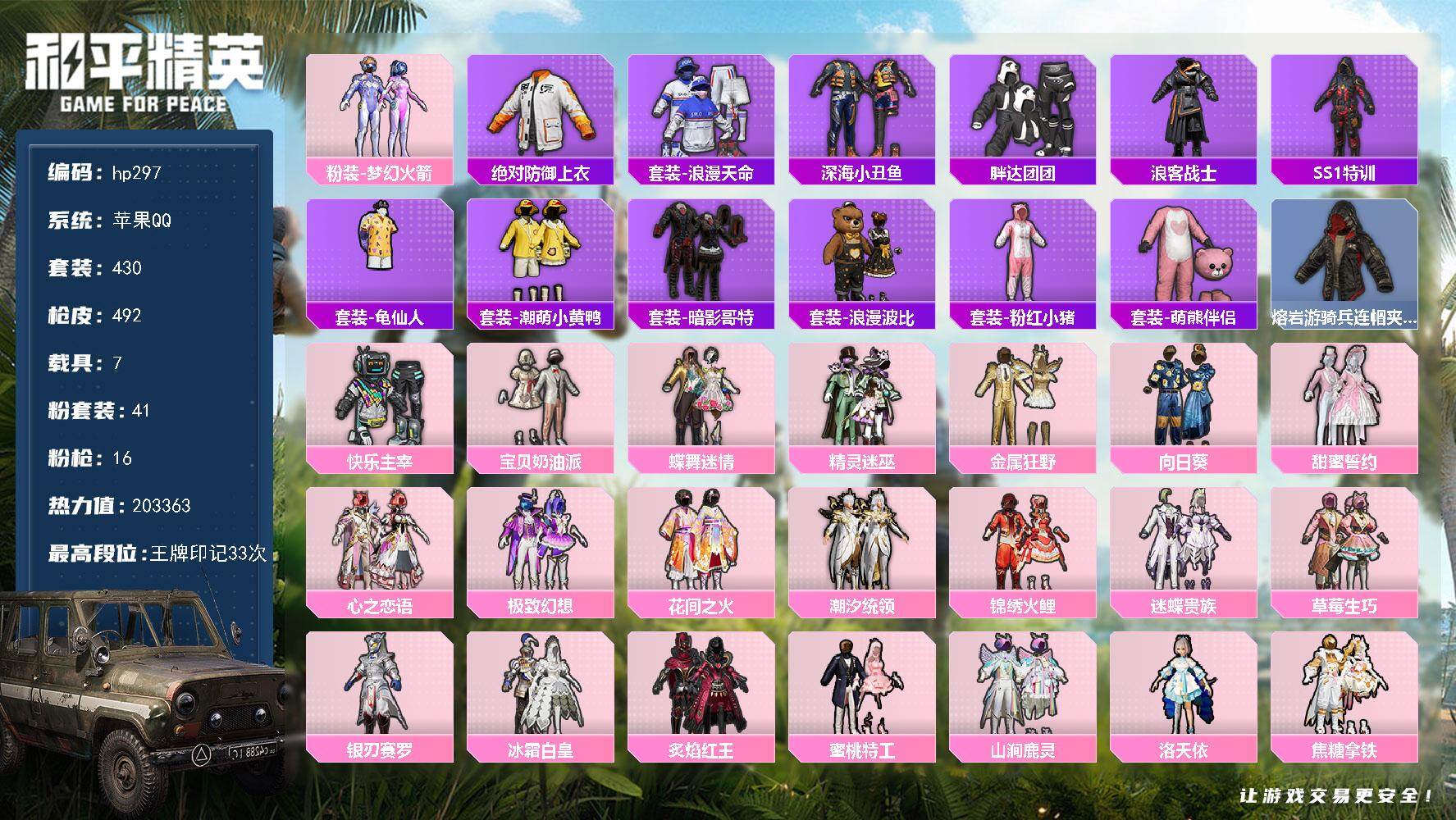 [16947257]苹果 手Q-41粉装-16特效枪-7载具-12粉色飞行器-203363热力值-33王牌印记-430套装-492枪皮