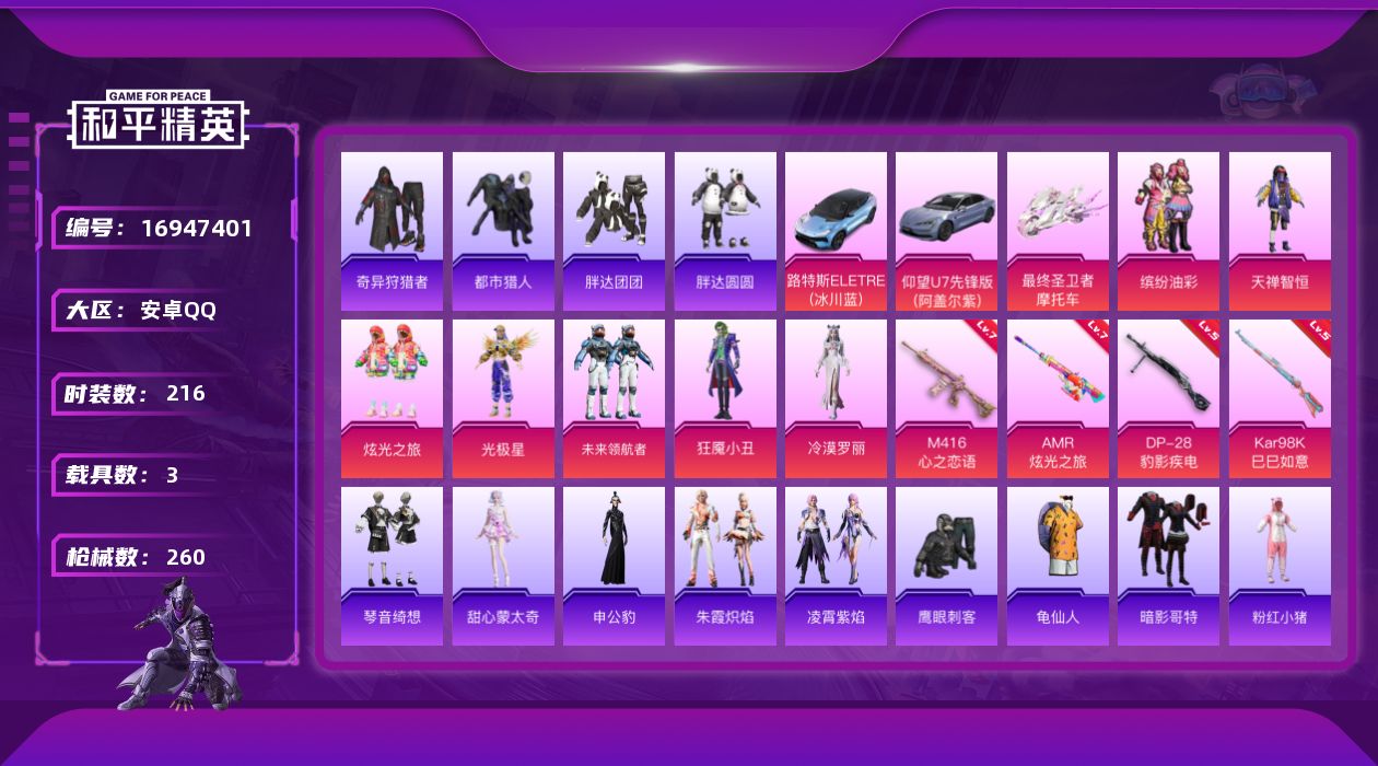 [16947401]安卓 手Q-8粉装-5特效枪-3载具-4粉色飞行器-82997热力值-15王牌印记-216套装-260枪皮 【热门品类】:粉装-缤纷油彩,套装-都市猎人,套装-奇异狩猎者,套装-胖达团团,套装-胖达圆圆,套装-龟仙人,套装-暗影哥特,套装-粉红小猪 【粉色套装】:粉装-缤纷油彩,粉装-天禅智恒,粉装-炫光之旅,角色-光极星,粉装-未来领航者,角色-狂魇小丑,角色-冷漠罗丽,角色-罪夜之冕 【粉色枪皮等级】:M416-心之恋语(七级),Kar98K-巳巳如意(五级),AMR-炫光之旅(七级),DP-28-豹影疾电(五级) 【粉色载具】:路特斯ELETRE(冰川蓝),仰望U7(阿盖尔紫),最终圣卫者摩托车 【粉色枪皮】:M416-心之恋语,Kar98K-巳巳如意,Mk14-福马献瑞,AMR-炫光之旅,DP-28-豹影疾电 【粉色飞行器】:炫彩糖果飞行器,天之羽翼飞行器,电糖天使飞行器,终晖之翼飞行器 【粉色降落伞】:幻影战神降落伞,夏日绵绵冰降落伞,炫光之旅降落伞,圣堂之誓降落伞,电糖天使降落伞,精灵梦叶罗丽降落伞,时光之誓降落伞,最终圣卫者降落伞,冷漠罗丽降落伞,绯月迷踪降落伞,炫彩糖果降落伞 【稀有套装】:套装-龟仙人,套装-巳巳如意,角色-甜心蒙太奇,套装-雪国风尚,套装-炫彩糖果,套装-雏菊兔兔,套装-萝兰蝴蝶,套装-小熊娃娃,套装-糖糖葫芦,套装-青团波波,套装-棉花软糖,角色-摩登魅猫,套装-燕燕于飞,套装-鱼渊荷华,套装-粉恋花,套装-紫幽梦,套装-蓝冰羽,角色-瑰梦爱神,套装-彩虹兔,套装-云朵鹅,套装-雪绒豹,角色-乐音,角色-黯羽织刑,角色-夜瞳黯灵,套装-朱霞炽焰,套装-凌霄紫焰,角色-申公豹,套装-琴音绮想 【稀有枪皮】:AKM-奇异狩猎者,AKM-彩虹符号,AKM-影袭,AKM-破晓战魂,AKM-虎虎生威,AKM-霓虹街区,AKM-龙的传人,M16A4-幻世战舞者,M16A4-甜心亚梦,M16A4-蓝色火焰,M16A4-最终圣卫者,SCAR-L-夜灯,SCAR-L-玉兔迎春,SCAR-L-金风玉露,SCAR-L-银碳小老虎,SCAR-L-青丘仙客,SCAR-L-绯月迷踪,SCAR-L-冷漠罗丽,M416-暗夜行者,M416-糯团青竹,M416-红色方程式,M416-绯红前夜,M416-蓝色火焰,GROZA-影袭,GROZA-懵萌河马,GROZ