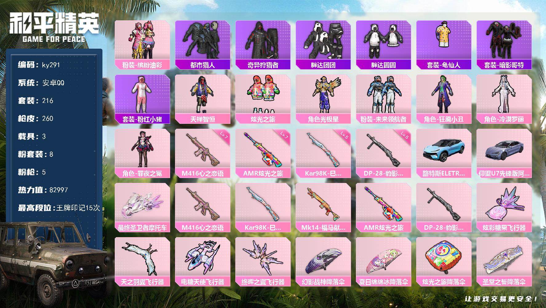 [16947401]安卓 手Q-8粉装-5特效枪-3载具-4粉色飞行器-82997热力值-15王牌印记-216套装-260枪皮