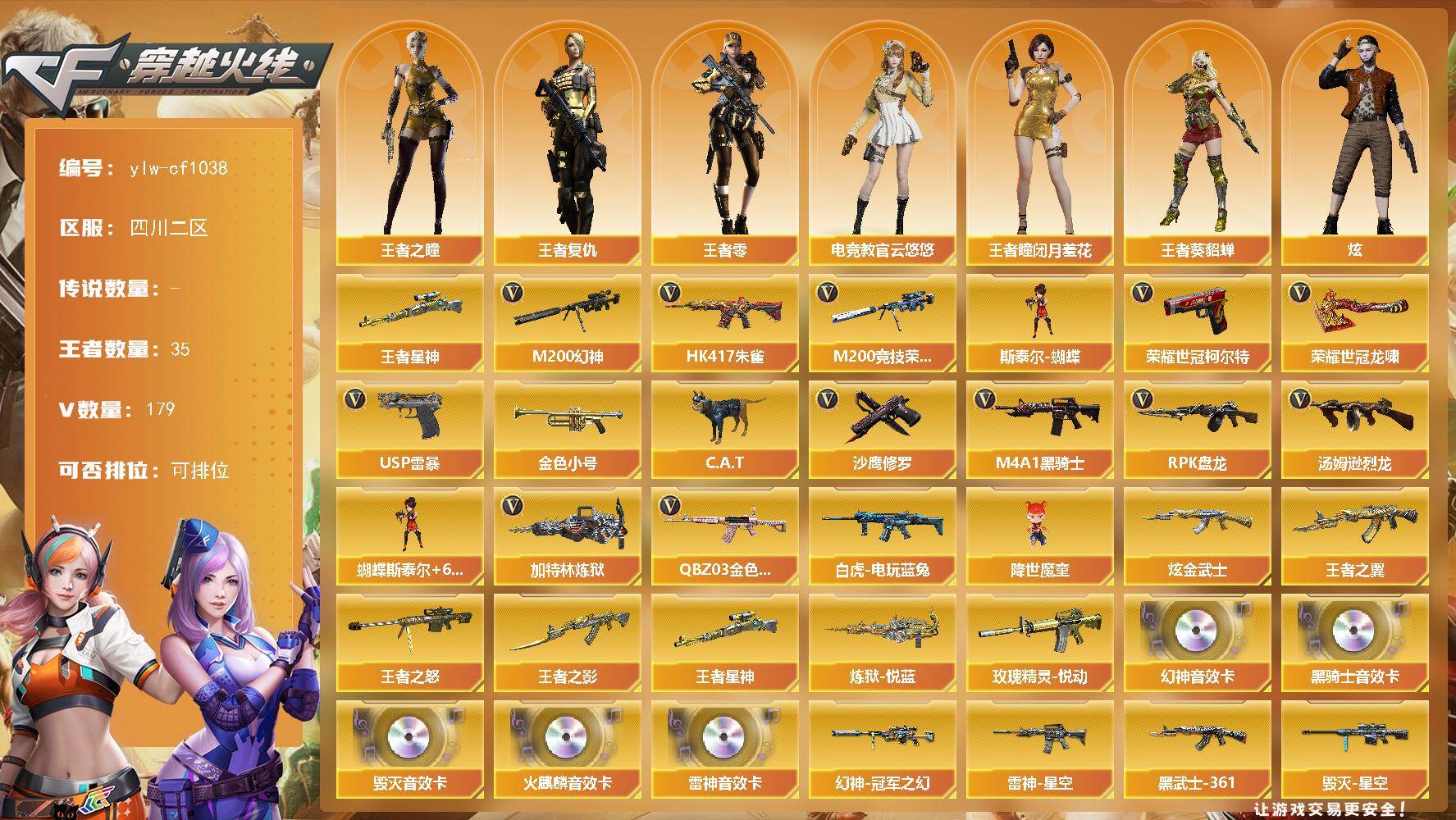 [16947417]四川二区-179V-35王者-1炫金 【热门武器】:王者星神,QBZ03-金色蔷薇*2,HK417-朱雀,M200-幻神,M200-竞技荣光,白虎-电玩蓝兔,荣耀世冠-柯尔特,金色小号,C.A.T,M4A1-黑骑士*4,汤姆逊-烈龙*9,RPK-盘龙*8,加特林-炼狱*4,斯泰尔-蝴蝶,降世魔童,USP-雷暴,沙鹰-修罗*2,荣耀世冠-龙啸 【王者炫金武器】:炫金武士,炼狱-悦蓝*2,王者之翼,玫瑰精灵-悦动,王者之影,王者之怒,王者星神 【音效卡】:M200-幻神音效卡,AK47-火麒麟音效卡,M4A1-雷神音效卡,M4A1-黑骑士音效卡,Barrett-毁灭音效卡 【稀有皮肤】:幻神-冠军之幻,雷神-能量核心*2,雷神-星空,雷神-虎将,火麒麟-平天大圣,火麒麟-心动糖果,黑骑士-暗月,黑骑士-摸金校尉,毁灭-暗月*2,毁灭-星空,毁灭-战神张飞,毁灭-黑大圣皮肤,毁灭-风暴,天龙-秘银,天龙-能量核心,AK47-黑武士-361,修罗-星空,天神-暗月*5,屠龙-荣耀世冠AG 【角色】:王者-瞳-闭月羞花,王者-葵-貂蝉,王者-零,王者之瞳,王者复仇,零-水下丽影,电竞教官-云悠悠,葵,樱,瞳,炫,蜀雪,狐影,雅典娜,铁骑荣耀,月兔特工,职业选手,堕落女神,青霞仙子 【人偶武器】:降世魔童,斯泰尔-蝴蝶,巴雷特-零-水下丽影,AWM-灵狐-15周年嘉年华,M37-葵,C.A.T,黄金迷你深渊冰龙,迷你深渊冰龙,迷你艾比,迷你超能女侍,迷你裂空之翼,迷你牛魔王,迷你波特博士,夺魂,迷你牛牛*2,迷你生化手雷,生化手雷-机甲核心,深渊终结者手雷,闪光弹-貂蝉,高爆手雷-大乔 【暴走生化】:斯泰尔-蝴蝶,超级对讲机 【挑战大师】:神圣爆裂者III,神圣爆裂者-末日III,阐释者III,激光毁灭者III,激光毁灭者III-白马银枪,冰龙粉碎者-白马银枪 【英雄级武器】:M200-竞技荣光,柯尔特-竞技荣光,擎天-竞技荣光,高爆手雷-竞技荣光,烟雾弹-竞技荣光,闪光弹-竞技荣光,幻灵之锋,USP-雷暴,M4A1-雷霆,M4A1-武圣*2,Glock18-武圣,荣耀世冠-柯尔特,荣耀世冠-龙啸,烈火-动感闪耀,天神-动感闪耀,屠龙-动感闪耀,手雷-动感闪耀,QBZ03-金色蔷薇*2,HK417-朱雀,白虎-电玩蓝兔,无影-神兵利器,M4A1-雷神*4,M4A1-黑龙*2,
