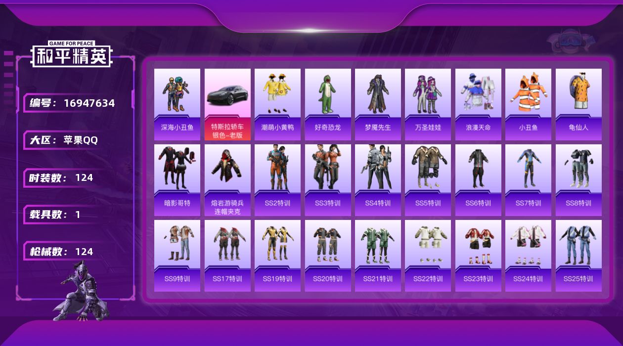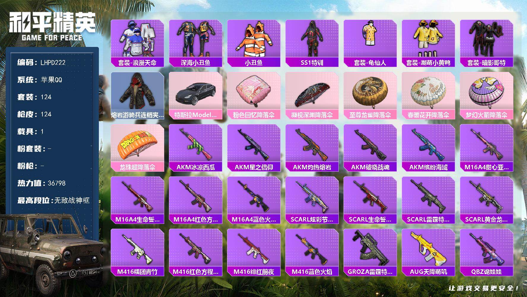 [16947634]【特价出售/苹果 手Q-无敌战神框-0粉装-0特效枪-1载具-0粉色飞行器-36798热力值-9王牌印记-124套装-124枪皮【热门品类】:套装-浪漫天命,套装-深海小丑鱼,套装-小丑鱼,套装-SS1特训,套装-龟仙人,套装-潮萌小黄鸭,套装-暗影哥特,熔岩游骑兵连帽夹克【粉色载具】:特斯拉Model 3(冷光银)