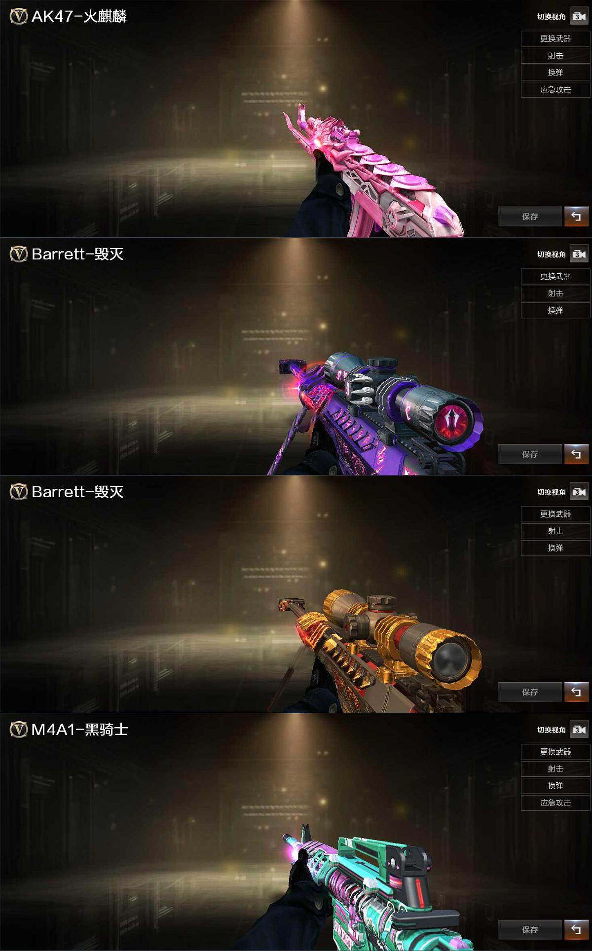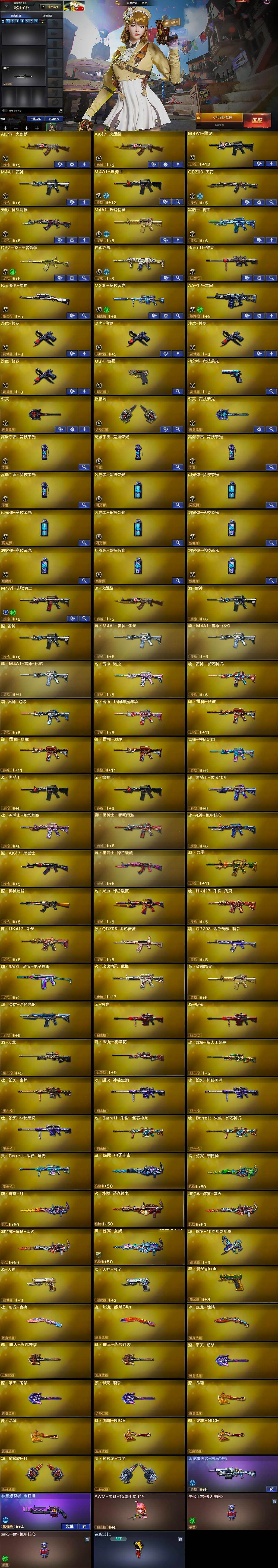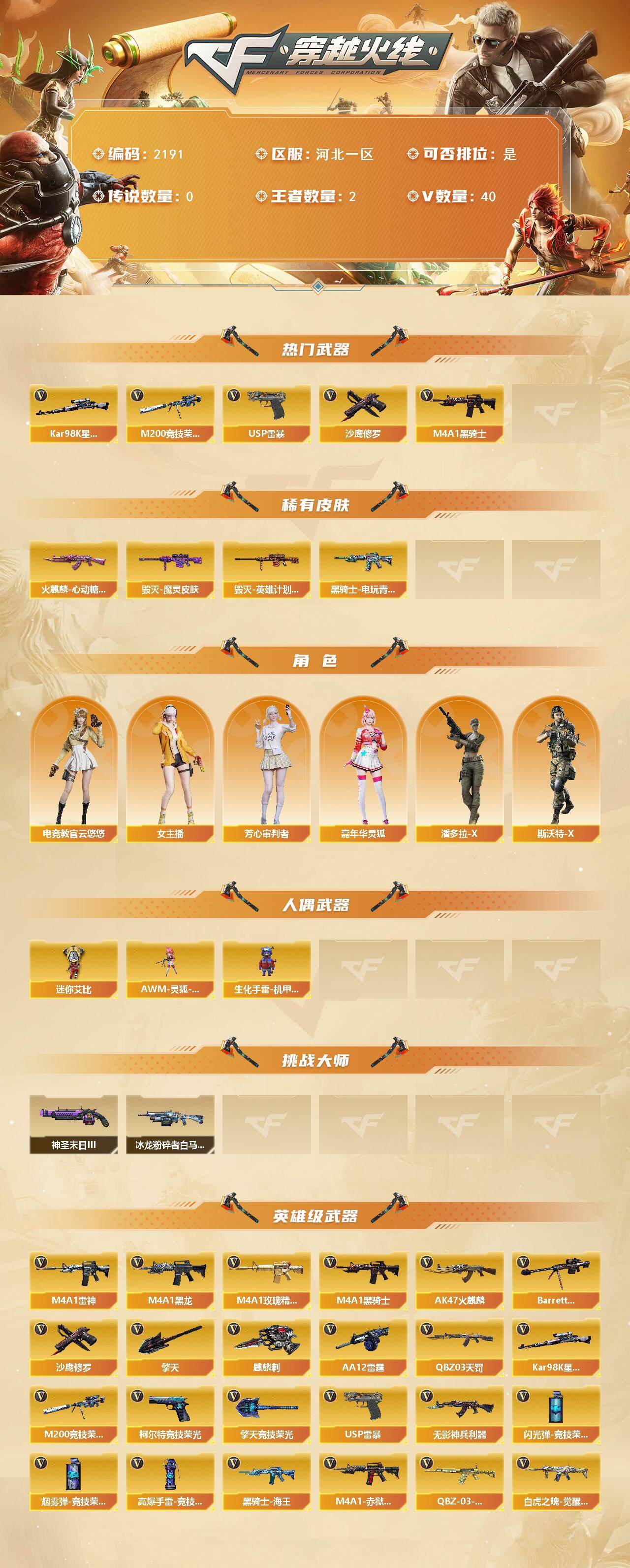 【英雄级武器】:AK47-火麒麟*2,M4A1-黑龙,M4A1-雷神,M4A1-黑骑士,QBZ03-天罚,无影-神兵利器,M4A1-玫瑰精灵,黑骑士-海王,QBZ-03-王者蔷薇-觉醒版,白虎之魄-觉醒版,Barrett-毁灭,Kar98K-星神,M200-竞技荣光,AA-12-雷霆,沙鹰-修罗*4,USP-雷暴,柯尔特-竞技荣光,擎天,麒麟刺,擎天-竞技荣光,高爆手雷-竞技荣光*4,闪光弹-竞技荣光*4,烟雾弹-竞技荣光*4,M4A1-赤狱骑士