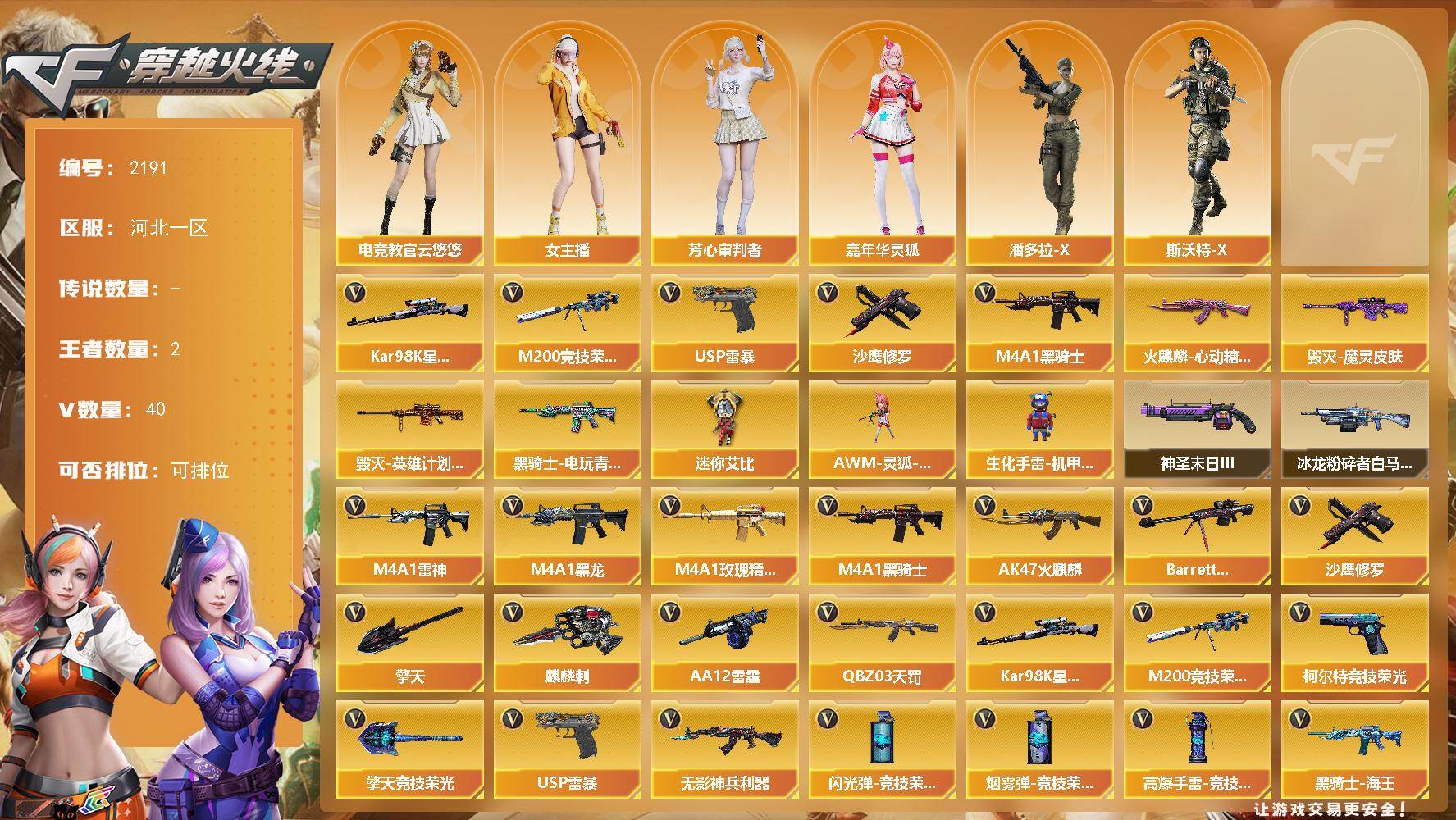 [16948093]河北一区-42V-2王者武器数-0炫金武器数 【热门武器】:M200-竞技荣光,Kar98K-星神,M4A1-黑骑士,USP-雷暴,沙鹰-修罗*4 【皮肤】:火麒麟-心动糖果,毁灭-魔灵皮肤,毁灭-英雄计划 皮肤,黑骑士-电玩青兔皮肤 【角色】:电竞教官-云悠悠,芳心审判者,嘉年华灵狐,女主播,潘多拉-X,斯沃特-X 【人偶武器】:AWM-灵狐-15周年嘉年华,生化手雷-机甲核心*2,迷你艾比 【挑战大师】:冰龙粉碎者-白马银枪,神圣爆裂者-末日III 【英雄级武器】:AK47-火麒麟*2,M4A1-黑龙,M4A1-雷神,M4A1-黑骑士,QBZ03-天罚,无影-神兵利器,M4A1-玫瑰精灵,黑骑士-海王,QBZ-03-王者蔷薇-觉醒版,白虎之魄-觉醒版,Barrett-毁灭,Kar98K-星神,M200-竞技荣光,AA-12-雷霆,沙鹰-修罗*4,USP-雷暴,柯尔特-竞技荣光,擎天,麒麟刺,擎天-竞技荣光,高爆手雷-竞技荣光*4,闪光弹-竞技荣光*4,烟雾弹-竞技荣光*4,M4A1-赤狱骑士 【道具】:BS战队炫彩背包,云山科技背包,亚洲杯纪念炫彩背包,全能枪王背包,炫彩背包,超级背包,绿色巨人,灵魂忍者,迷雾幽灵,夺命之镰,防化服*3,金色流光-枪王排位*2,星辰流光-枪王排位,巅峰赛先锋-金色流光,枪王排位28赛季金色流光,枪王排位29赛季金色流光,防弹头盔*5,防弹衣*5,C4工具钳*5,手雷包*5 【特殊枪械】:1黑骑士
