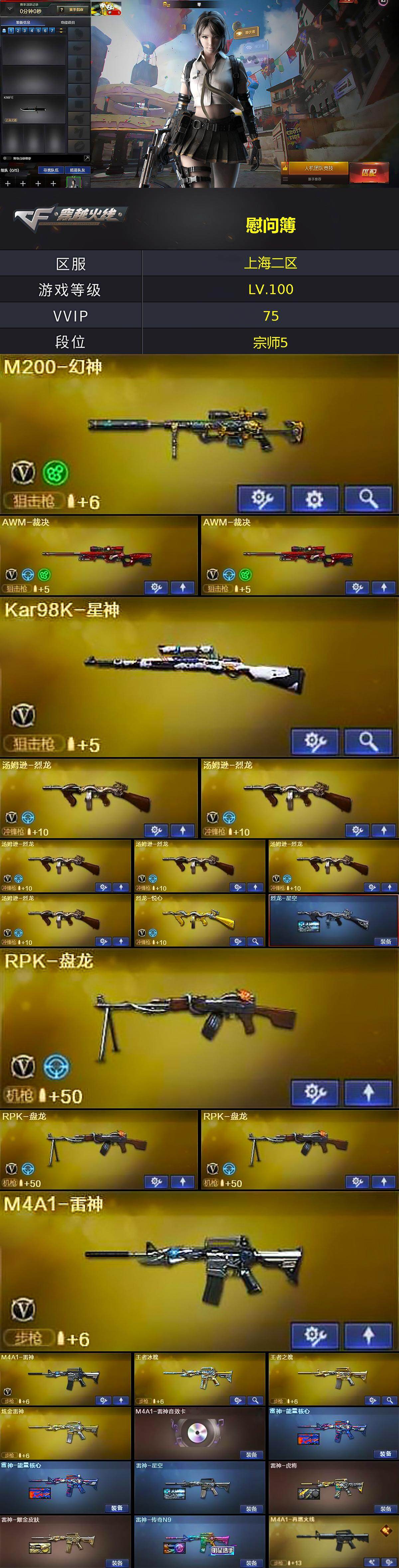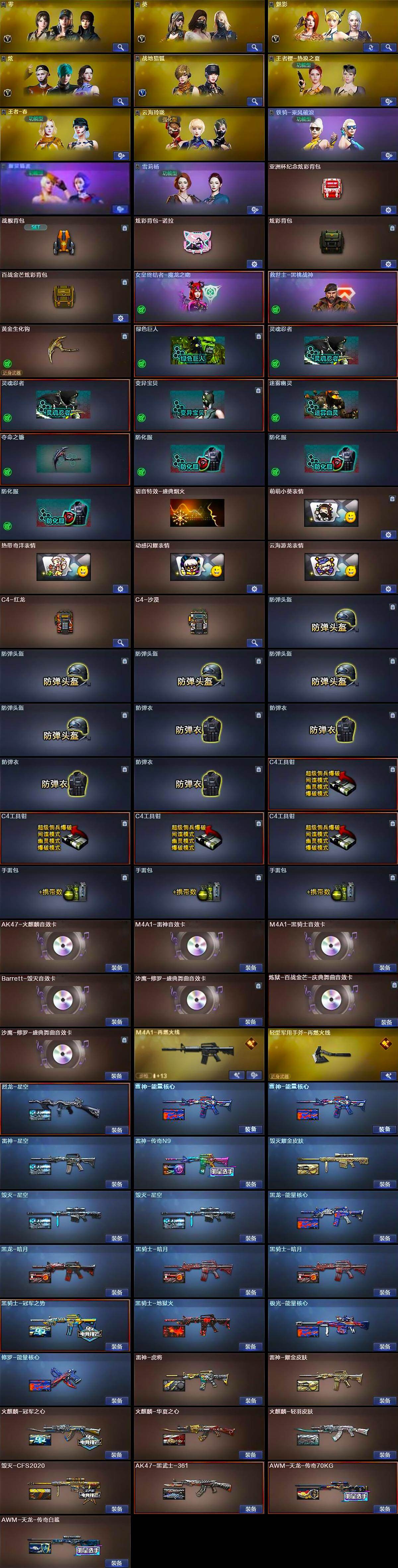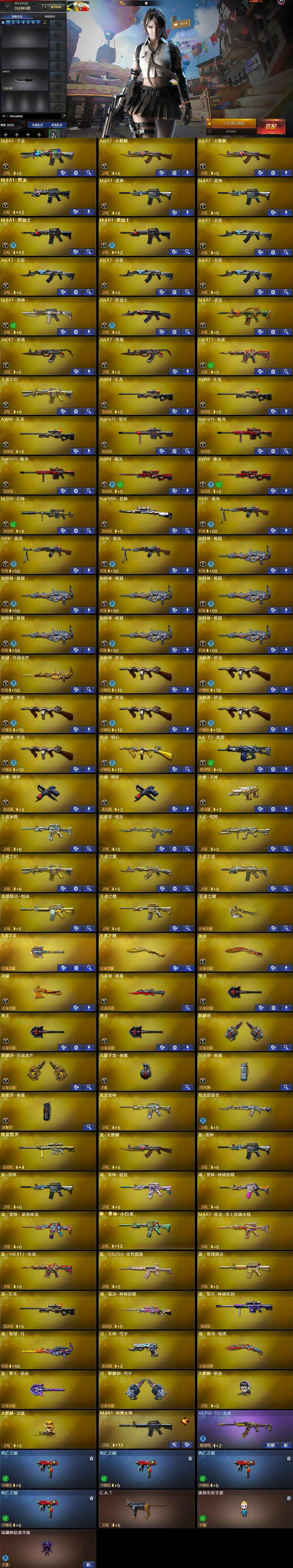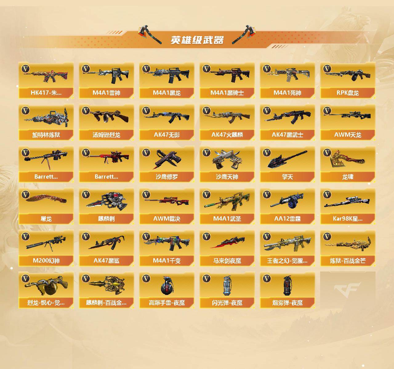 【英雄级武器】:M4A1-千变,AK47-火麒麟*2,M4A1-黑龙,M4A1-雷神*2,M4A1-黑骑士*2,AK47-无影*4,M4A1-死神,AK47-黑武士,M4A1-武圣,AK47-黑鲨*2,HK417-朱雀,王者之幻-觉醒版,AWM-天龙*3,Barrett-毁灭,Barrett-极光*2,AWM-裁决*2,M200-幻神,Kar98K-星神,RPK-盘龙*3,加特林-炼狱*7,炼狱-百战金芒,汤姆逊-烈龙*6,烈龙-悦心-觉醒版,AA-12-雷霆,沙鹰-修罗*2,沙鹰-天神,屠龙,龙啸,马来剑-夜魔,擎天*3,麒麟刺,麒麟刺-百战金芒,高爆手雷-夜魔,闪光弹-夜魔,烟雾弹-夜魔