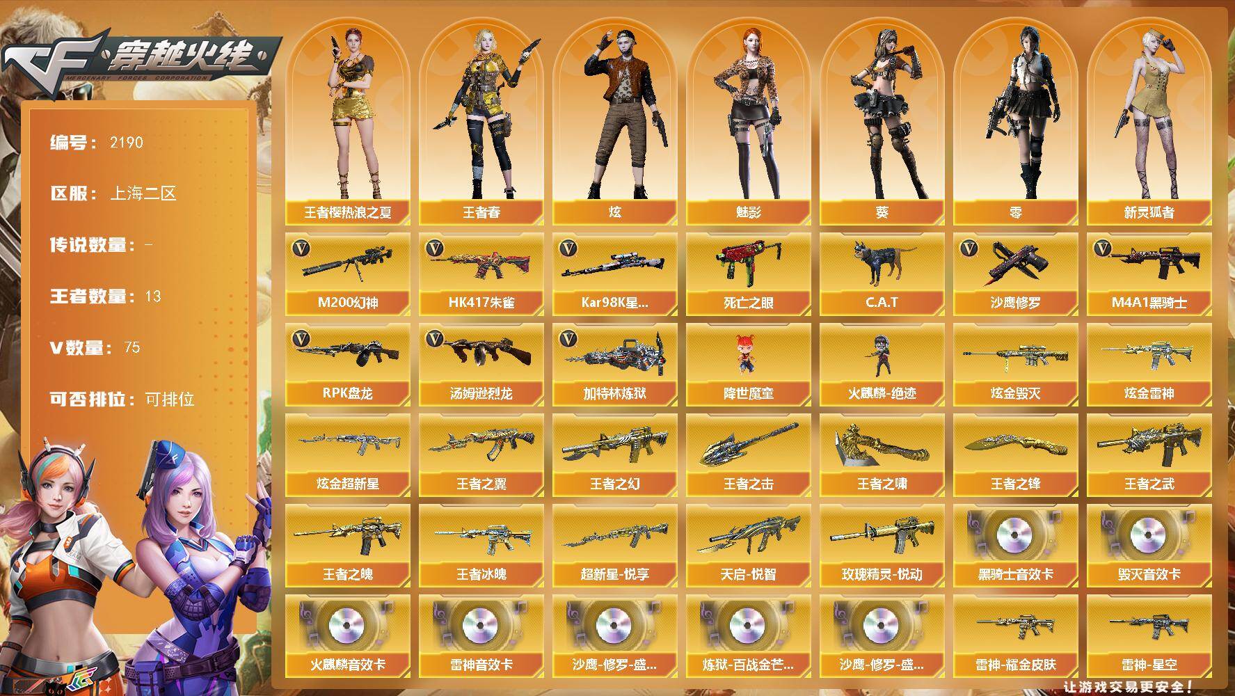 [16948251]上海二区-79V-13王者武器数-3炫金武器数 【热门武器】:HK417-朱雀,M200-幻神,死亡之眼*4,Kar98K-星神,C.A.T,M4A1-黑骑士*2,汤姆逊-烈龙*6,RPK-盘龙*3,加特林-炼狱*7,降世魔童,火麒麟-绝迹,沙鹰-修罗*2 【王者炫金武器】:王者冰魄,超新星-悦享,天启-悦智,王者之幻,王者之翼,王者之武,玫瑰精灵-悦动,王者之魄,王者之啸,王者之击,王者之锋,炫金雷神,炫金超新星,炫金毁灭 【音效卡】:AK47-火麒麟音效卡,M4A1-雷神音效卡,M4A1-黑骑士音效卡,Barrett-毁灭音效卡,沙鹰-修罗-盛典舞曲音效卡*2,炼狱-百战金芒-庆典舞曲音效卡 【皮肤】:烈龙-星空,雷神-能量核心*2,雷神-星空,雷神-虎将,雷神-耀金皮肤,雷神-传奇N9,M4A1-再燃火线,火麒麟-冠军之心,火麒麟-华夏之心,火麒麟-轻羽皮肤,毁灭耀金皮肤,毁灭-星空*2,毁灭-CFS2020,毁灭-英雄计划 皮肤,黑龙-能量核心,黑龙-暗月,黑骑士-暗月*2,黑骑士-冠军之势,黑骑士-地狱火,AK47-黑武士-361,AWM-天龙-传奇70KG,AWM-天龙-传奇白鲨,极光-能量核心,修罗-能量核心,轻型军用手斧-再燃火线 【角色】:零,葵,魅影,炫,战地猎狐,王者樱-热浪之夏,王者春,云海玲珑,铁骑-乘风破浪,新灵狐者,雪莉杨 【人偶武器】:火麒麟-绝迹,火麒麟-灵狐,C.A.T,迷你生化手雷,深渊终结者手雷,降世魔童 【暴走生化】:死亡之眼*4 【挑战大师】:VEPR-12-金魔 【英雄级武器】:M4A1-千变,AK47-火麒麟*2,M4A1-黑龙,M4A1-雷神*2,M4A1-黑骑士*2,AK47-无影*4,M4A1-死神,AK47-黑武士,M4A1-武圣,AK47-黑鲨*2,HK417-朱雀,王者之幻-觉醒版,AWM-天龙*3,Barrett-毁灭,Barrett-极光*2,AWM-裁决*2,M200-幻神,Kar98K-星神,RPK-盘龙*3,加特林-炼狱*7,炼狱-百战金芒,汤姆逊-烈龙*6,烈龙-悦心-觉醒版,AA-12-雷霆,沙鹰-修罗*2,沙鹰-天神,屠龙,龙啸,马来剑-夜魔,擎天*3,麒麟刺,麒麟刺-百战金芒,高爆手雷-夜魔,闪光弹-夜魔,烟雾弹-夜魔 【道具】:亚洲杯纪念炫彩背包,战舰背包,炫彩背包-诺拉,炫彩背包,百