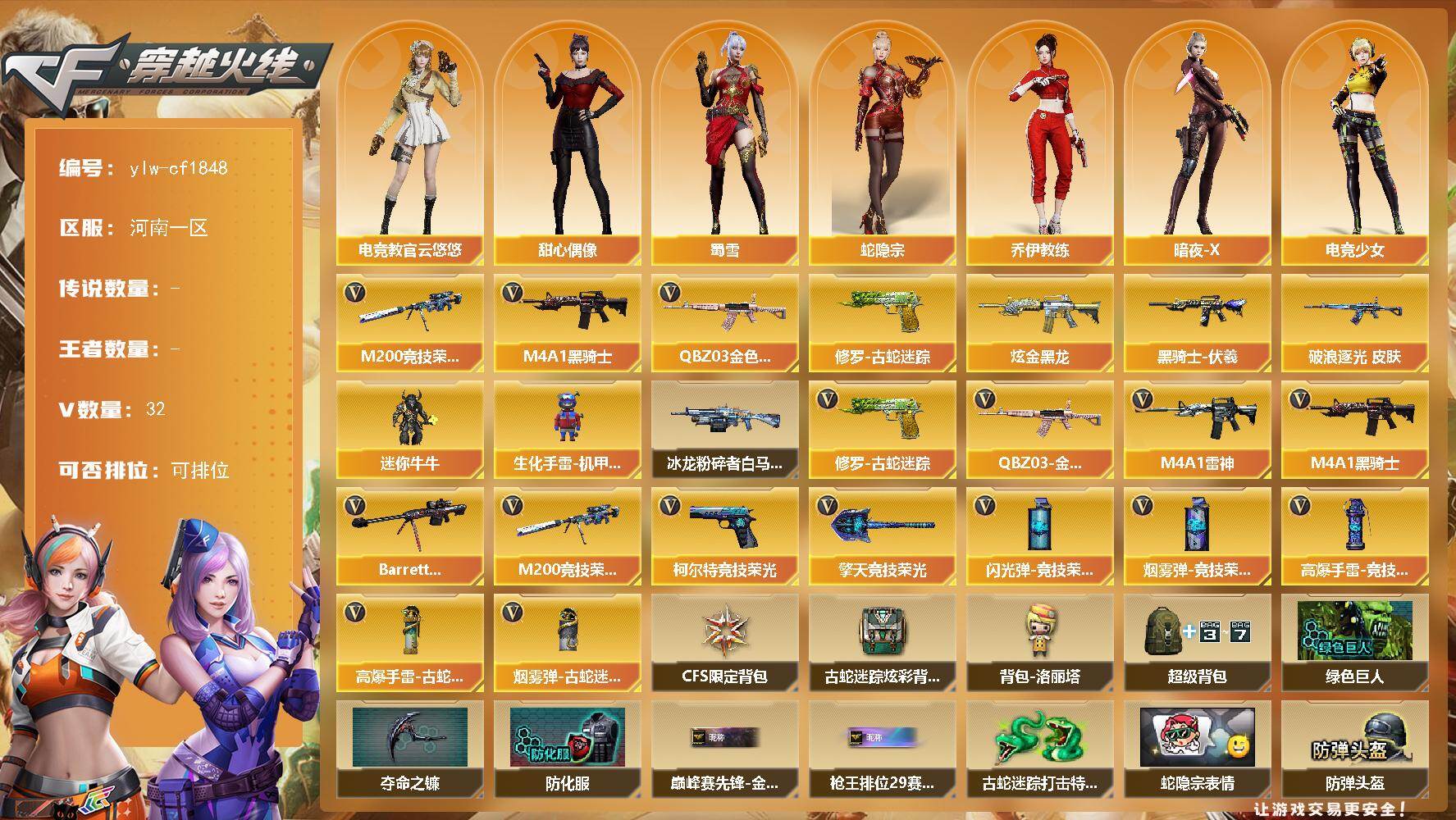 [16948309]河南一区-32V-0王者-1炫金 【热门武器】:QBZ03-金色蔷薇*2,修罗-古蛇迷踪,M200-竞技荣光,M4A1-黑骑士 【王者炫金武器】:炫金黑龙 【皮肤】:金色蔷薇-破浪逐光 皮肤,黑骑士-伏羲*2 【角色】:电竞教官-云悠悠,蛇隐宗,乔伊教练,暗夜-X,电竞少女,兰-新年限定,猎狐者-追月,0号玩家,曼陀罗-X,蛇姬,甜心偶像,蜀雪,兔囡囡,维纳斯,新娜塔莎,雪莉杨-摸金校尉 【人偶武器】:迷你牛牛,生化手雷-机甲核心*2 【挑战大师】:冰龙粉碎者-白马银枪 【英雄级武器】:M4A1-雷神*3,M4A1-黑骑士,QBZ03-金色蔷薇*2,Barrett-毁灭,M200-竞技荣光,柯尔特-竞技荣光*3,修罗-古蛇迷踪,擎天-竞技荣光*5,高爆手雷-竞技荣光*7,高爆手雷-古蛇迷踪,闪光弹-竞技荣光*7,烟雾弹-竞技荣光,烟雾弹-古蛇迷踪 【道具】:CFS限定背包,古蛇迷踪炫彩背包,背包-洛丽塔,超级背包,绿色巨人,夺命之镰,防化服*2,星辰流光-枪王排位,巅峰赛先锋-金色流光,枪王排位28赛季金色流光,枪王排位29赛季金色流光,古蛇迷踪打击特效,蛇隐宗表情,EP战队名片,EP战队喷图,EP战队击杀图标,防弹头盔*2,防弹衣*2,C4工具钳*2,手雷包*2 【特殊枪械】:1黑骑士